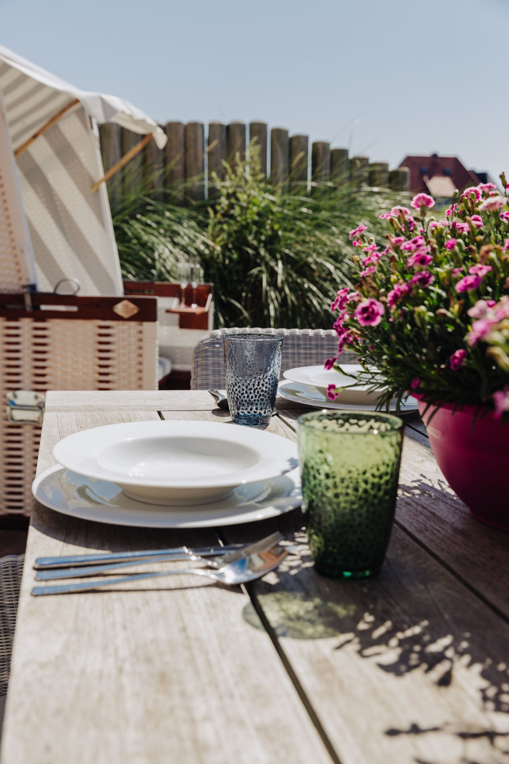 Genießen Sie sonnige Stunden auf Ihrer Südterrasse oder entspannen Sie im idyllischen Garten mit Gartenmöbeln und einem privaten Strandkorb.