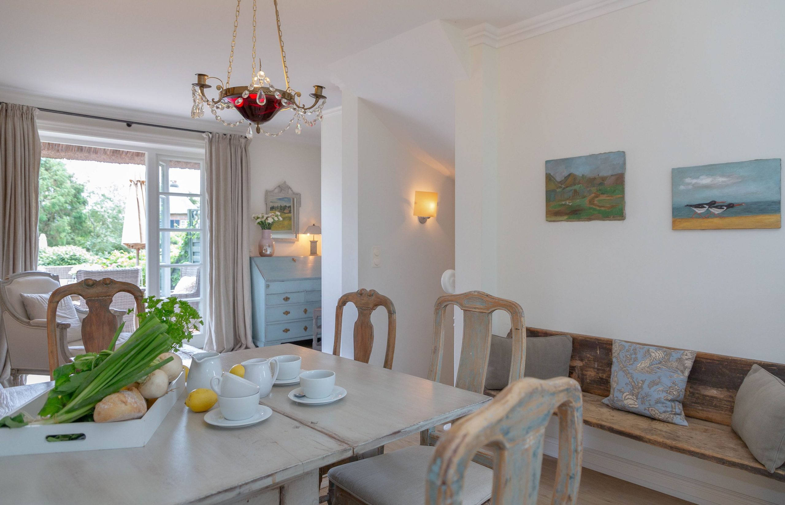Die weiß gestrichenen alten Holzbalken sowie der gelungene Mix mit Antiquitäten schaffen auf Anhieb eine heimelige Atmosphäre.