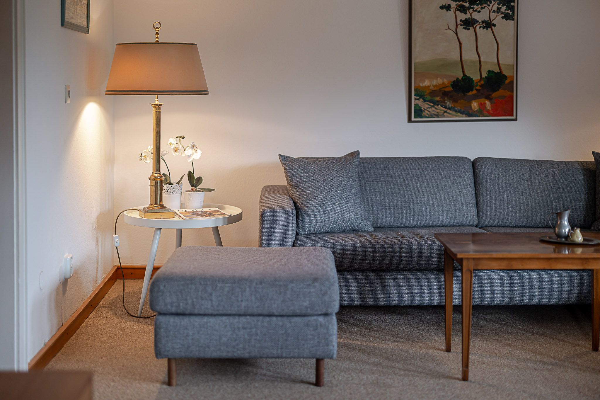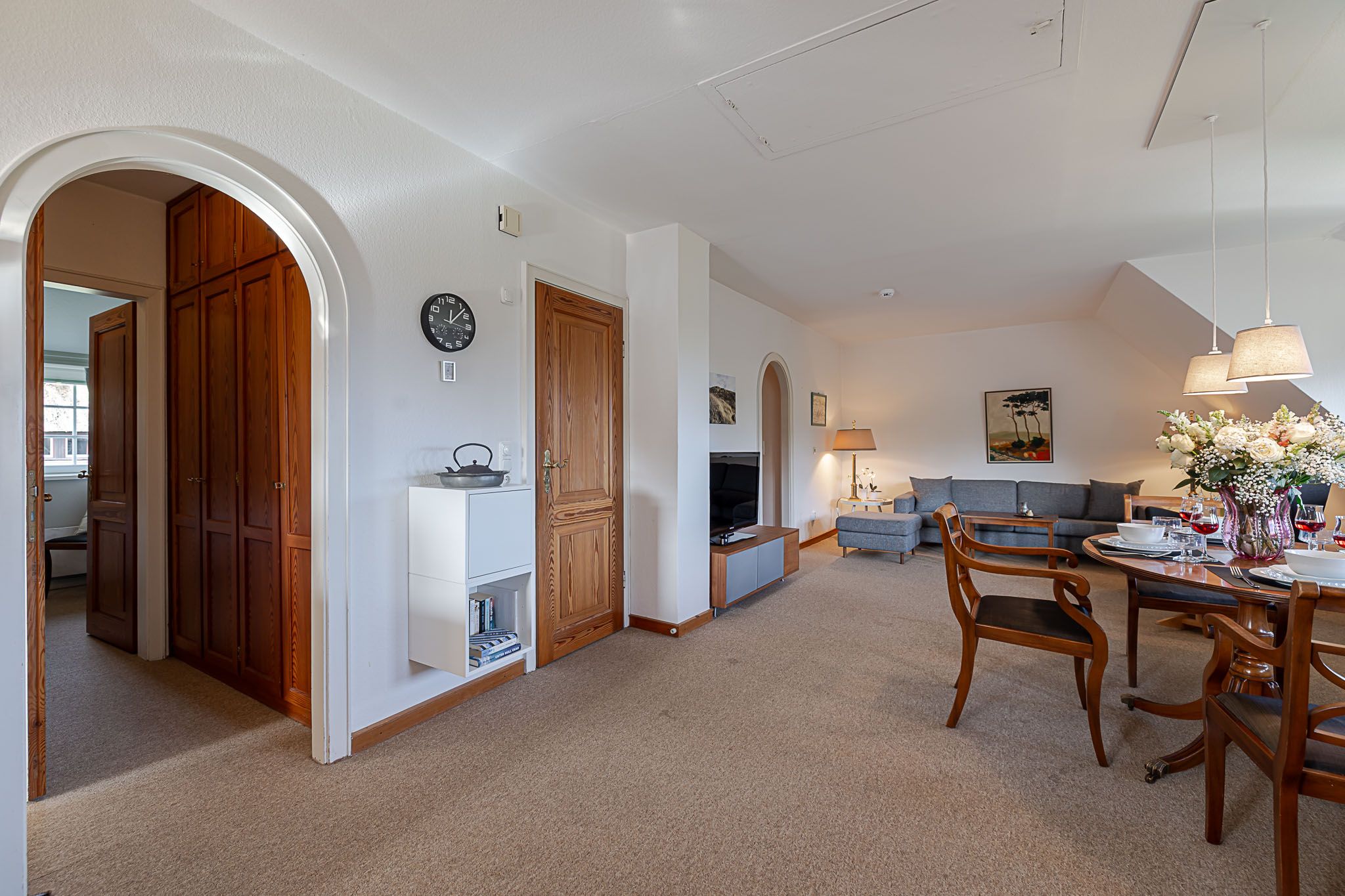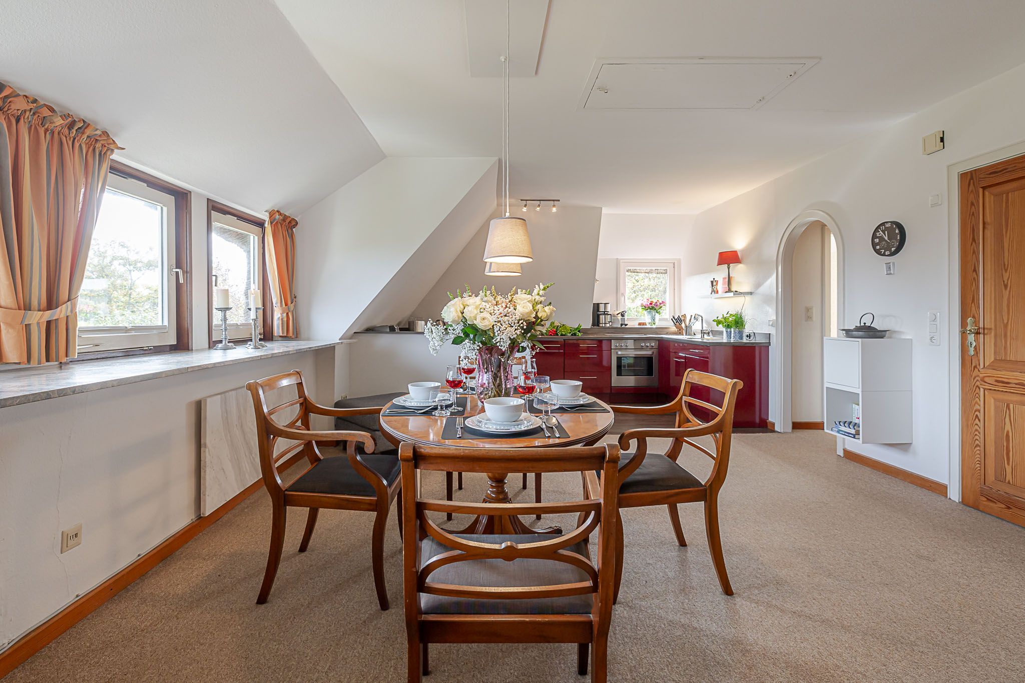 Das Herzstück der Wohnung ist der große Wohn- und Essbereich, der mit seiner Fensterfront den Blick über Reetdächer hinweg bis zum Wattenmeer freigibt. Hier trifft nordische Schlichtheit auf wohnliche Eleganz – gemütliche Sofas, warme Lichtstimmung und viel Platz für gemeinsame Stunden. Der angrenzende Essplatz lädt zu langen Frühstücken oder geselligen Abenden ein, während die offene Küche mit modernen Geräten (Backofen, Spülmaschine, Nespresso- und Filtermaschine) alles bietet, was man für den Urlaub braucht.