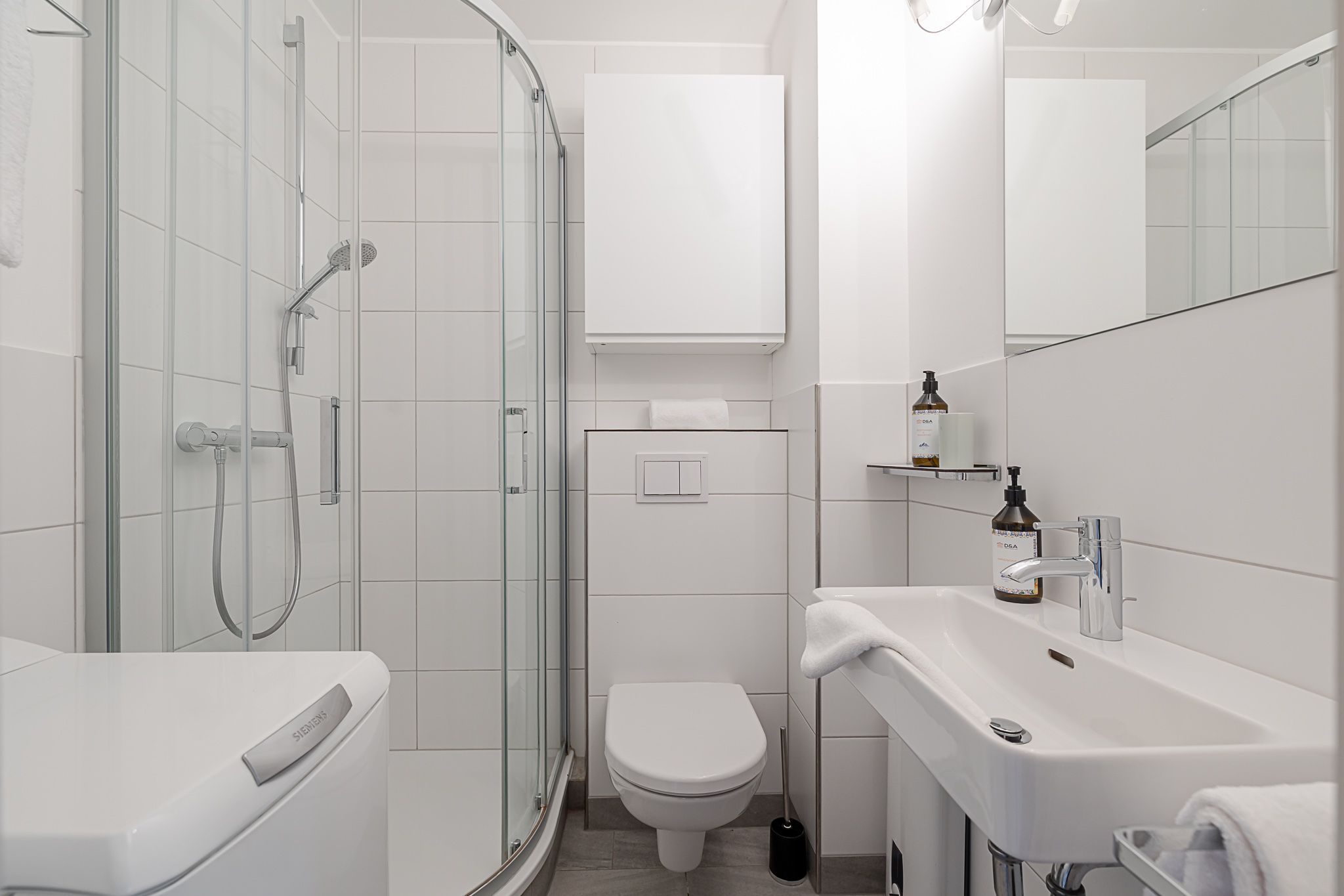 Das erste Badezimmer präsentiert sich hell und modernisiert, mit einer großzügigen Dusche und klaren Linien. Es verfügt zwar über kein Fenster, wirkt durch die helle Gestaltung und die stimmige Beleuchtung jedoch freundlich und einladend – perfekt für den Start in den Tag.