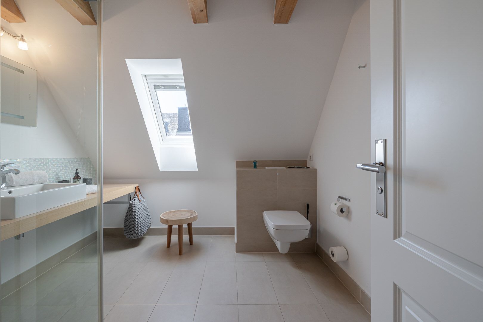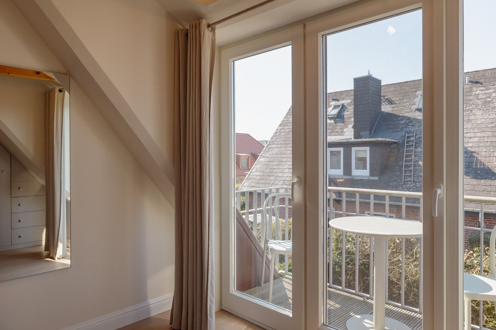 Im Obergeschoss befindet sich ein großes Schlafzimmer mit einem kleinen Balkon, auf dem Sie den Abend ausklingen lassen können. Sie nächtigen im komfortablen Boxspringbett und finden großzügigen Stauraum in massiven Einbauten vor. Das Badezimmer verfügt über eine bodentiefe Dusche. Über eine Treppe erreichen Sie ein weiteres kleines Schlafzimmer im Spitzboden. Hier befinden sich zwei bodennahe Einzelbetten, sodass sich das Domizil auch sehr gut für den Urlaub mit Kindern eignet. Hier ist behagliches Einschlafen mit Blick durch ein großes Bullaugenfenster garantiert.