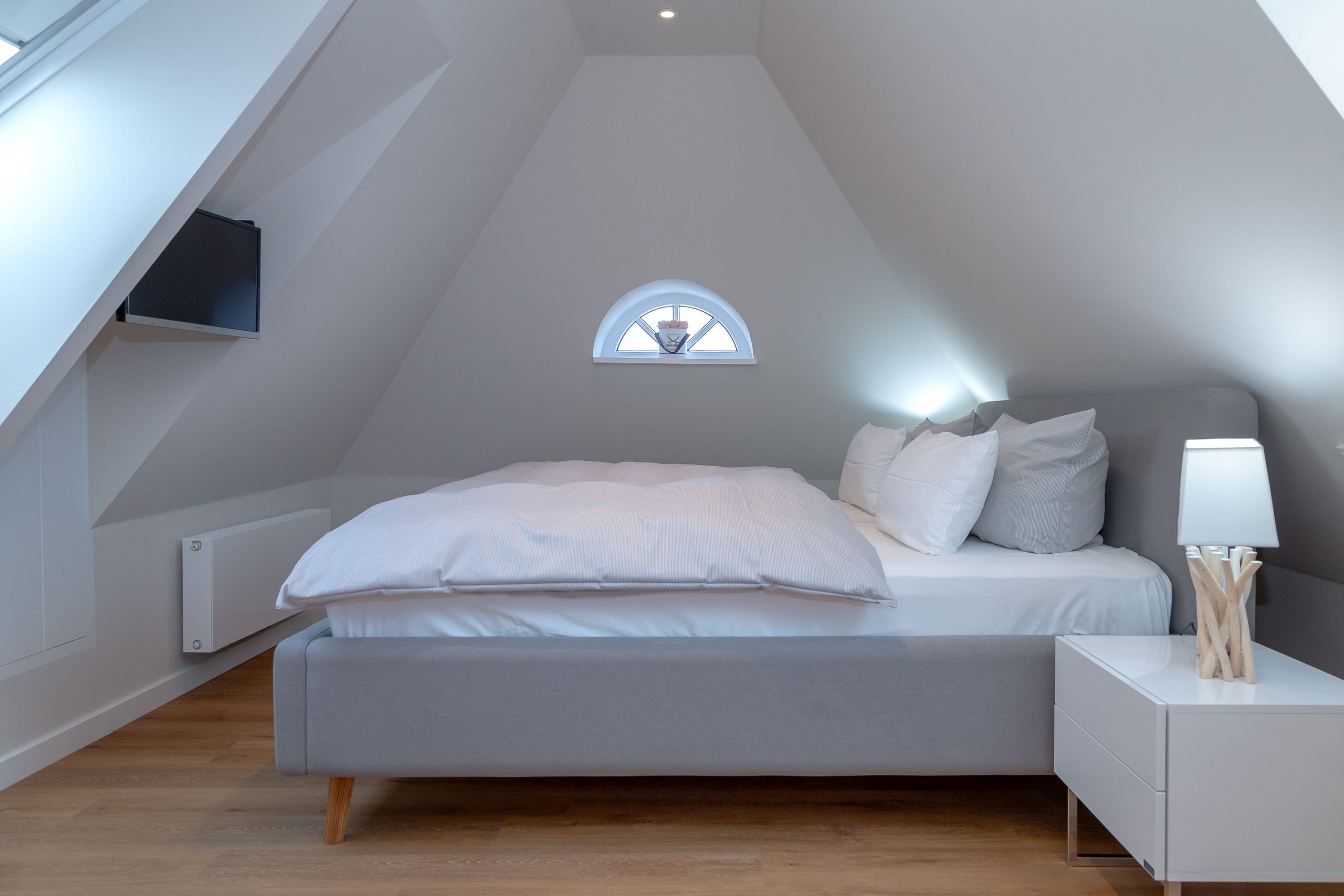 Das Schlafzimmer, welches über eine steile Treppe in das Dachgeschoss erreicht wird, bietet ein gemütliches Boxspringbett sowie großzügige maßgeschneiderte Einbauschränke, die ausreichend Stauraum bieten. Zudem steht Ihnen ein Tresor für Ihre Wertsachen zur Verfügung.