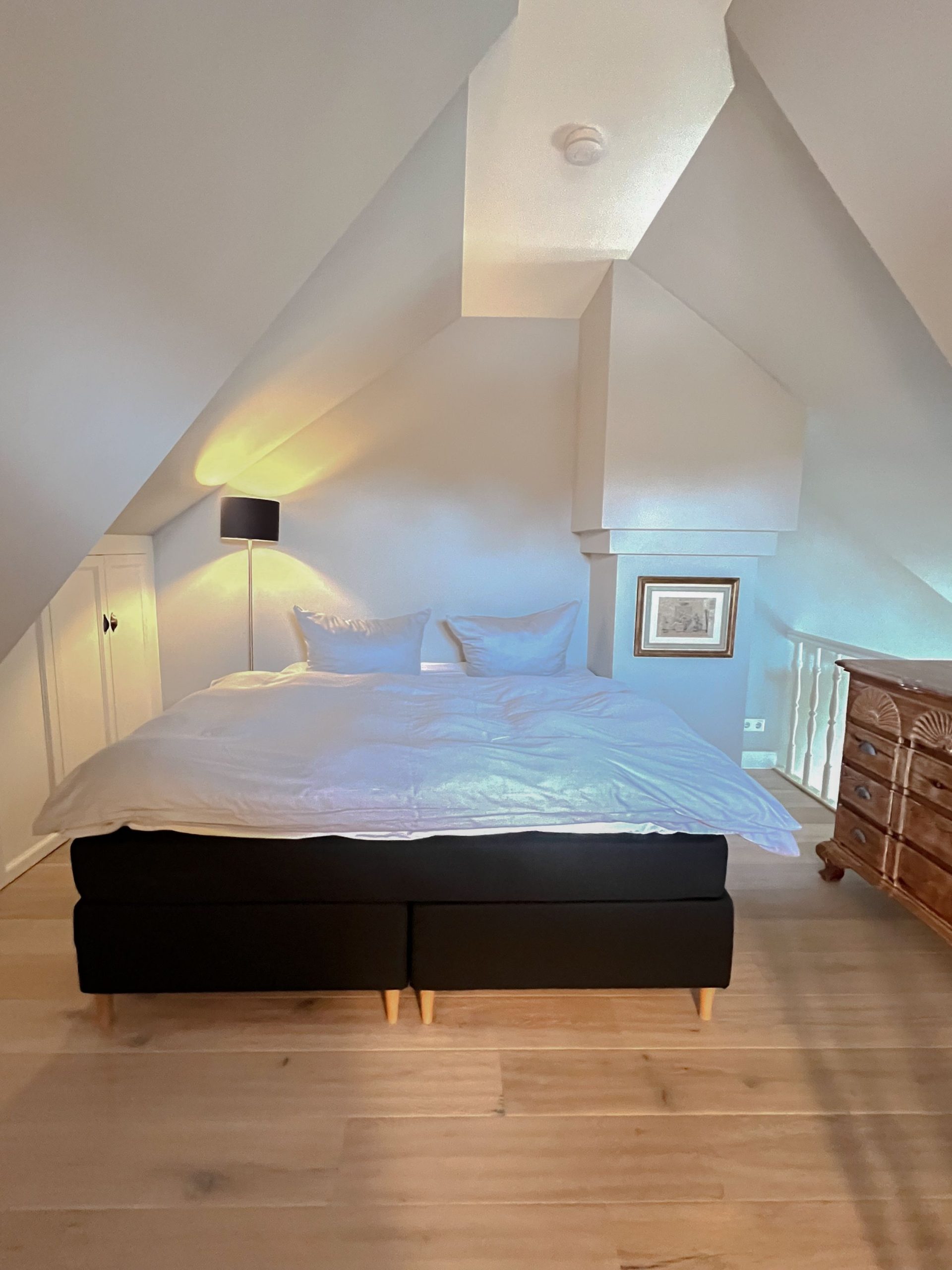 Im komfortablen Schlafzimmer mit hochwertigem Boxspringbett finden Sie erholsame Nachtruhe, während das stilvolle Badezimmer mit bodengleicher Dusche für entspannende Wohlfühlmomente sorgt.