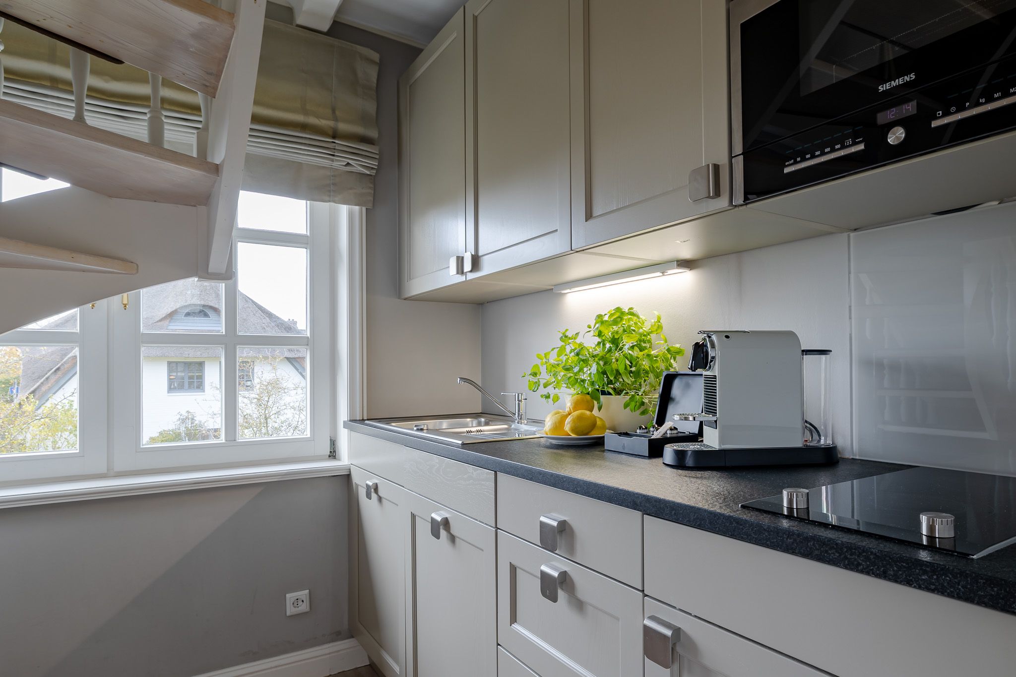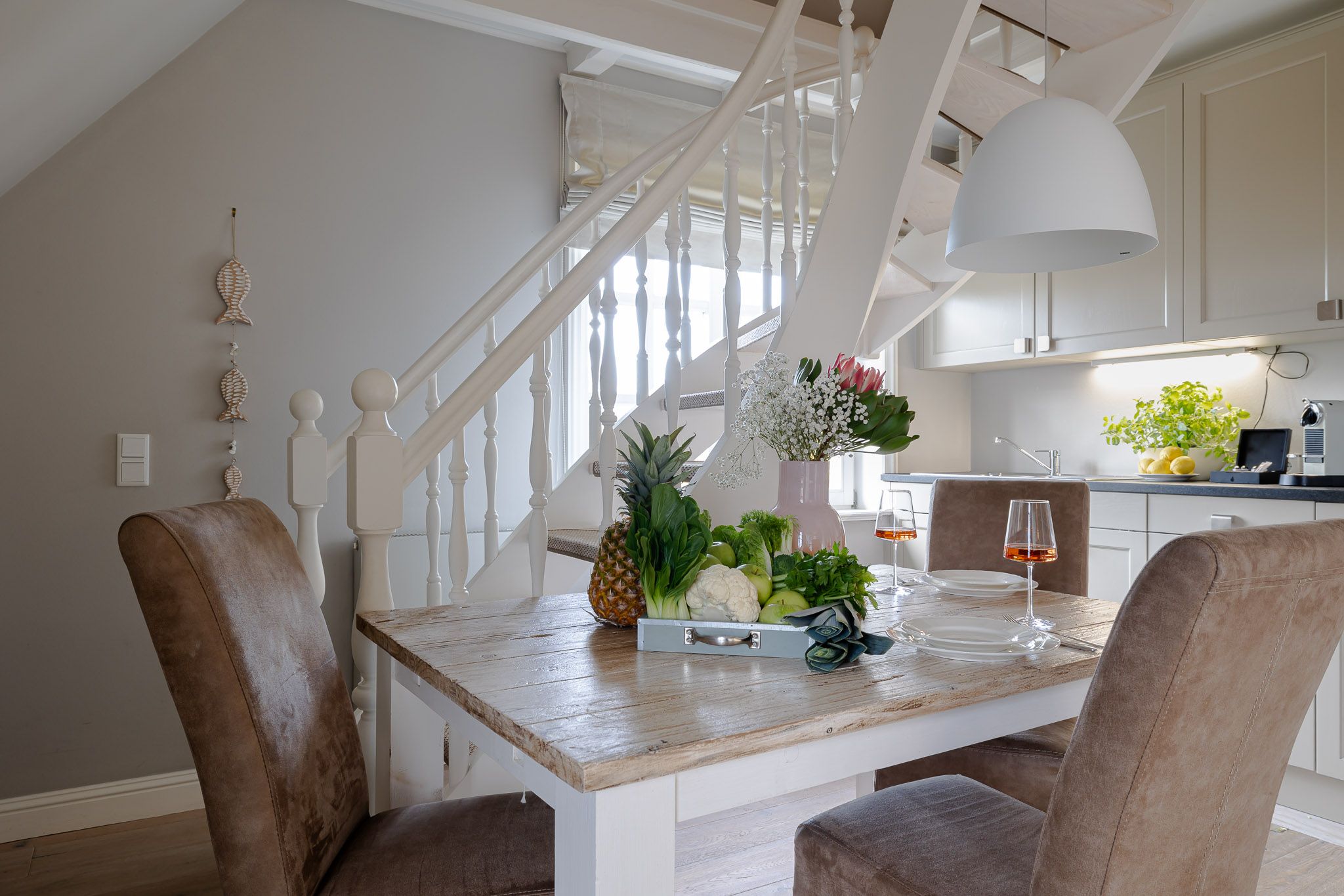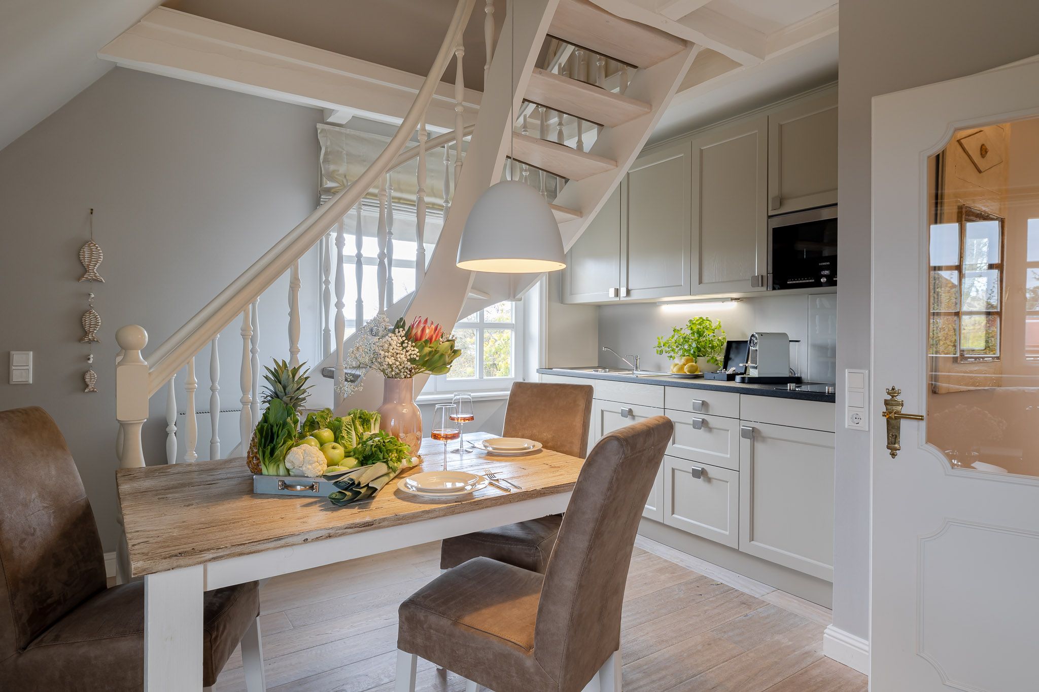 Die Wohnung beeindruckt mit ihrem eleganten und gleichzeitig verspielten Ambiente. Der großzügige Wohnbereich mit ausziehbarem Schlafsofa und gemütlichem Essplatz bildet das Herzstück der Wohnung. In der hellen, voll ausgestatteten Küche inklusive Filterkaffeemaschine macht das Kochen Spaß und wird zum gemeinsamen Genuss.
