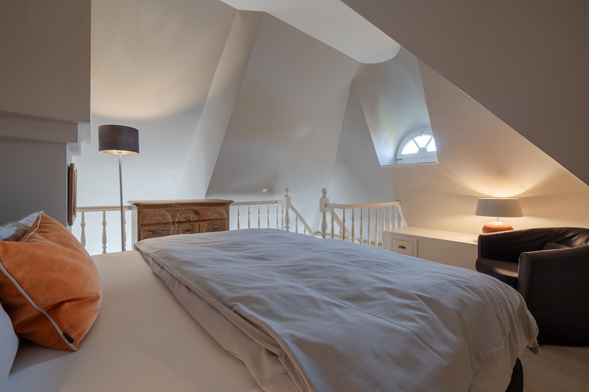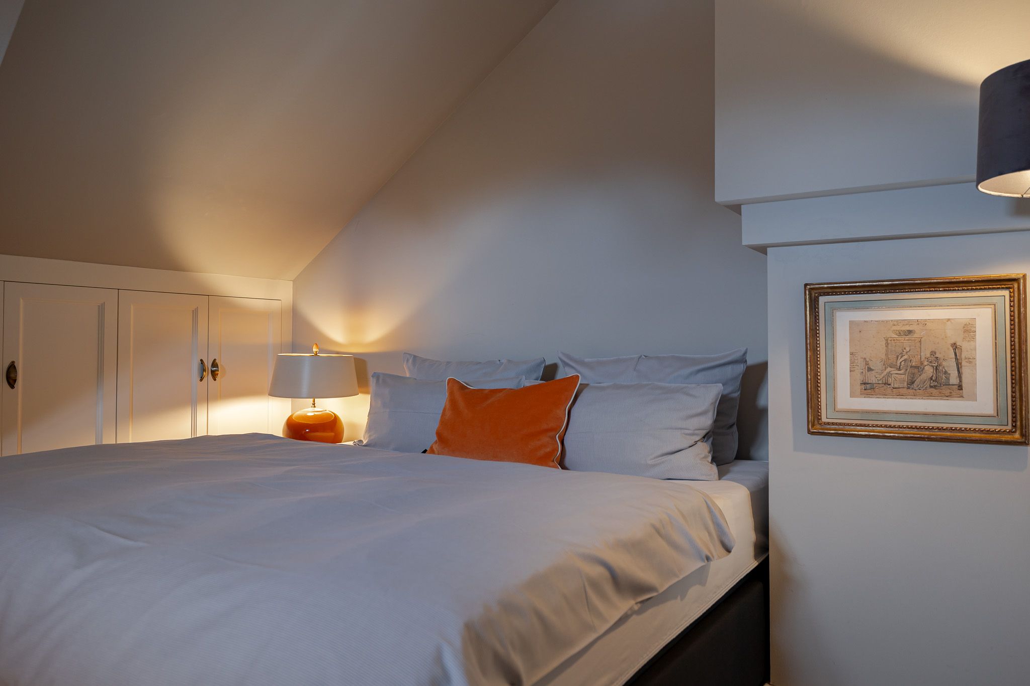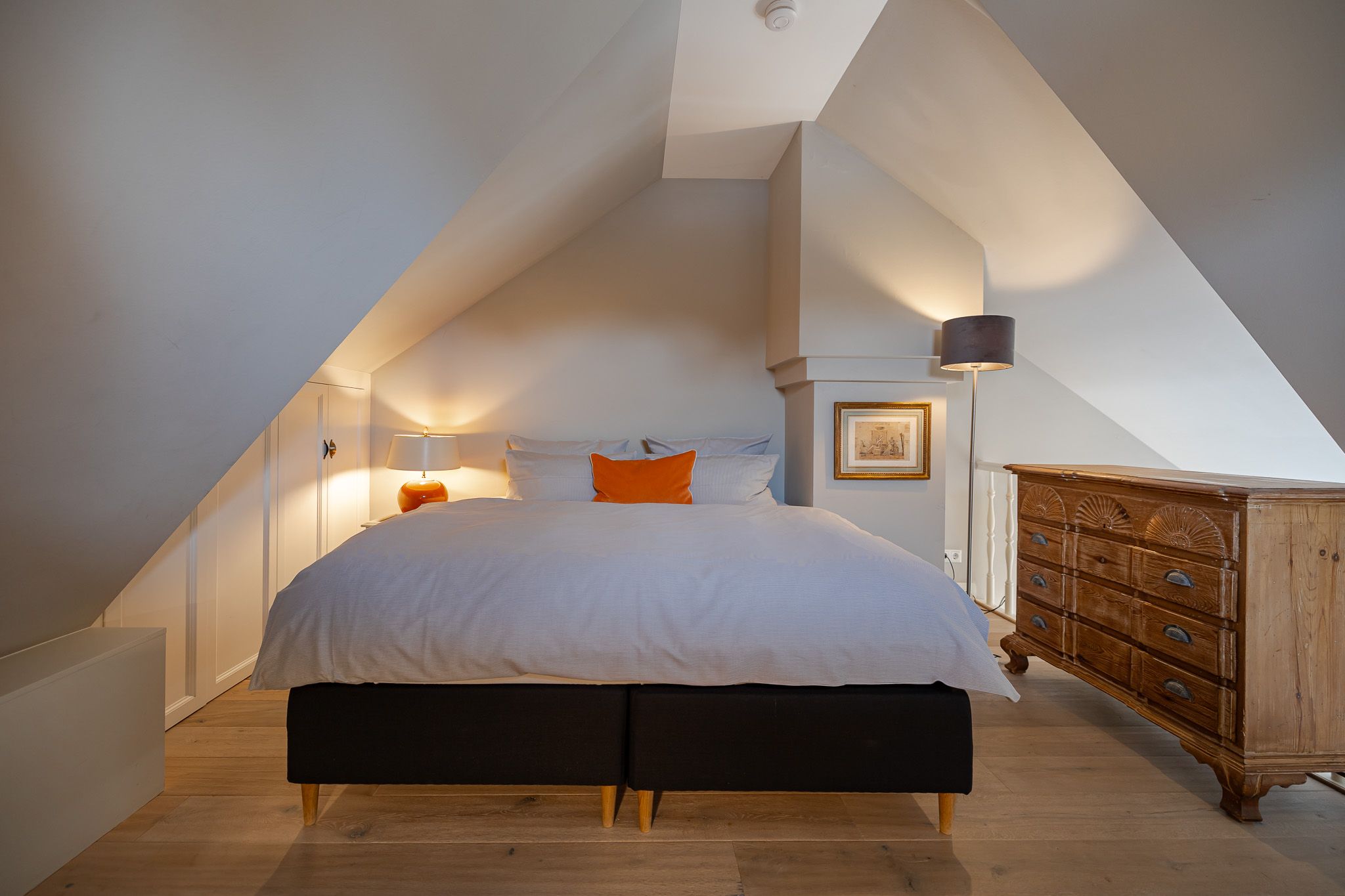 Im komfortablen Schlafzimmer mit hochwertigem Boxspringbett finden Sie erholsame Nachtruhe, während das stilvolle Badezimmer mit bodengleicher Dusche für entspannende Wohlfühlmomente sorgt.