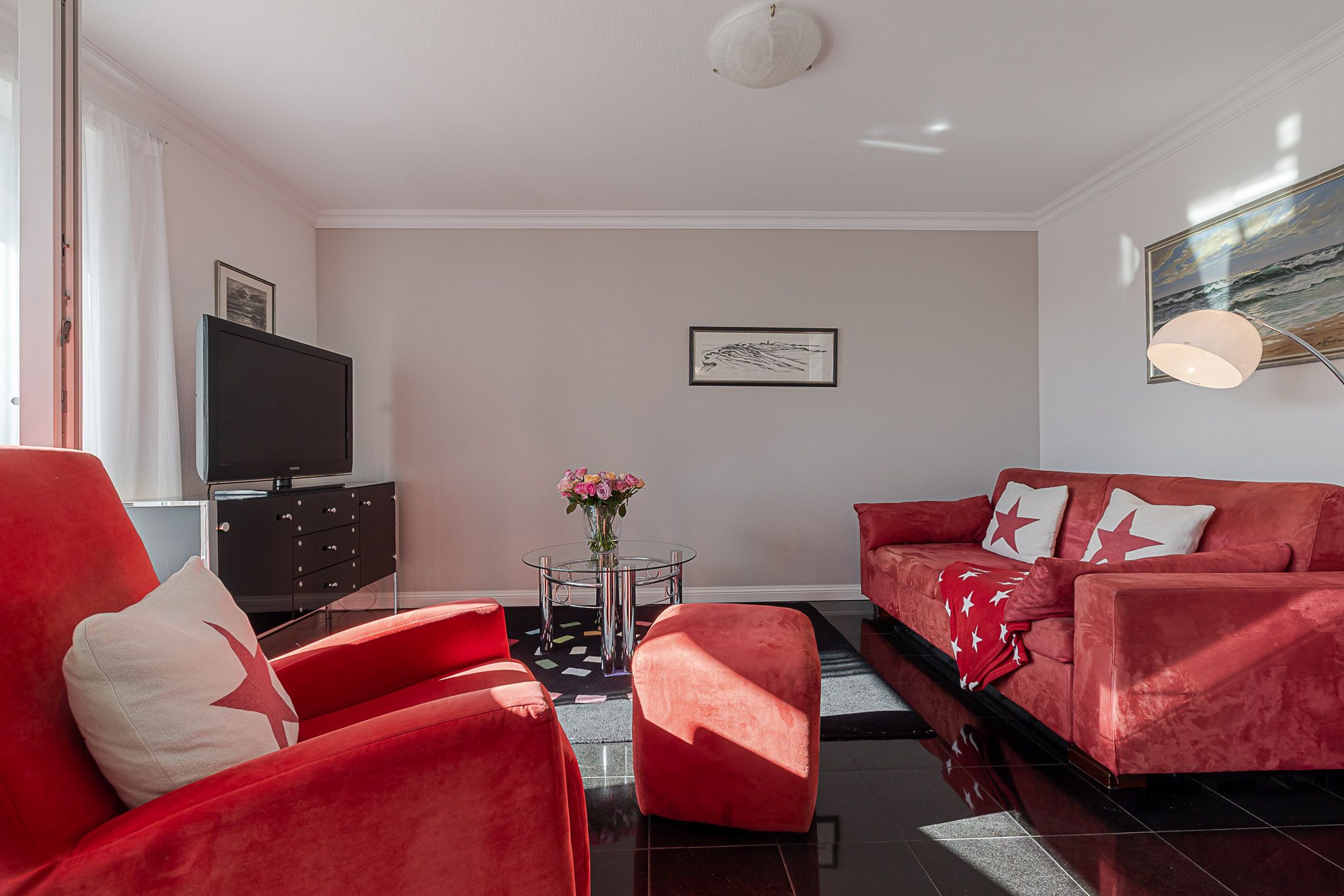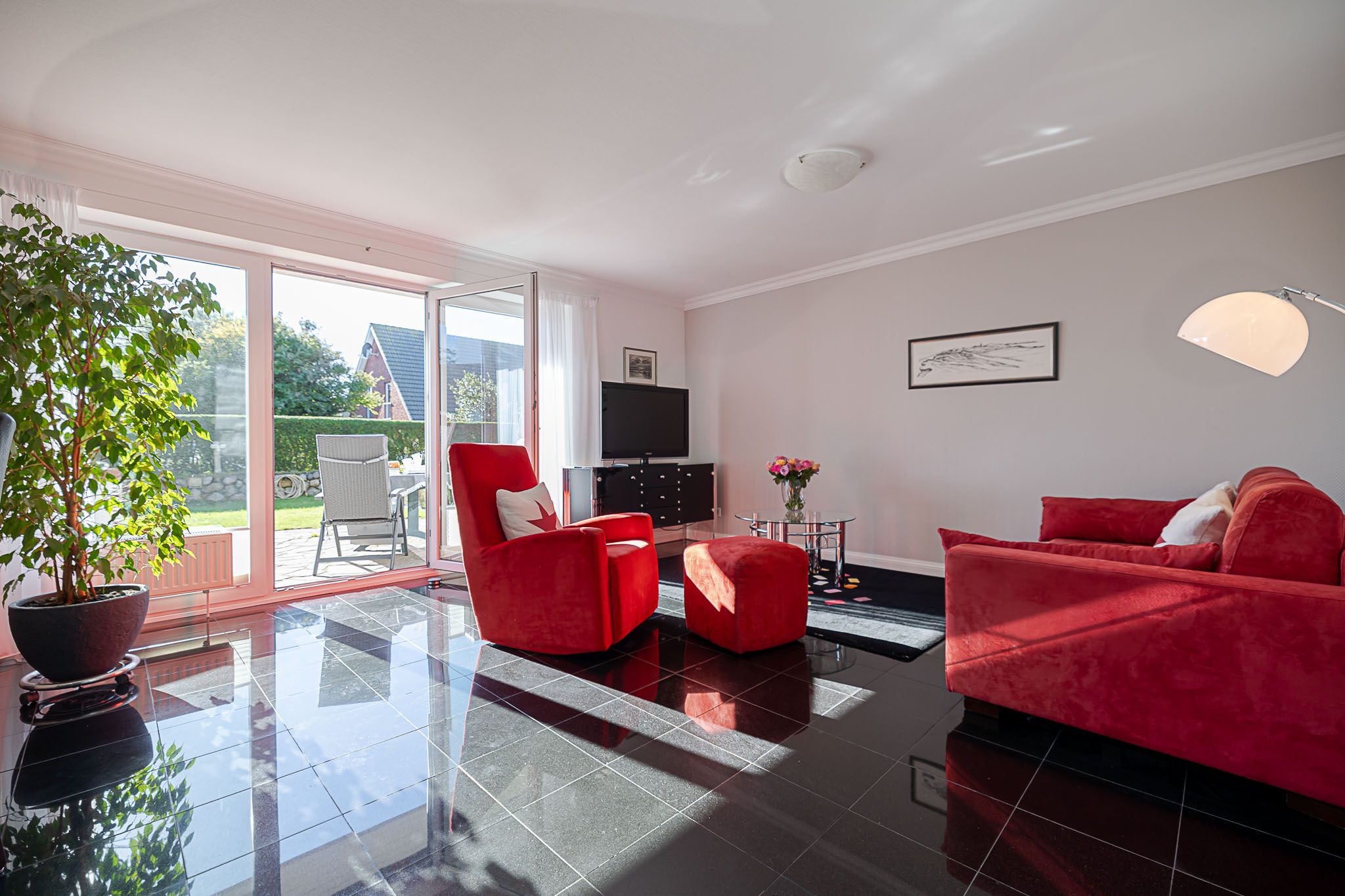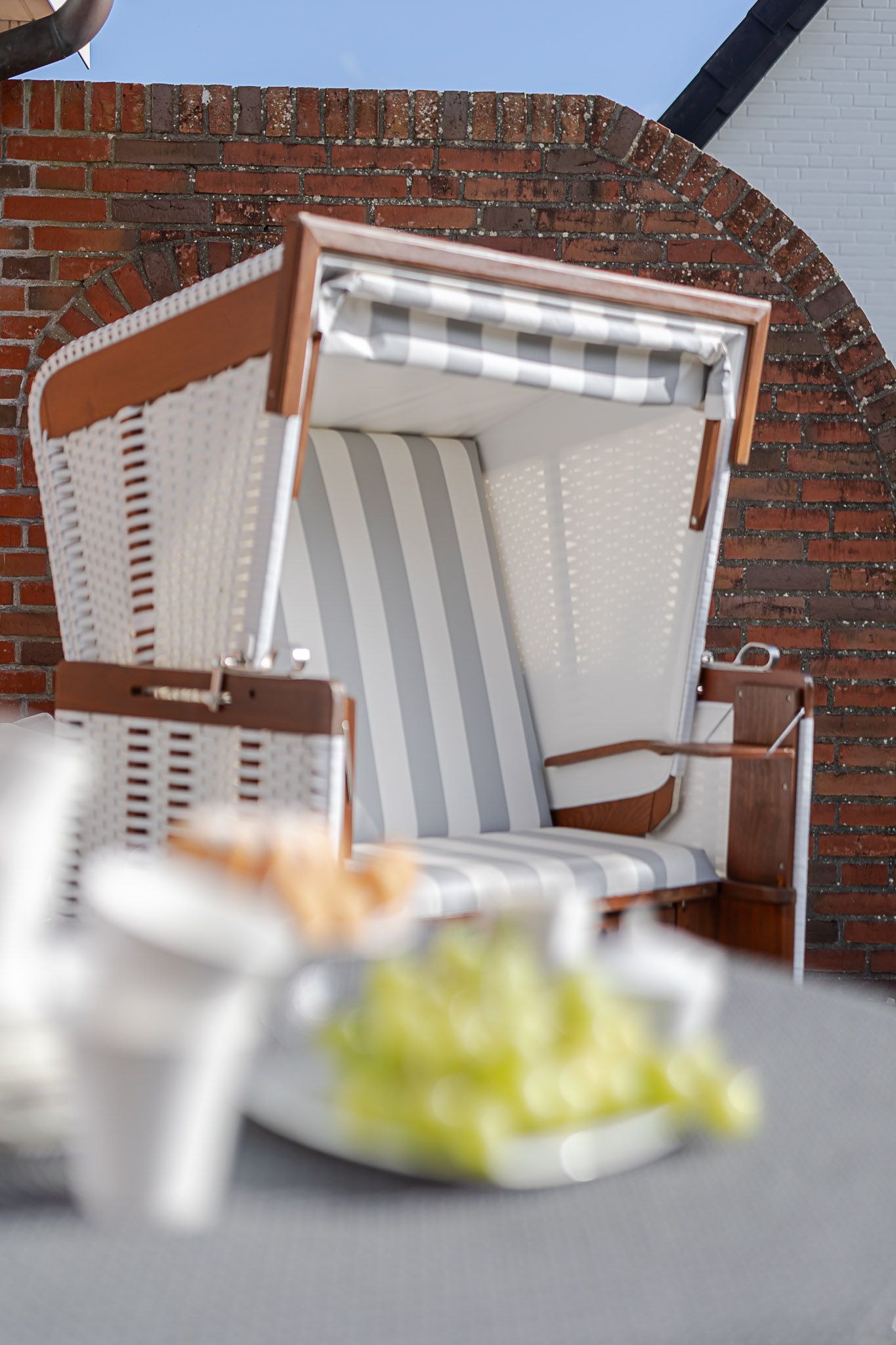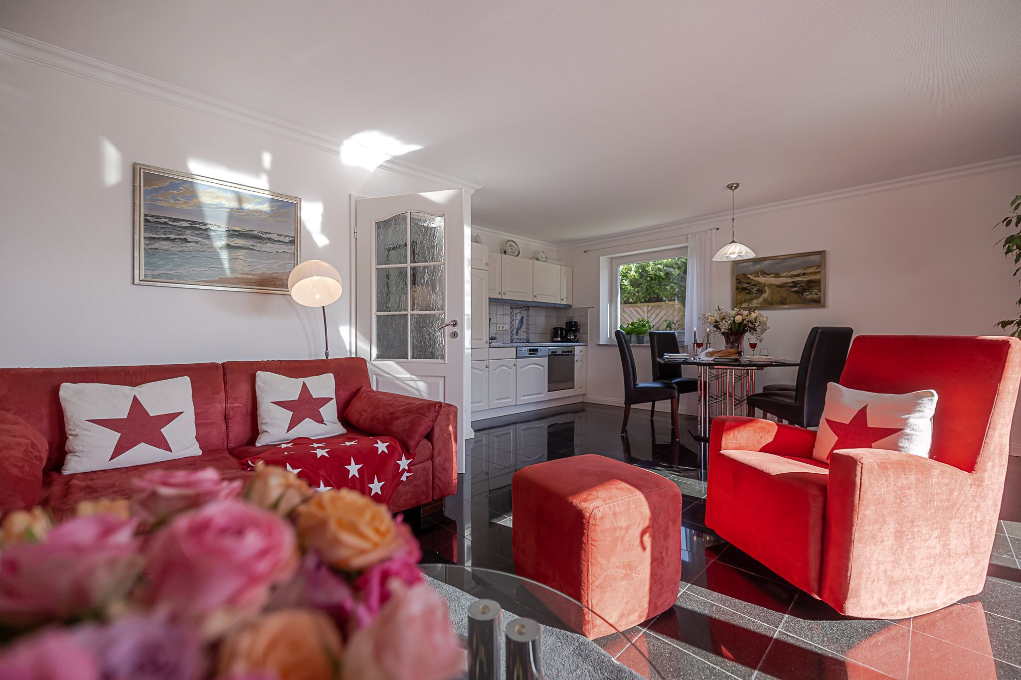 Das Wohnzimmer lädt zum Entspannen ein und ist mit Kabel-TV sowie einer Musikanlage ausgestattet. Zusätzlich bietet die Schlafcouch im Wohnbereich eine flexible Übernachtungsmöglichkeit. Ein besonderes Highlight ist die sonnige Südterrasse mit Möbeln und eigenem Strandkorb – der perfekte Ort, um die Nordseeluft zu genießen oder den Tag entspannt ausklingen zu lassen.