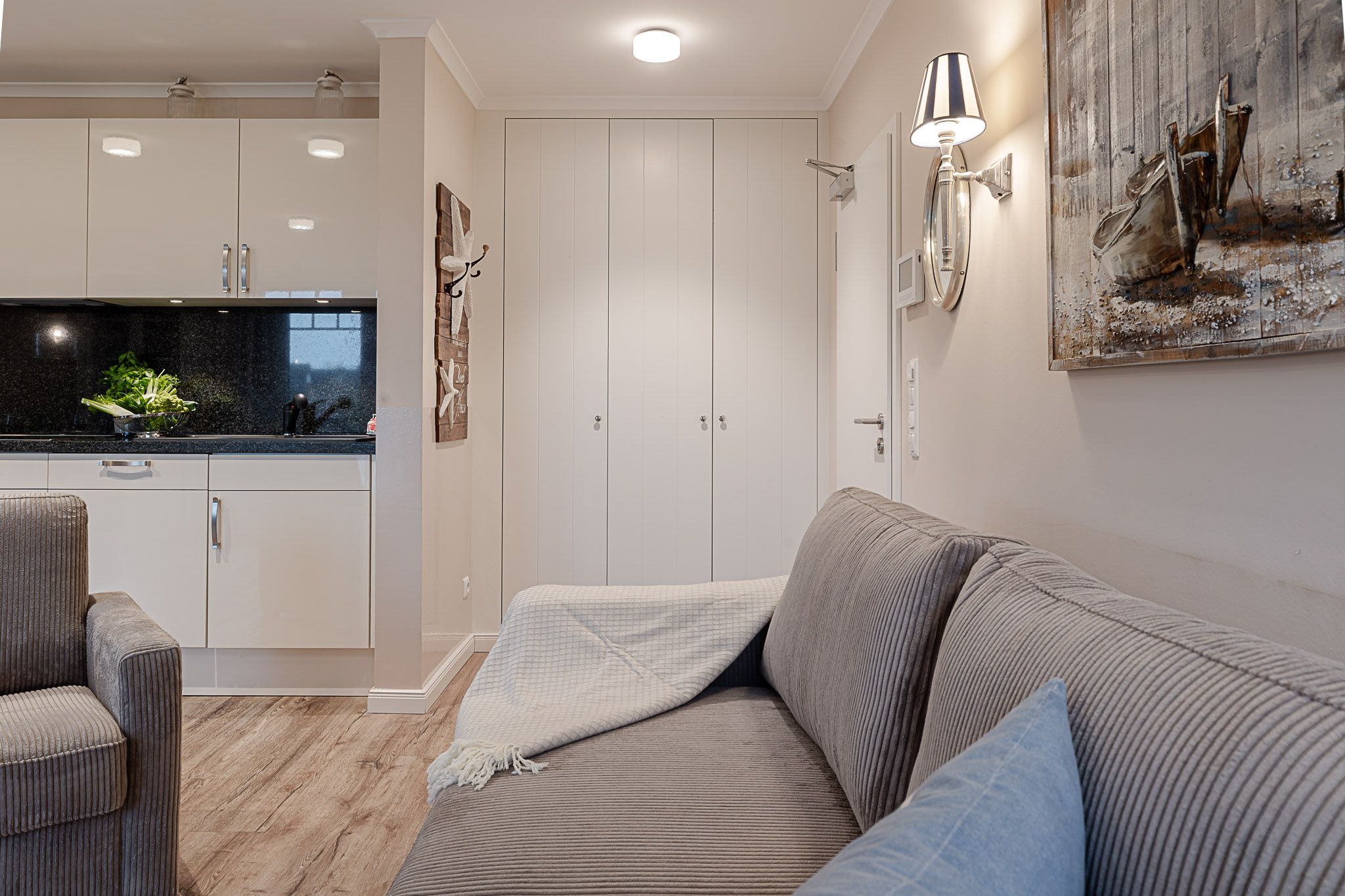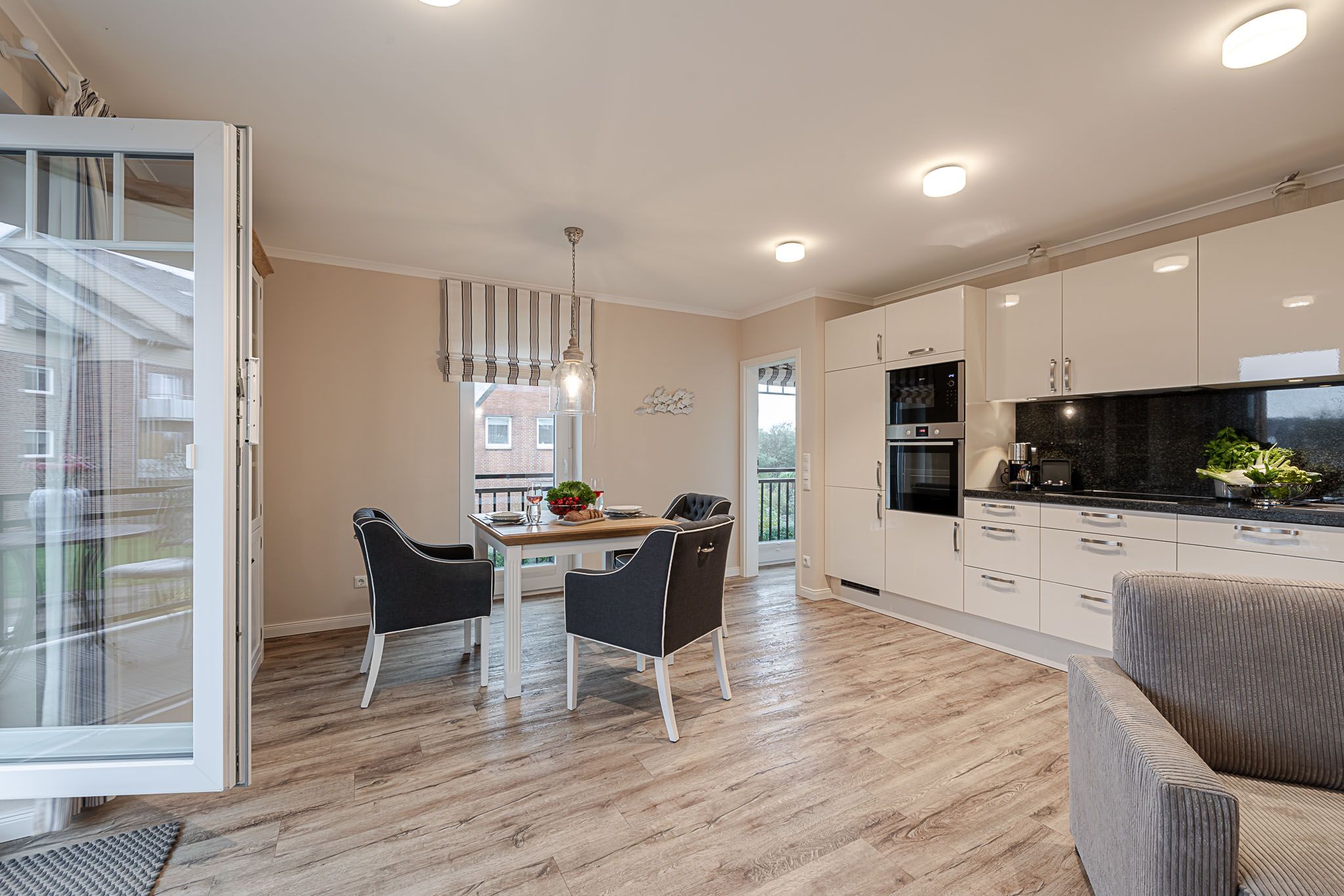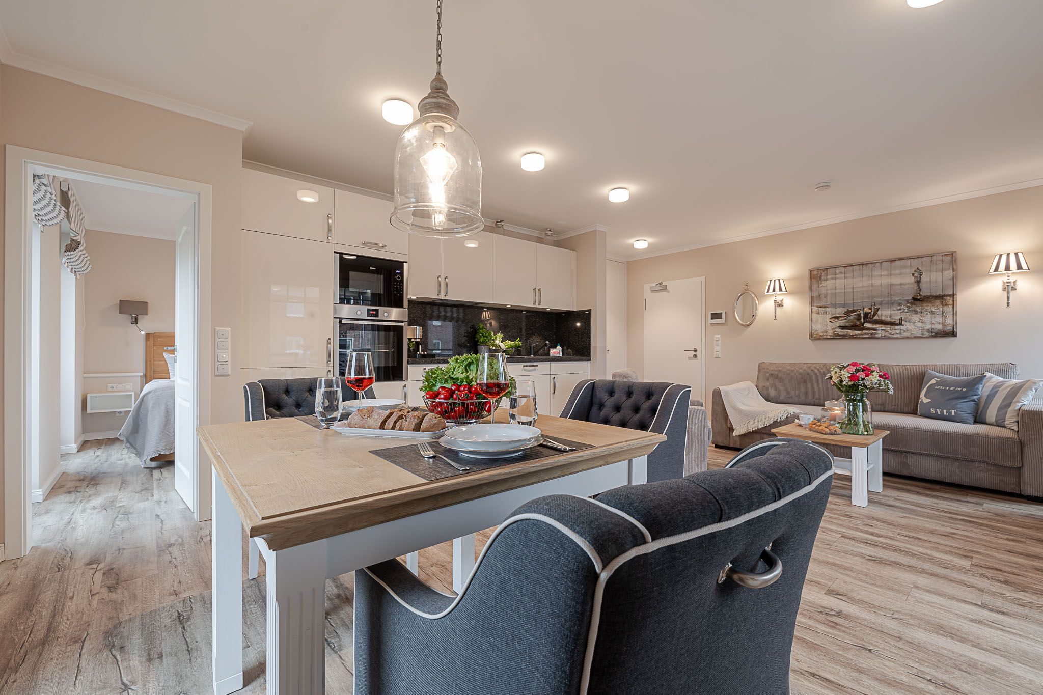 Die barrierefreie 51 m² große Ferienwohnungerwohnung ist bequem per Aufzug erreichbar und bietet Platz für bis zu 3 Personen. Neben einem separaten Schlafzimmer überzeugt der lichtdurchflutete Wohn-Essbereich mit stilvollem Interieur und einem komfortablen Schlafsofa. Die moderne Küche ist voll ausgestattet und lädt zum gemeinsamen Kochen ein.