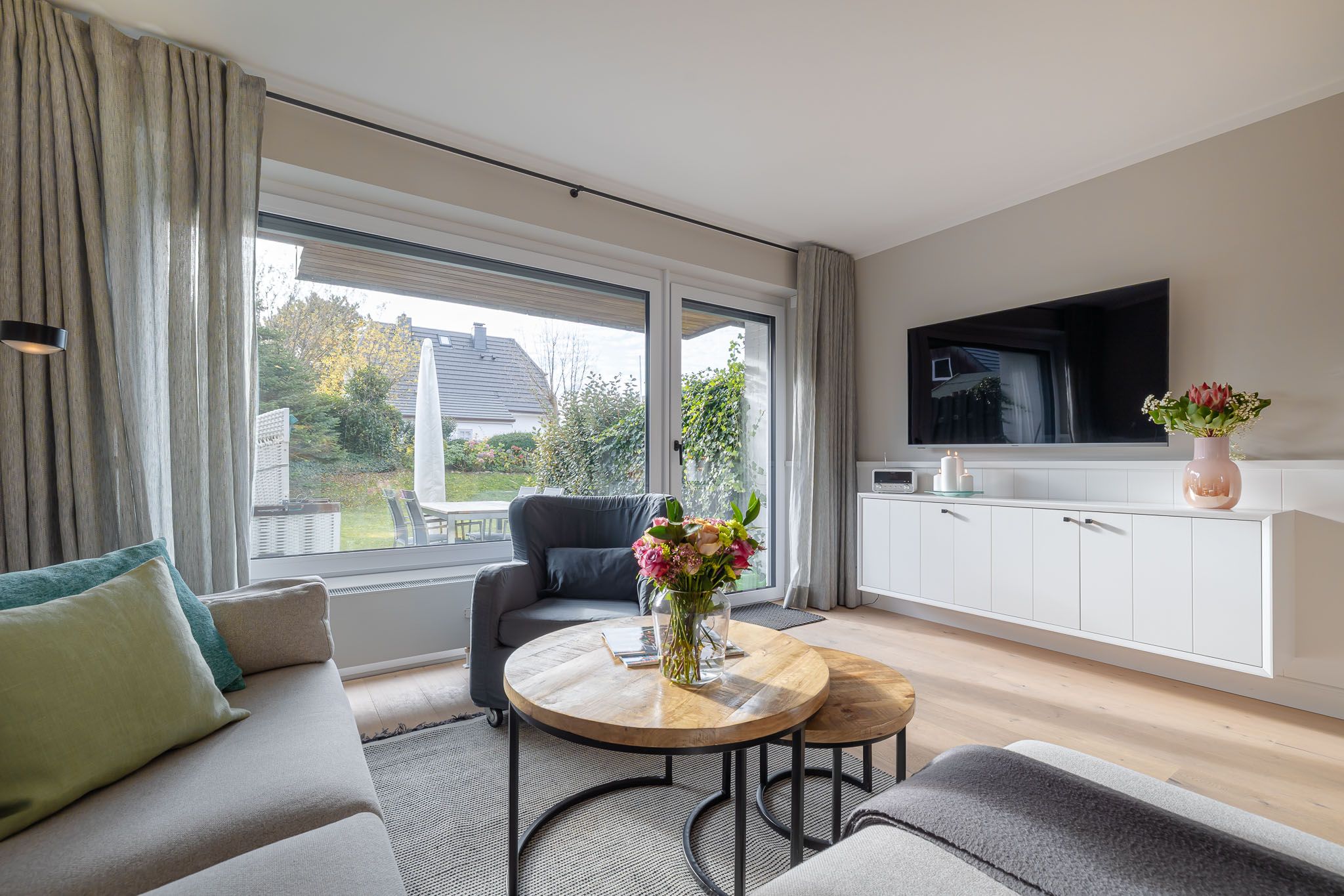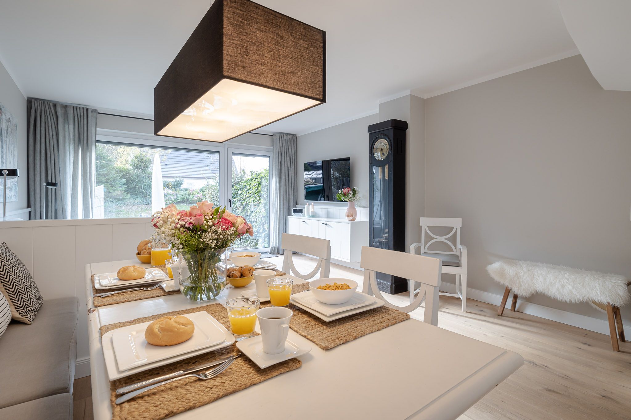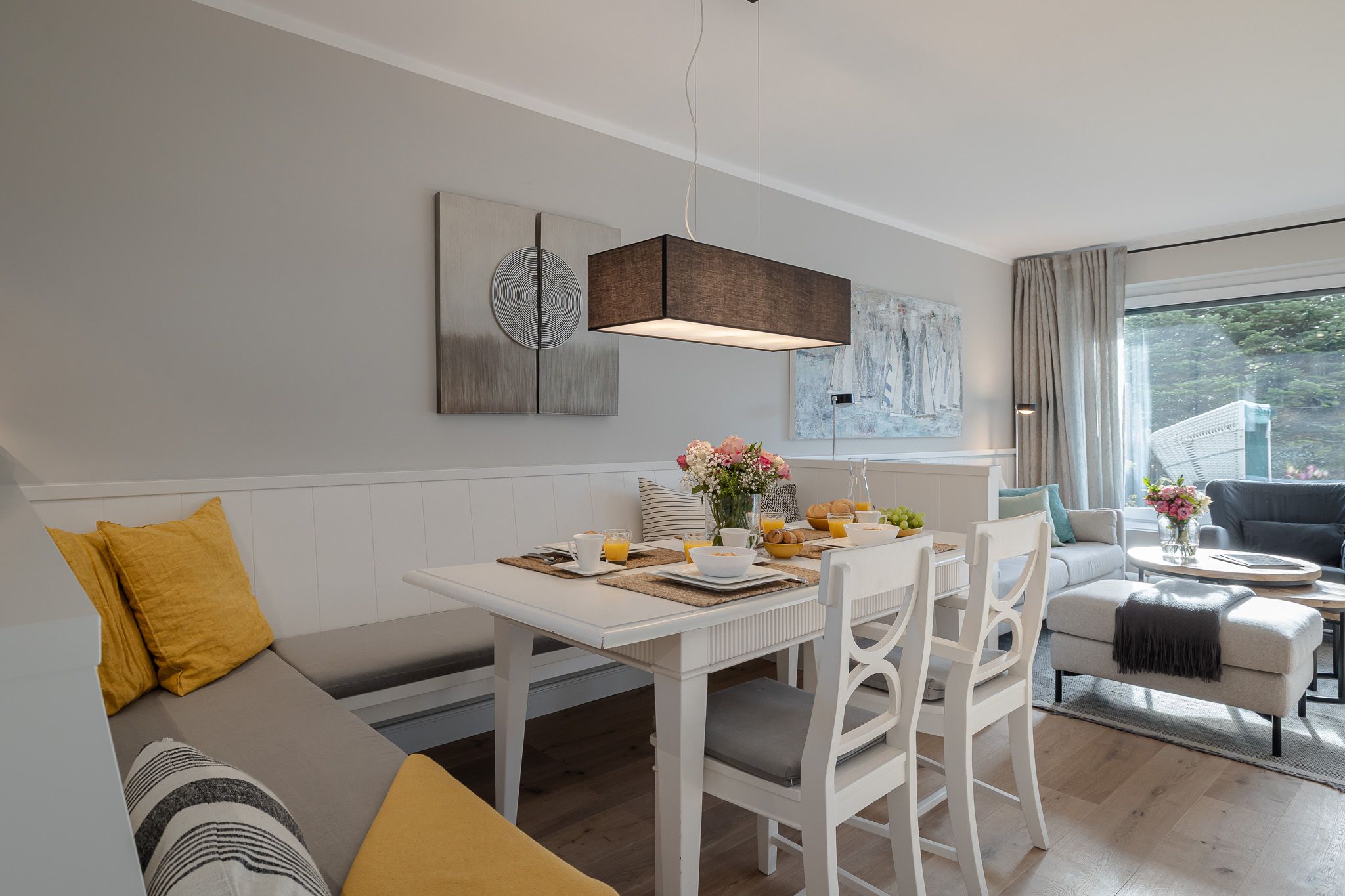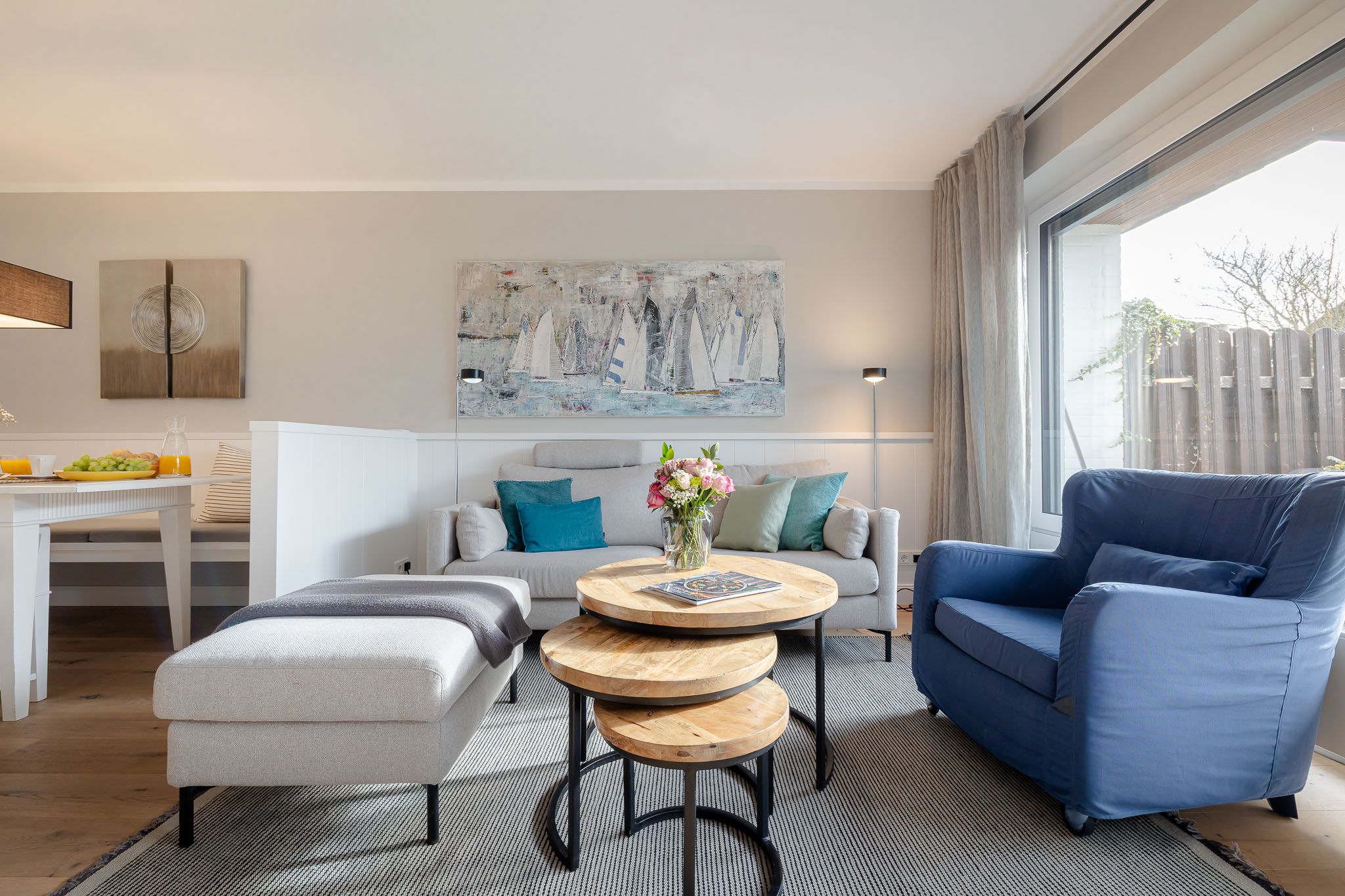 Das Herzstück bildet der lichtdurchflutete Wohnraum, der mit seiner großen Fensterfront den Blick auf die windgeschützte Süd-Terrasse freigibt, welche von morgens bis abends in der Sonne liegt. Der originale Sylter Strandkorb lädt an kühlen Tagen zum Sonnenbad ein.