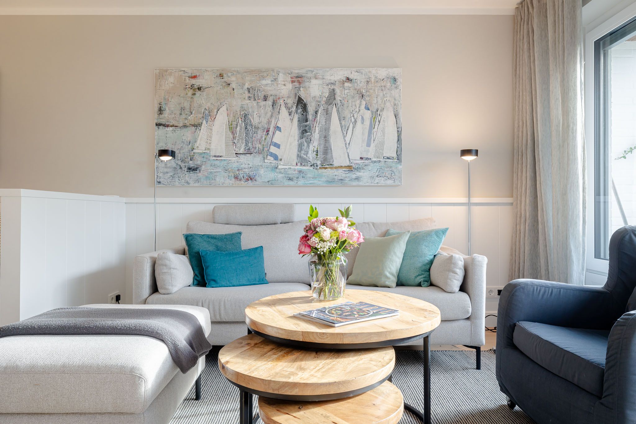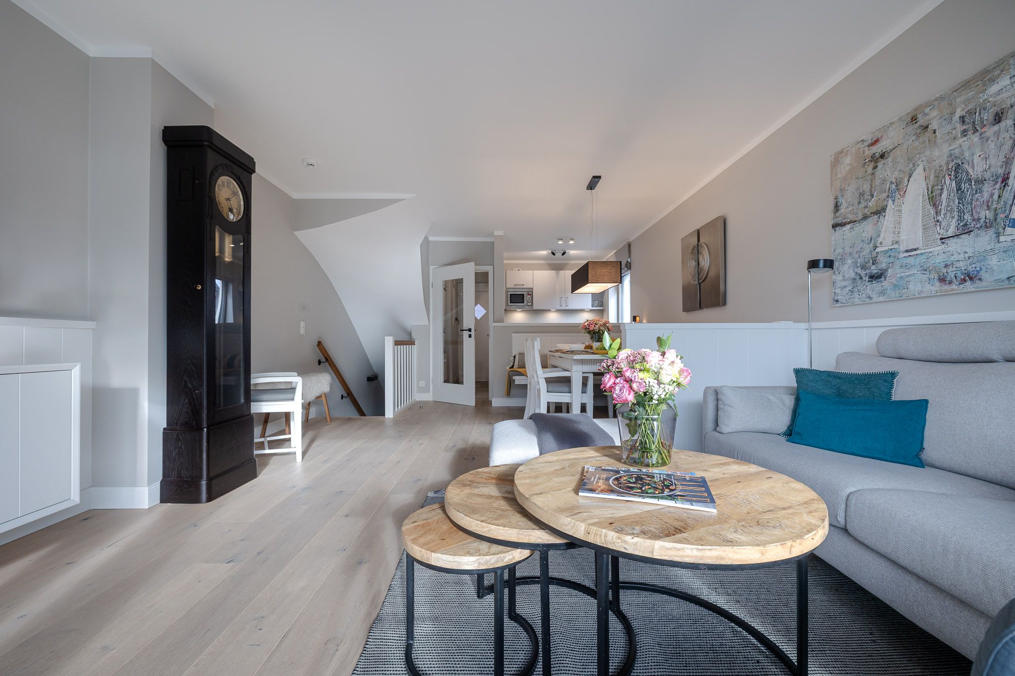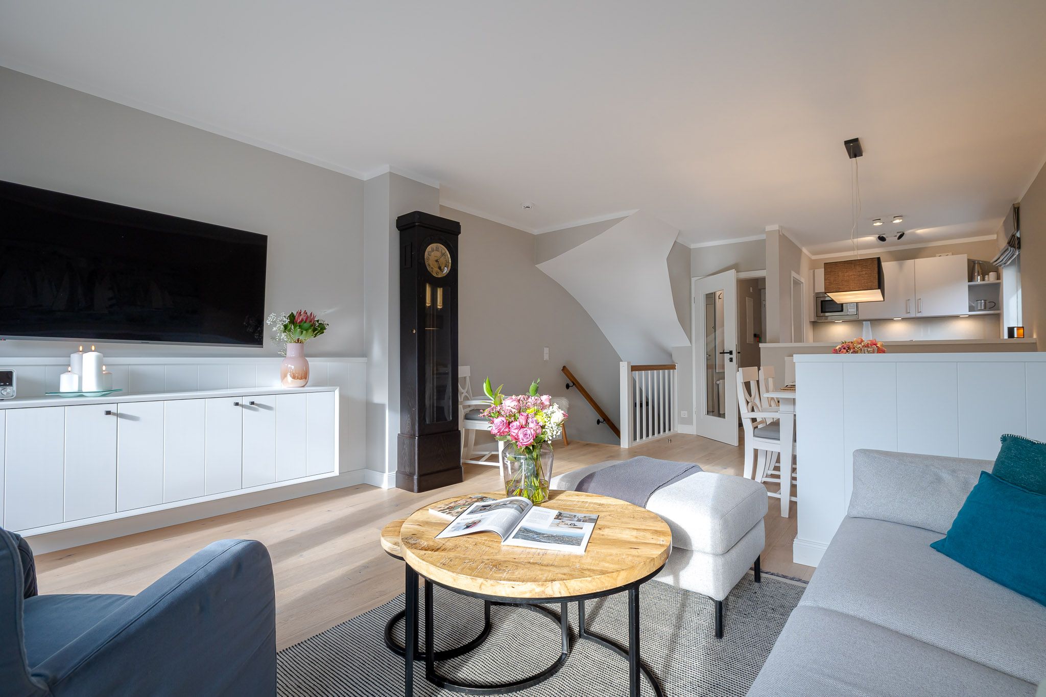 Das Herzstück bildet der lichtdurchflutete Wohnraum, der mit seiner großen Fensterfront den Blick auf die windgeschützte Süd-Terrasse freigibt, welche von morgens bis abends in der Sonne liegt. Der originale Sylter Strandkorb lädt an kühlen Tagen zum Sonnenbad ein.