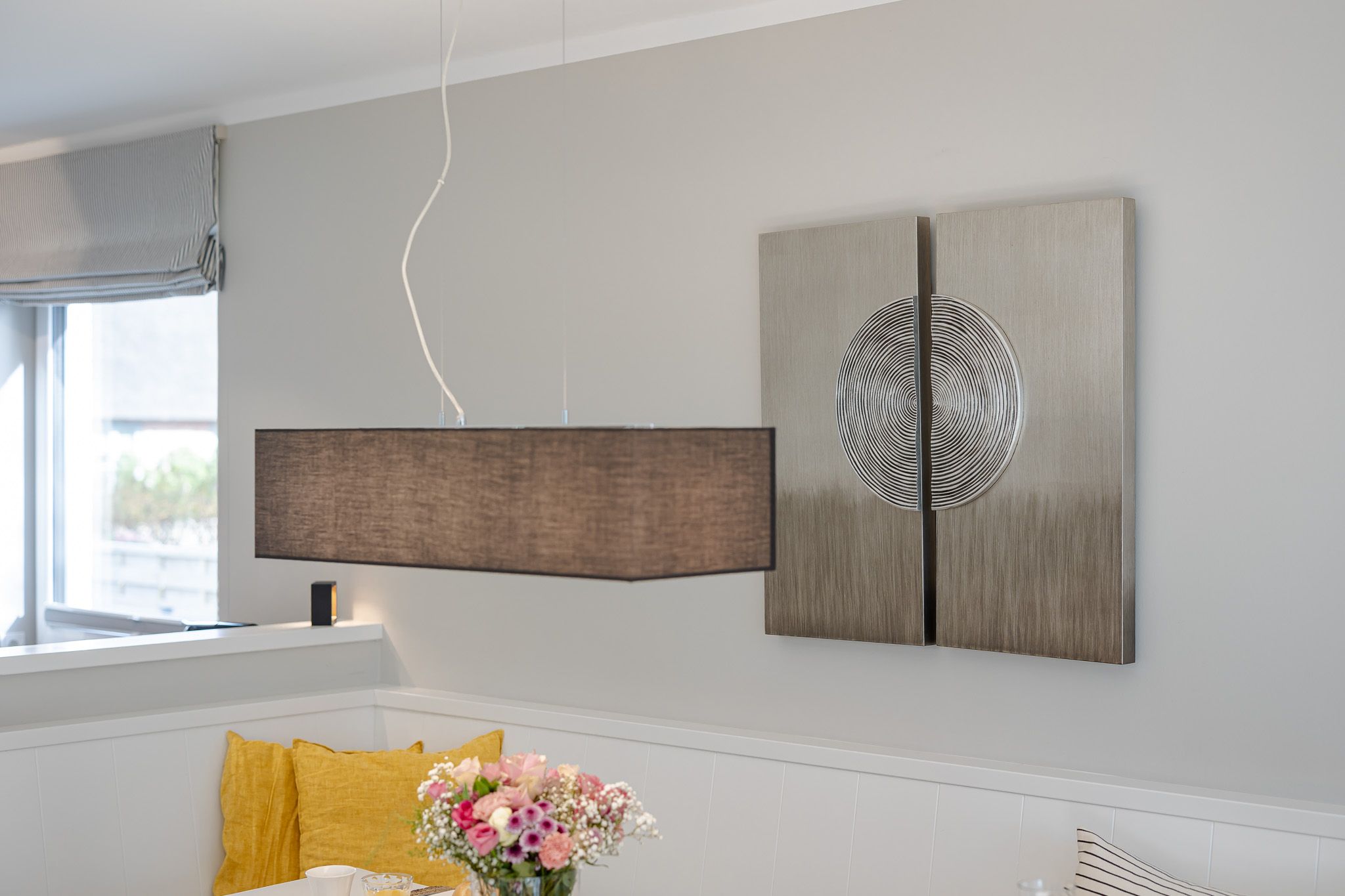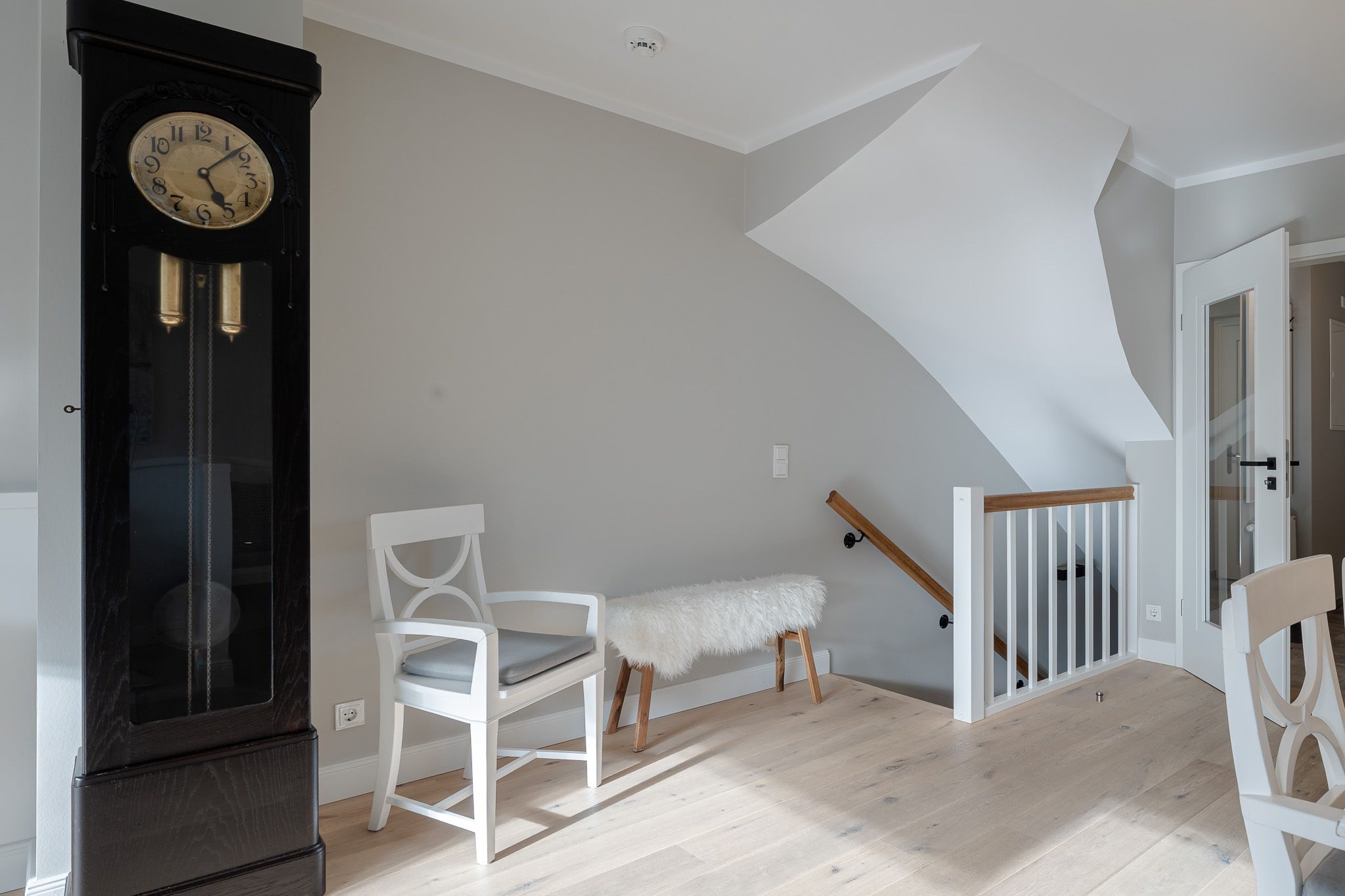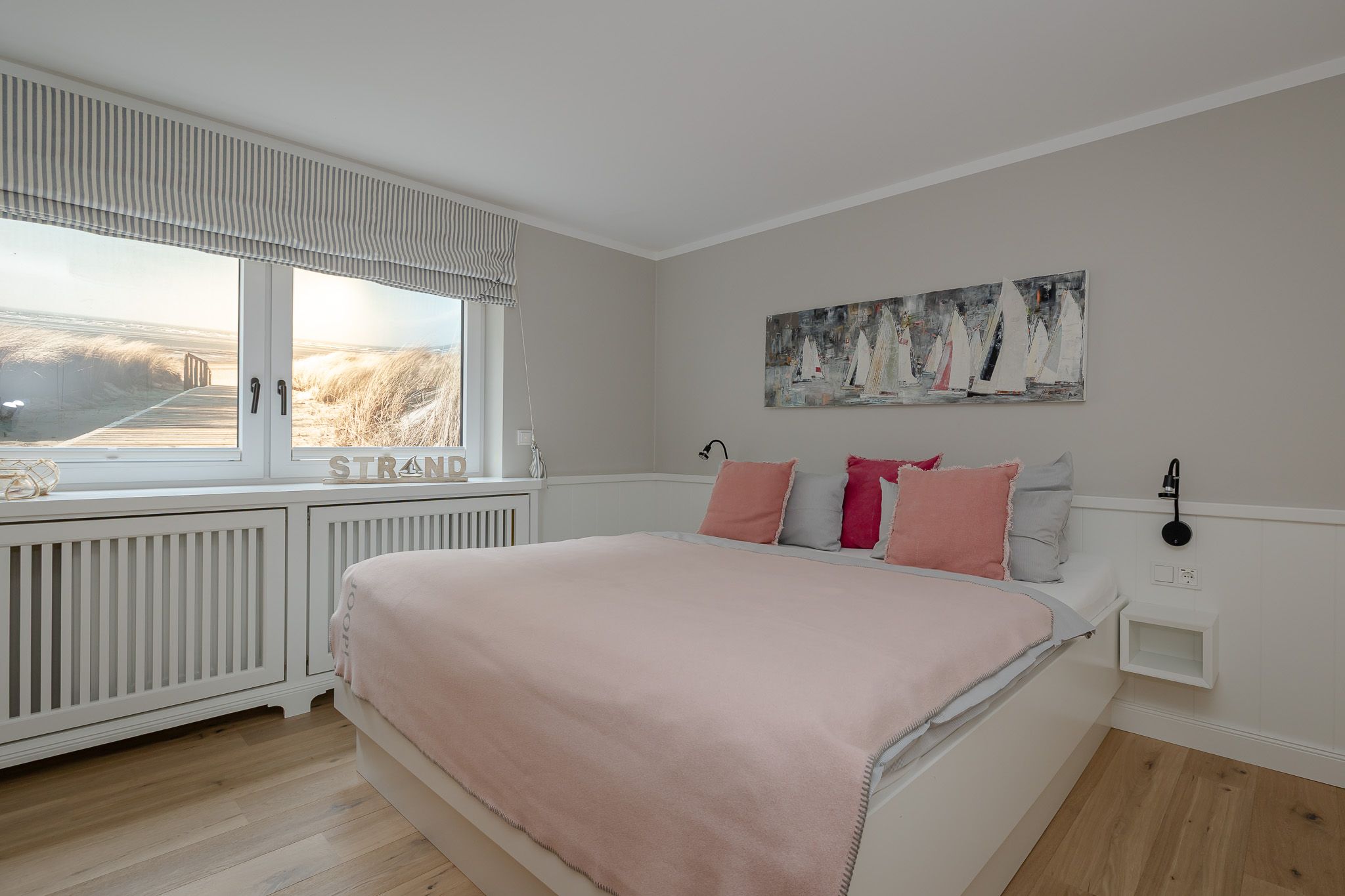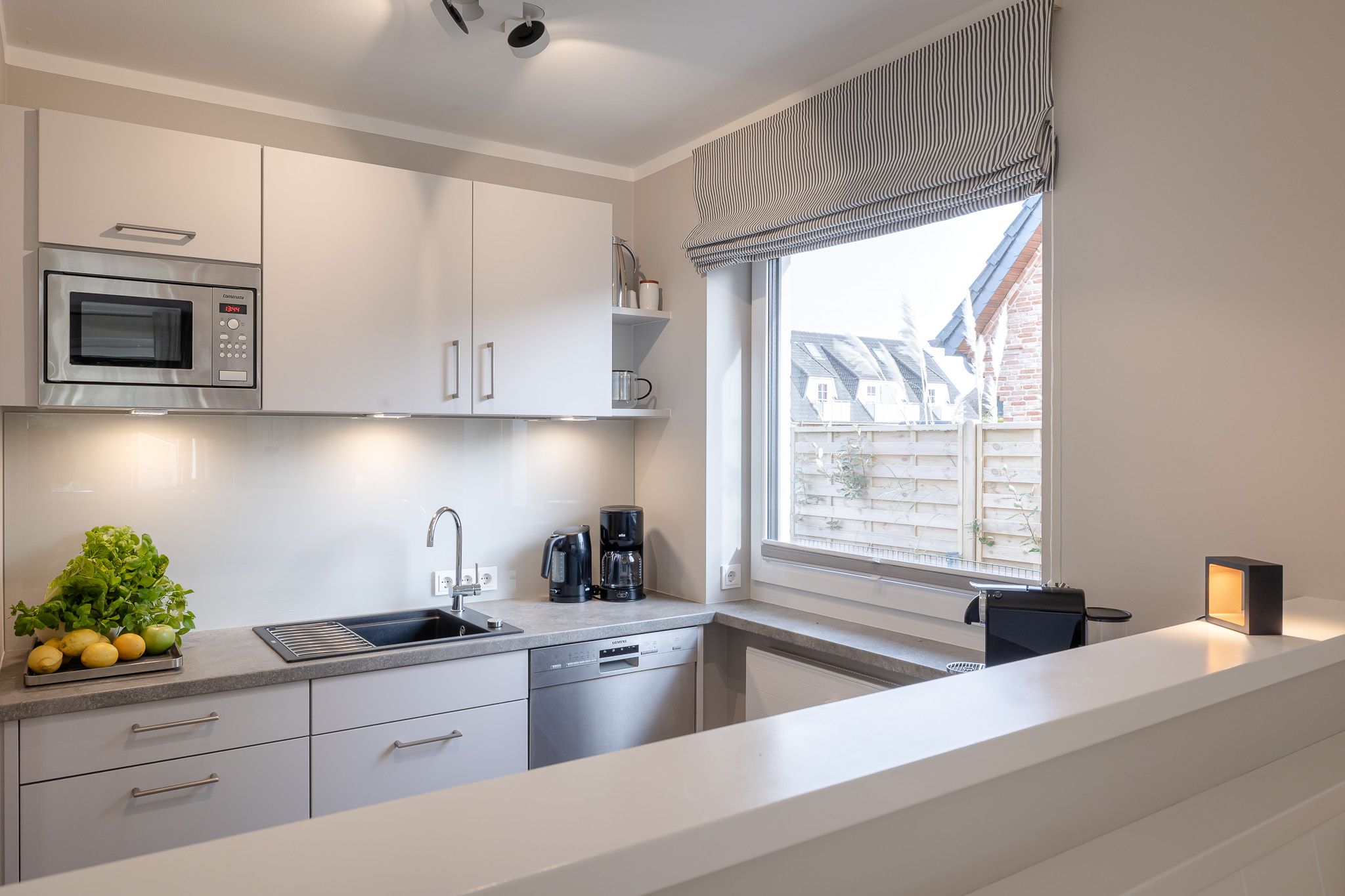 Das Herzstück bildet der lichtdurchflutete Wohnraum, der mit seiner großen Fensterfront den Blick auf die windgeschützte Süd-Terrasse freigibt, welche von morgens bis abends in der Sonne liegt. Der originale Sylter Strandkorb lädt an kühlen Tagen zum Sonnenbad ein.