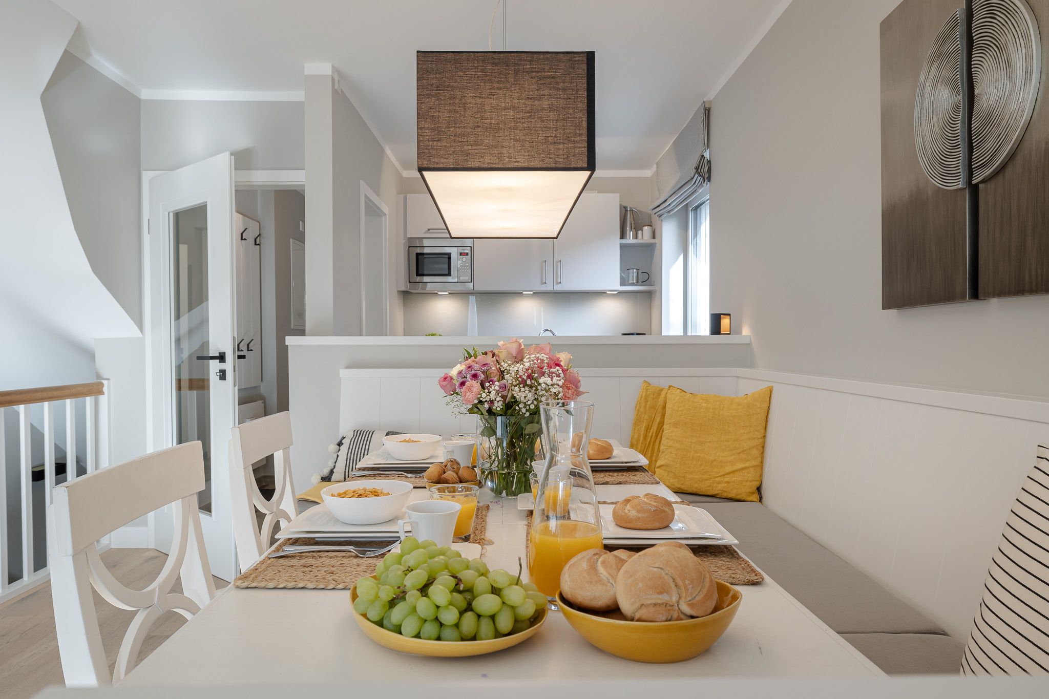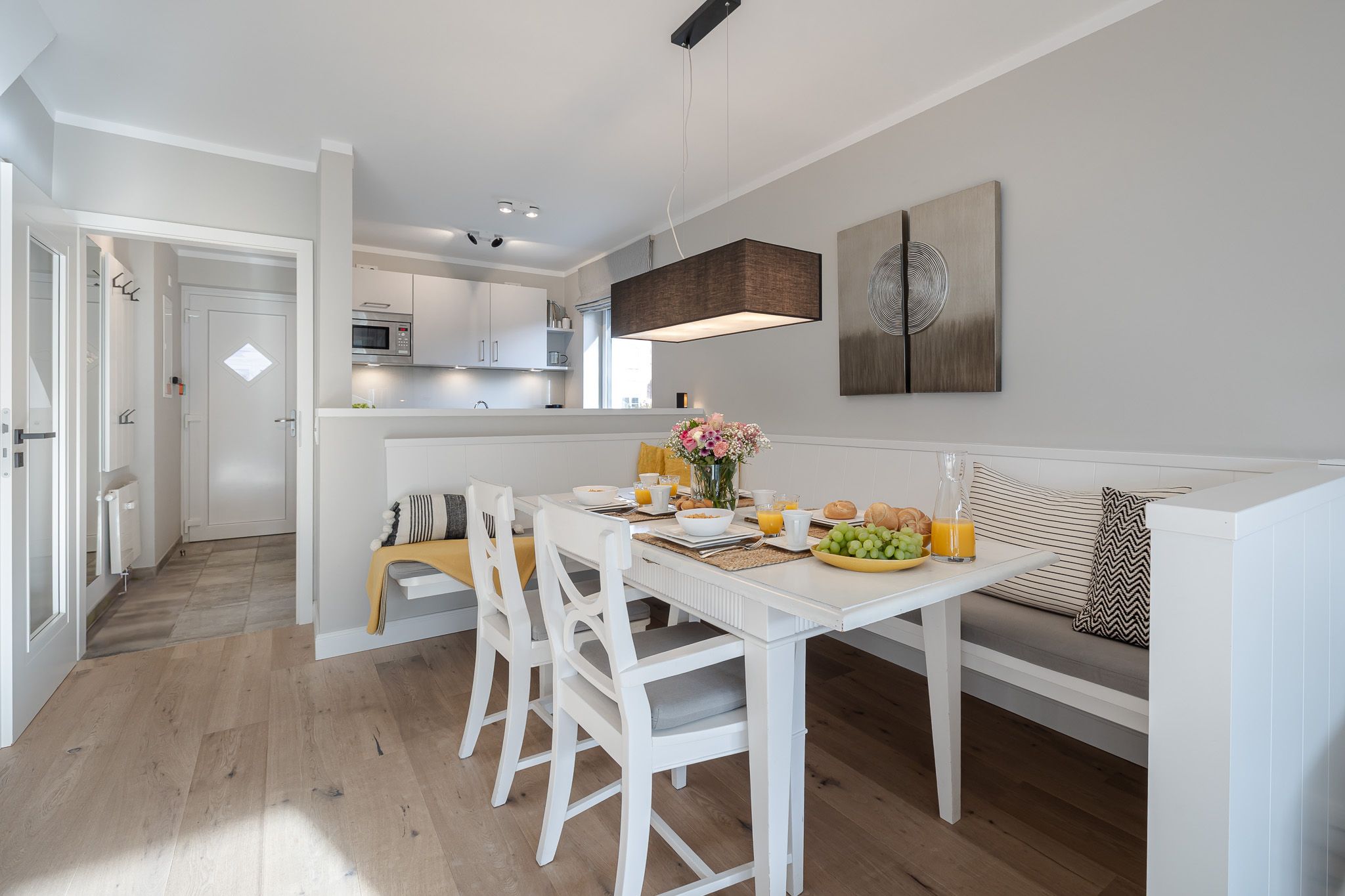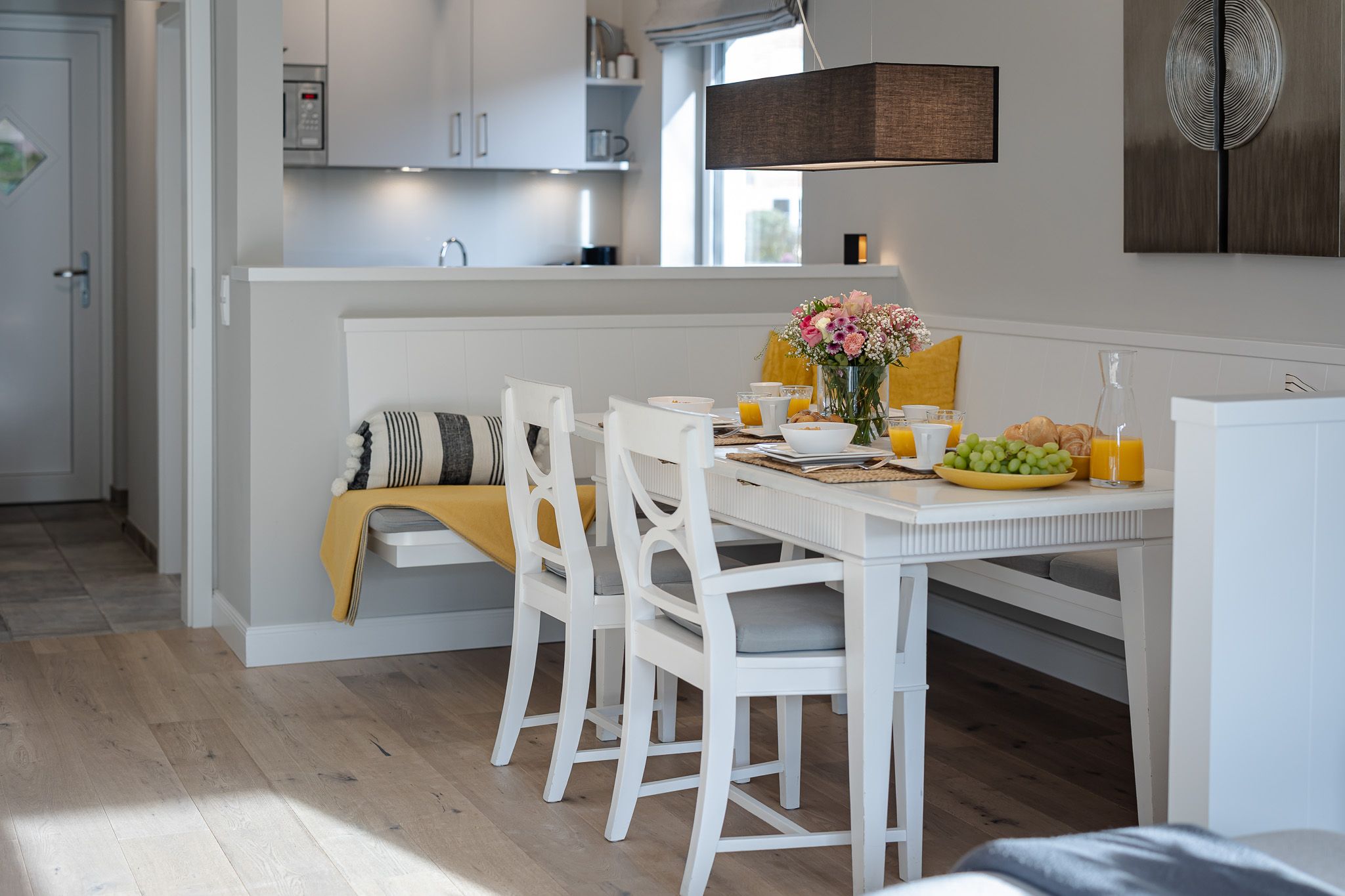 Im Wohnbereich, der durch sein helles Eichenparkett Behaglichkeit ausstrahlt, können Sie auf gemütlichen Sofa-Elementen die Seele baumeln lassen und auf dem Smart TV Ihre Lieblingsfilme über Netflix & Co schauen, oder am stilvollen Esstisch gesellige Stunden verbringen. Hier grenzt zudem die offene Küche an, sodass das Kochen zum gemeinsamen Erlebnis werden kann. Durch die hochwertige Ausstattung wird die Selbstversorgung für Sie zum Vergnügen.