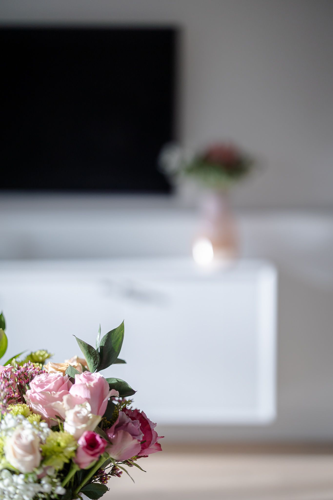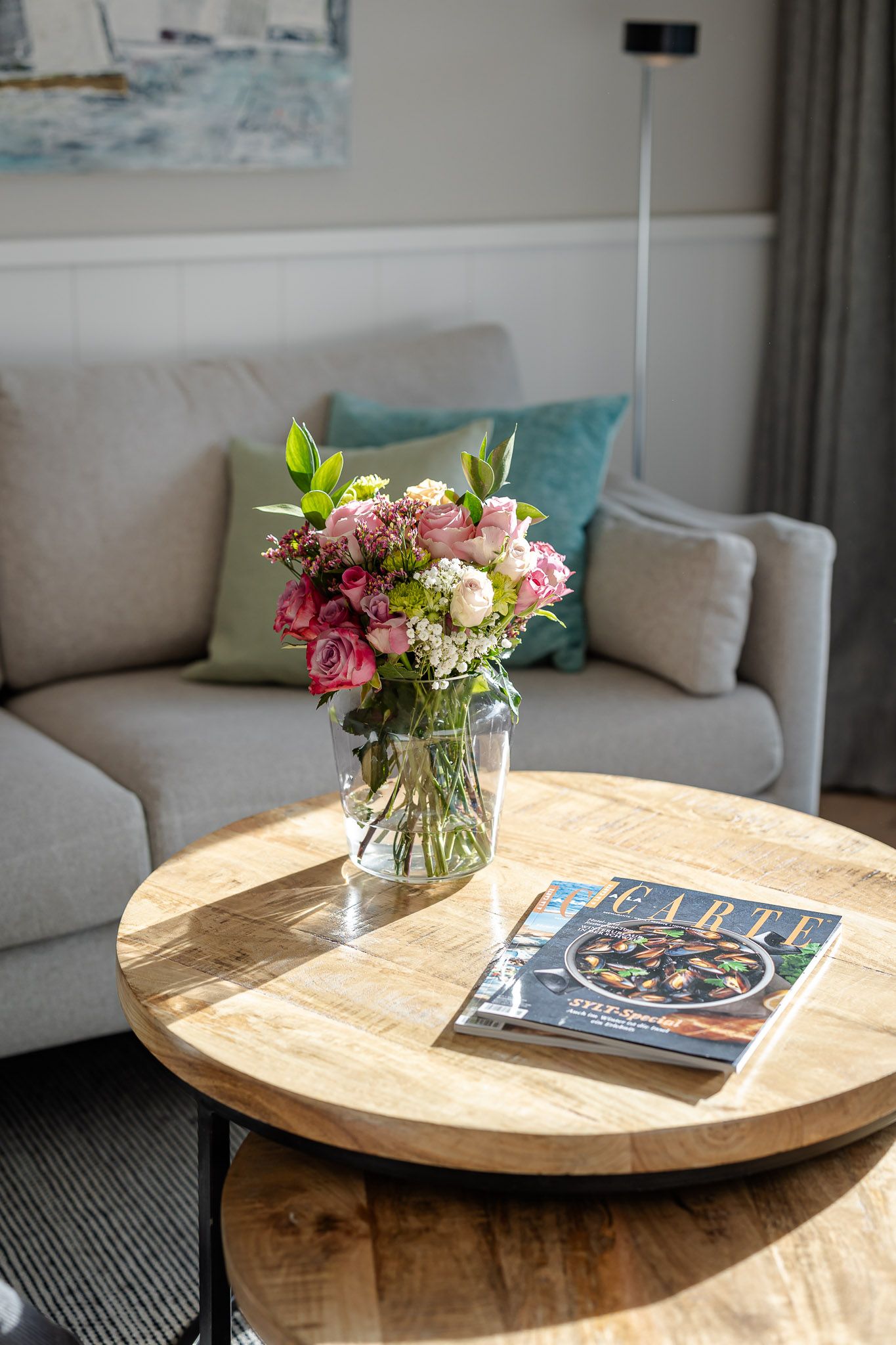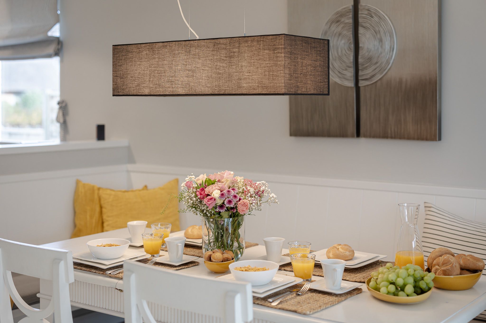 Im Wohnbereich, der durch sein helles Eichenparkett Behaglichkeit ausstrahlt, können Sie auf gemütlichen Sofa-Elementen die Seele baumeln lassen und auf dem Smart TV Ihre Lieblingsfilme über Netflix & Co schauen, oder am stilvollen Esstisch gesellige Stunden verbringen. Hier grenzt zudem die offene Küche an, sodass das Kochen zum gemeinsamen Erlebnis werden kann. Durch die hochwertige Ausstattung wird die Selbstversorgung für Sie zum Vergnügen.