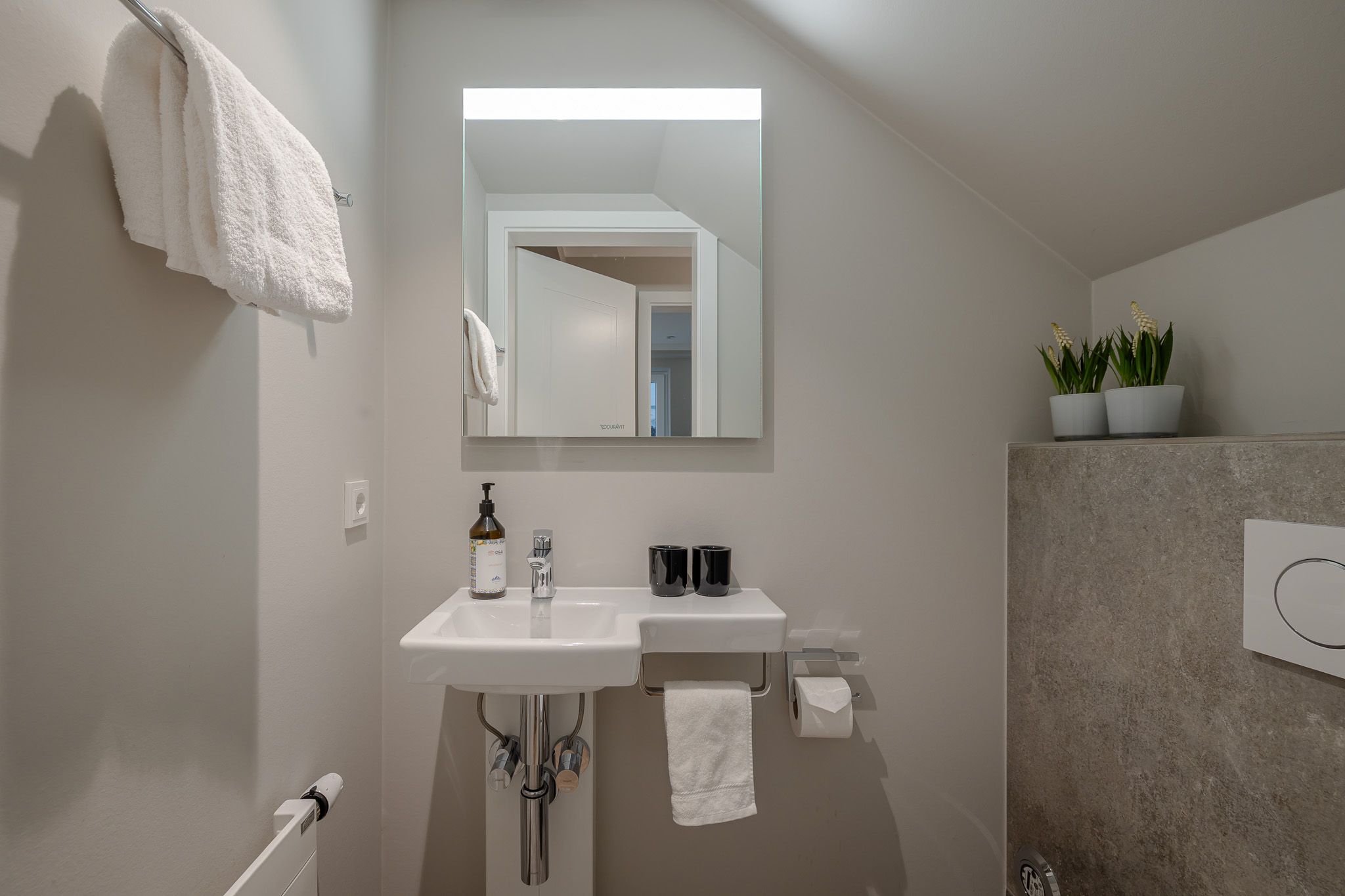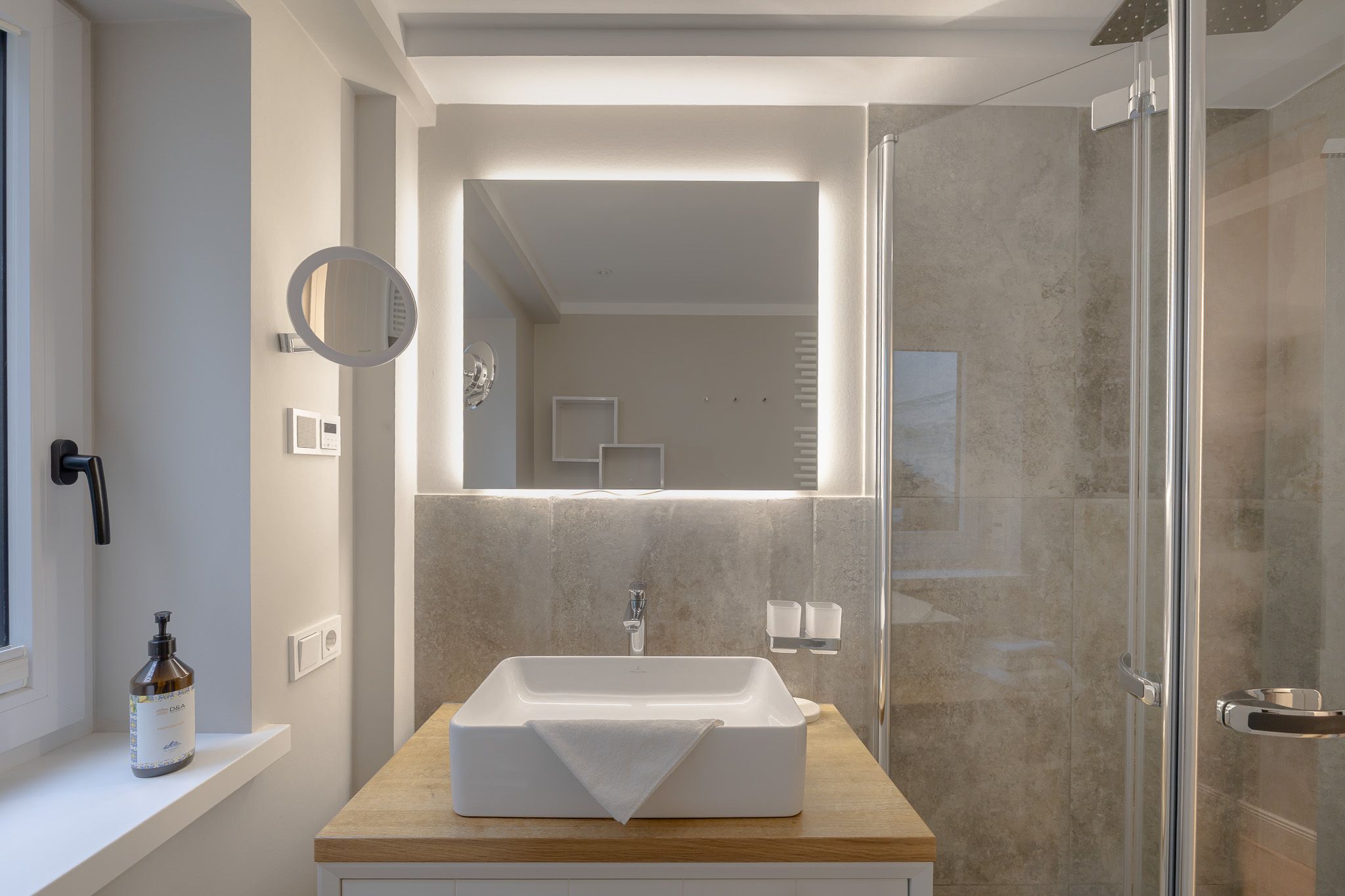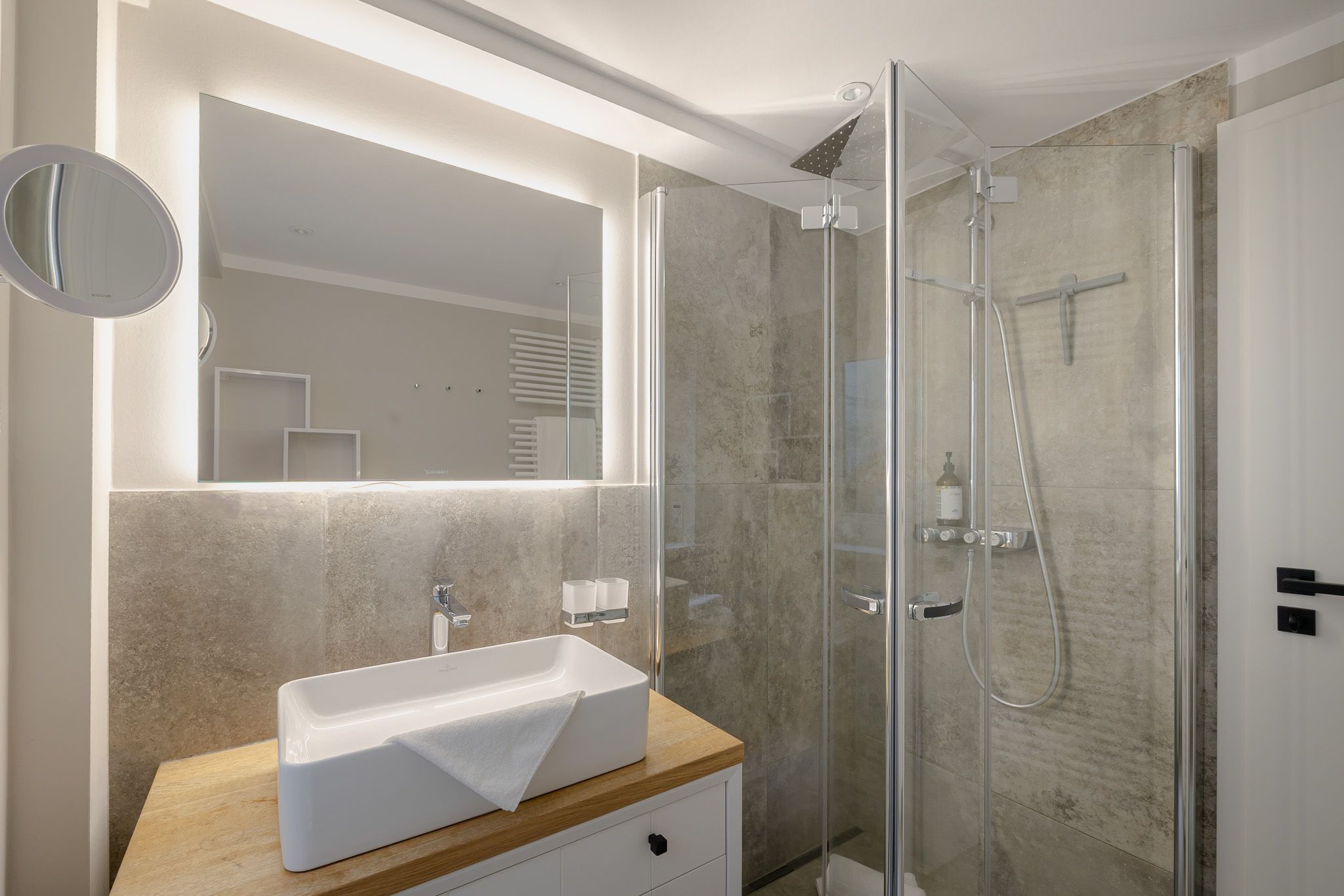 Im Souterrain befindet sich das große Badezimmer mit bodentiefer Dusche. Die exklusive Gestaltung des Badezimmers verströmt eine Wohlfühlatmosphäre und trägt so zu Ihrer Entspannung bei.
