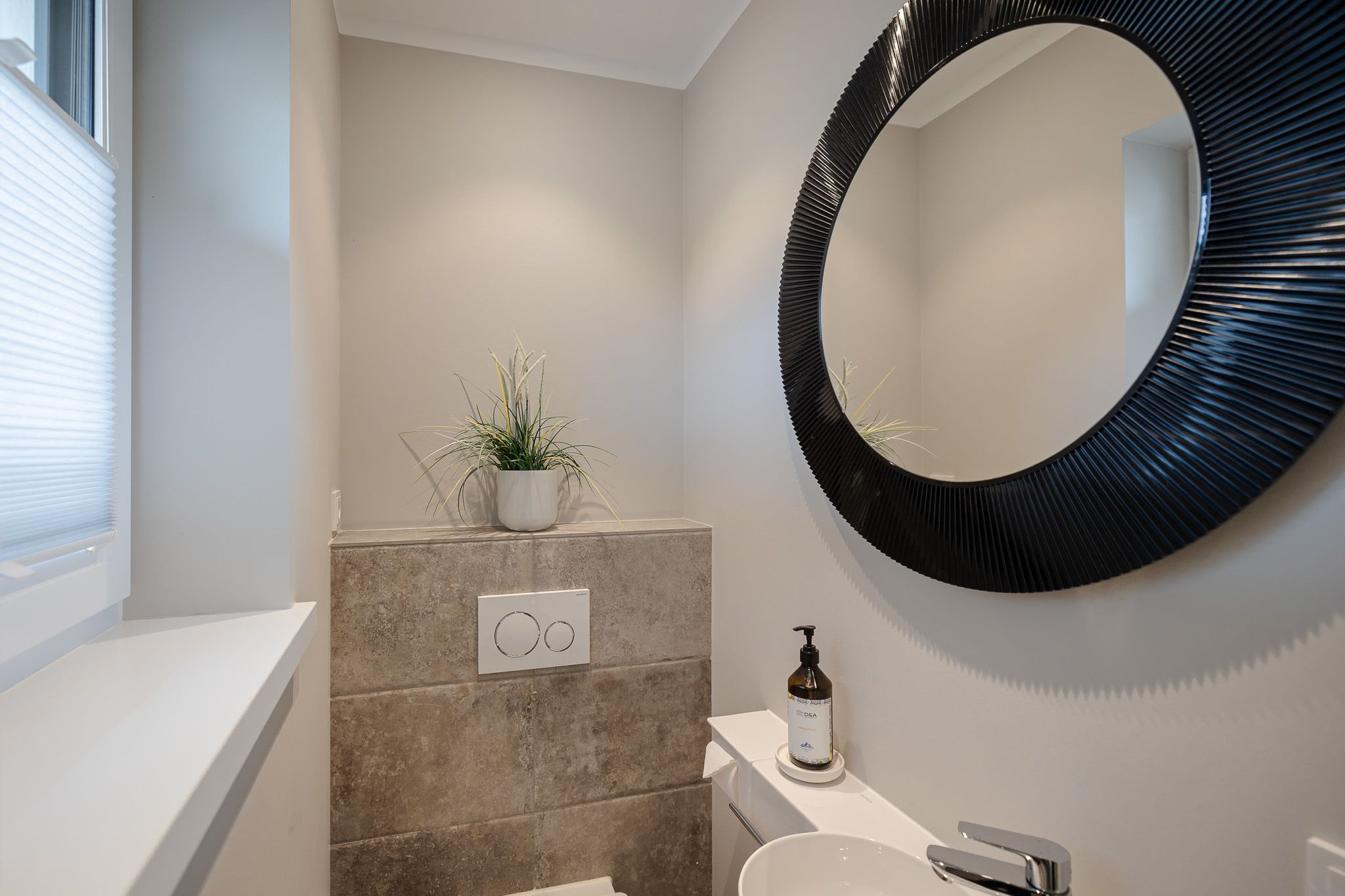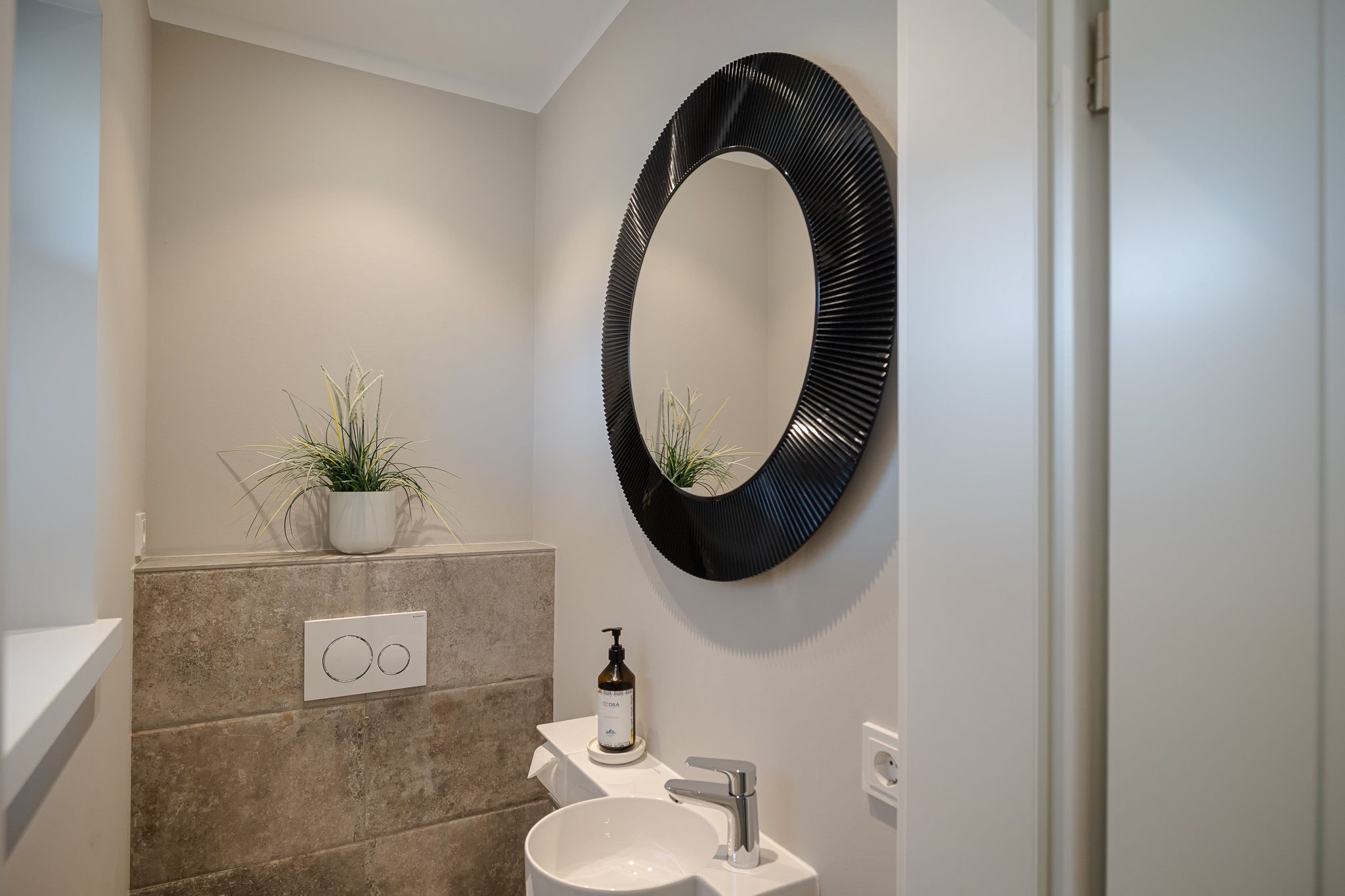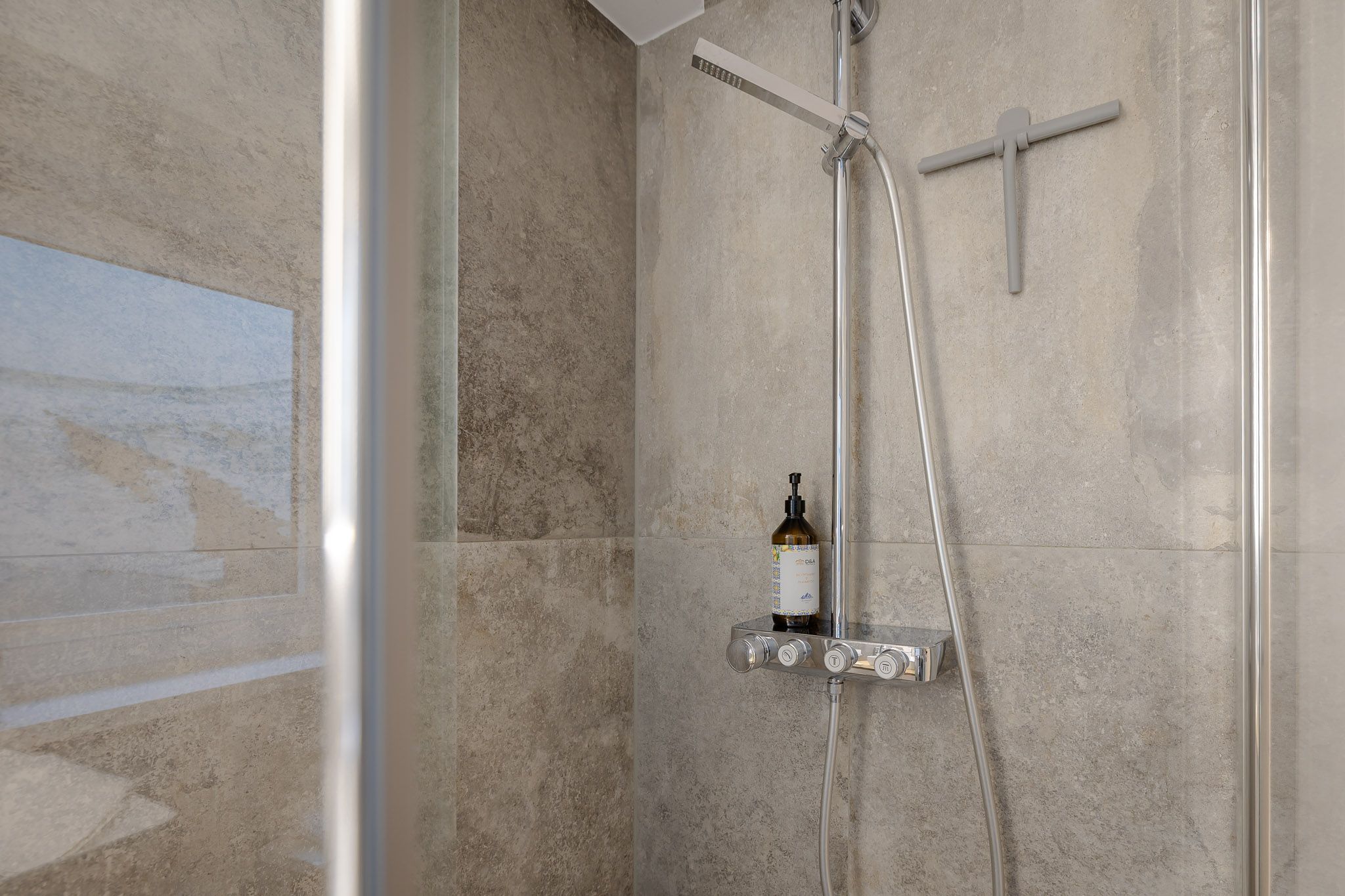 Im Souterrain befindet sich das große Badezimmer mit bodentiefer Dusche. Die exklusive Gestaltung des Badezimmers verströmt eine Wohlfühlatmosphäre und trägt so zu Ihrer Entspannung bei.
