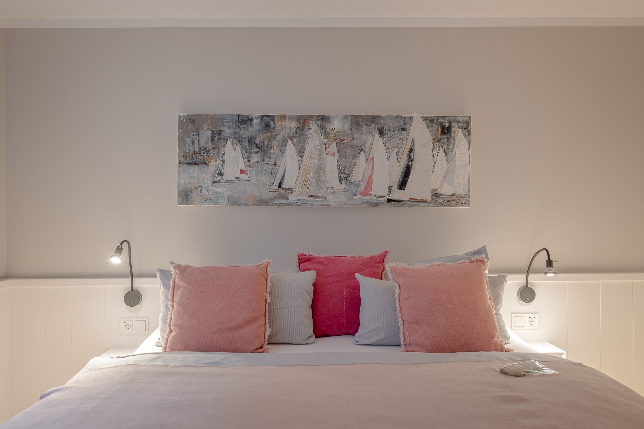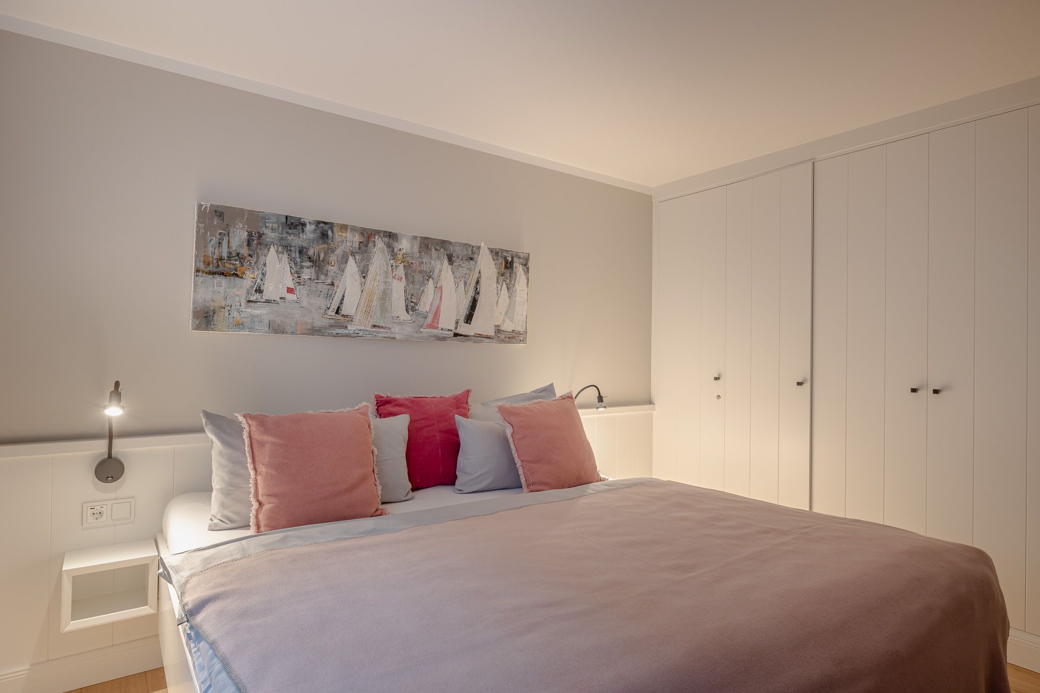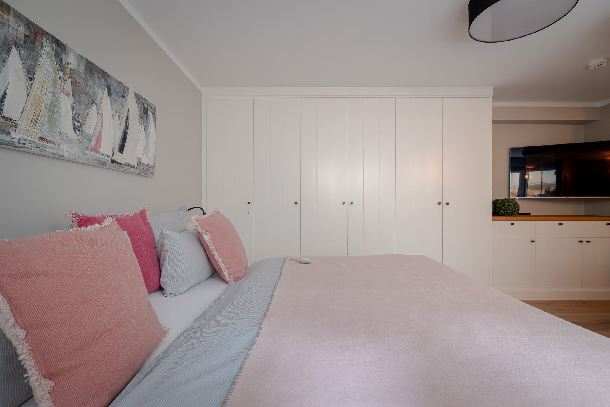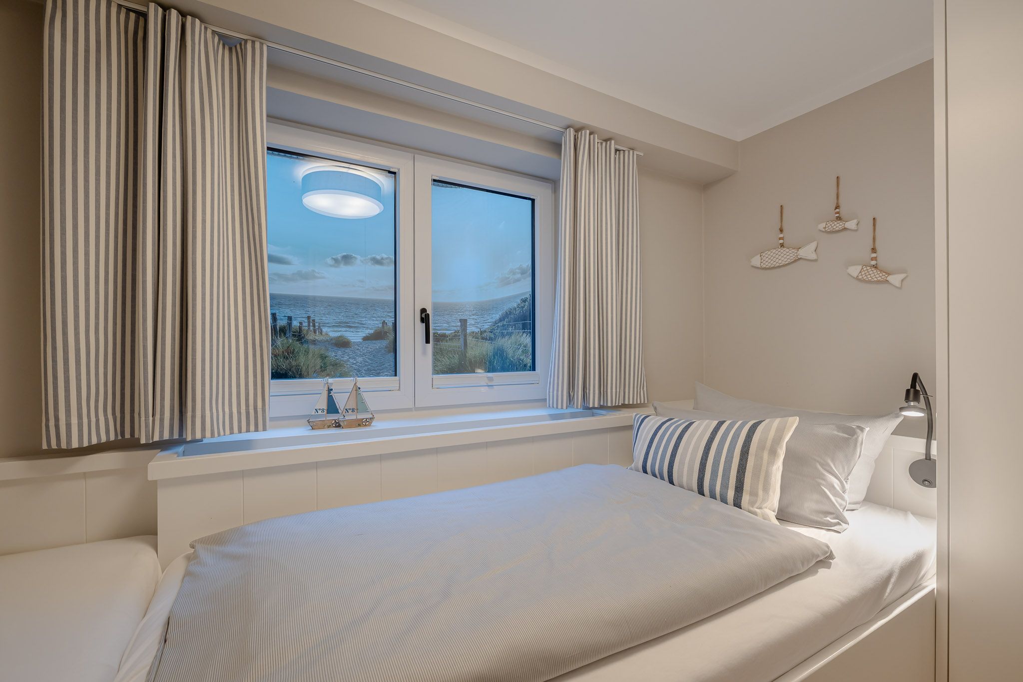 Im großen Schlafzimmer befinden sich ein komfortables Doppelbett und ausreichend Stauraum für Ihre Garderobe. Das kleinere Schlafzimmer ist mit zwei Einzelbetten ausgestattet, sodass sich unser Domizil auch sehr gut für den Urlaub mit Kindern eignet. Alle Räume des Souterrains erhalten durch die großen Lichtschächte genügend Licht, wobei diese mit beeindruckenden maritimen Bildern gestaltet sind. So haben Sie schon beim Aufwachen das Gefühl, am Meer zu sein.