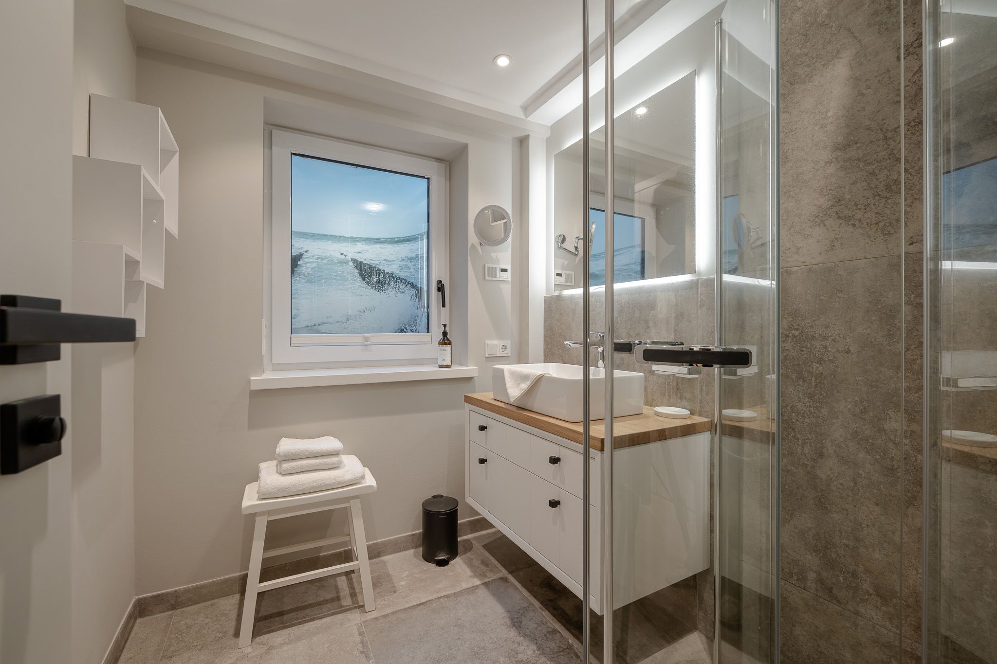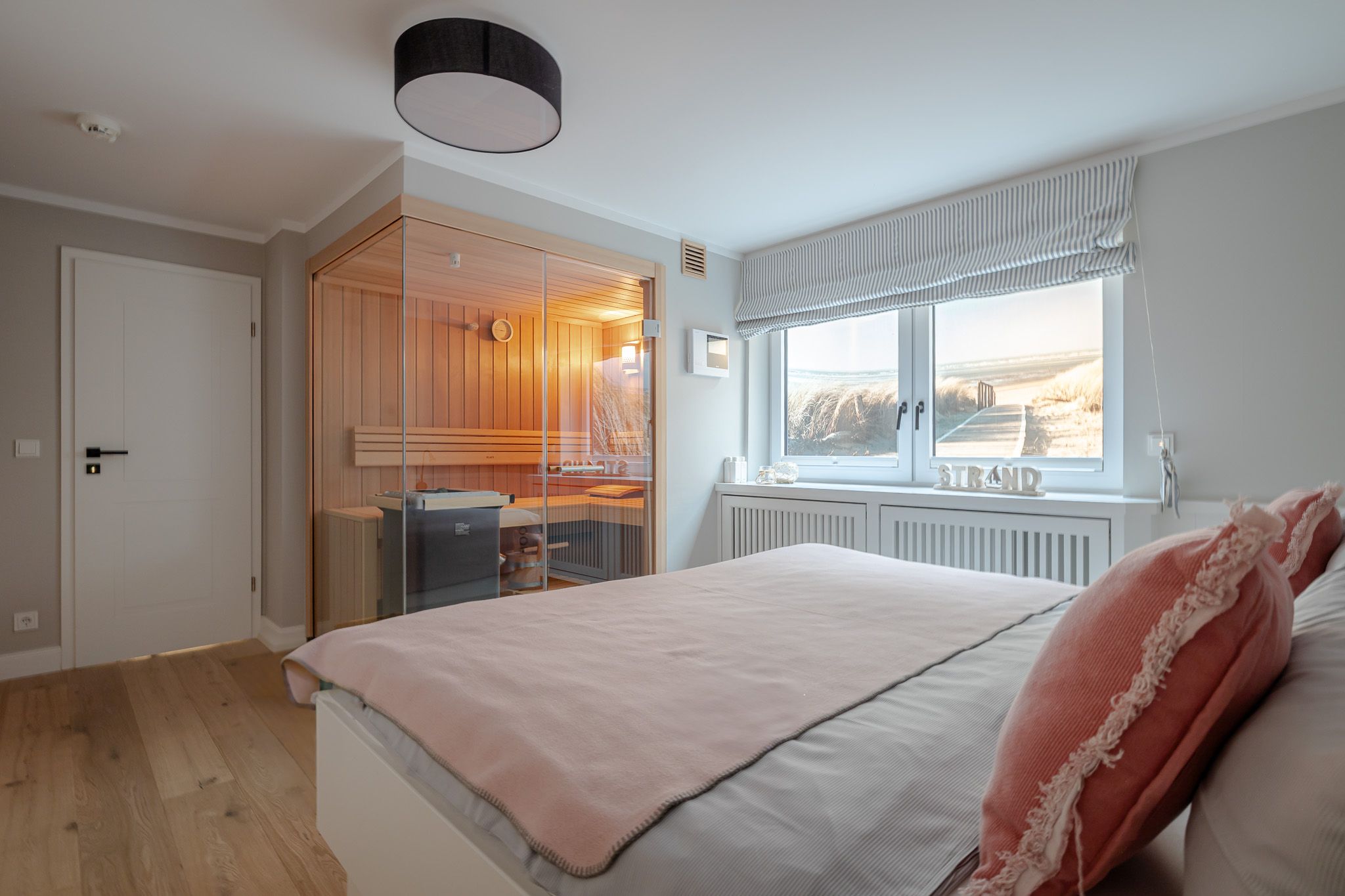 Das Highlight im Souterrain stellt die eigene Sauna dar, die mit viel Glas und einem Lichtkonzept für gute Stimmung und Wohlfühlatmosphäre, gerade an kälteren Tagen, sorgt. Besonders nach einem Strand-Spaziergang bei Wind und Wetter ist ein Saunabad sehr wohltuend. Zudem steht Ihnen ein Netflix Account zur Verfügung, der Ihnen den passenden Filmgenuss zu Ihrer Urlaubsstimmung beschert.