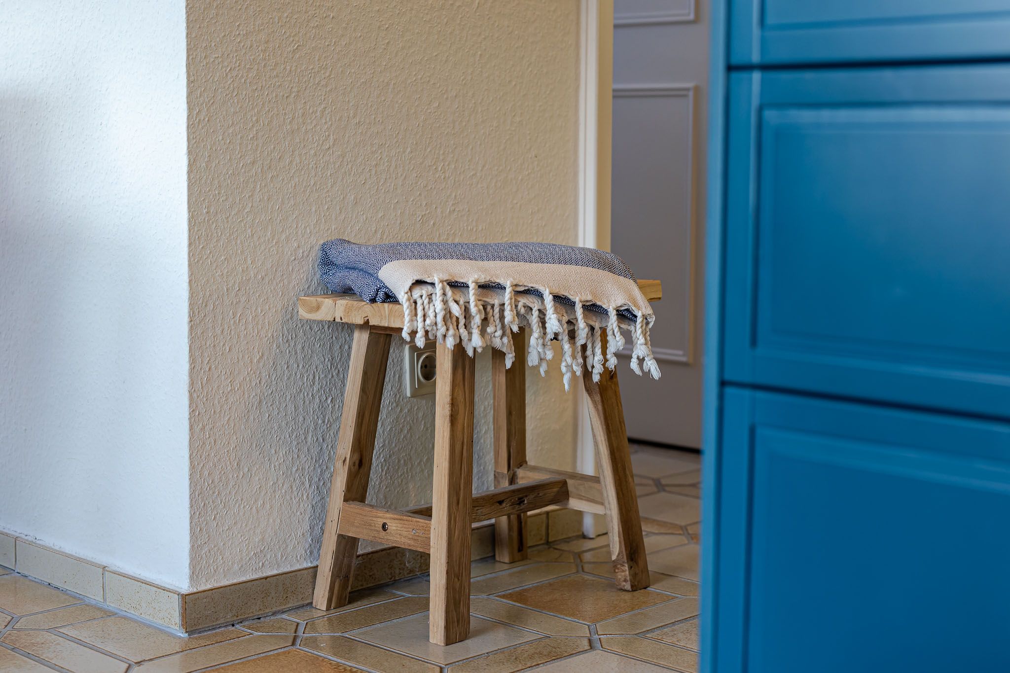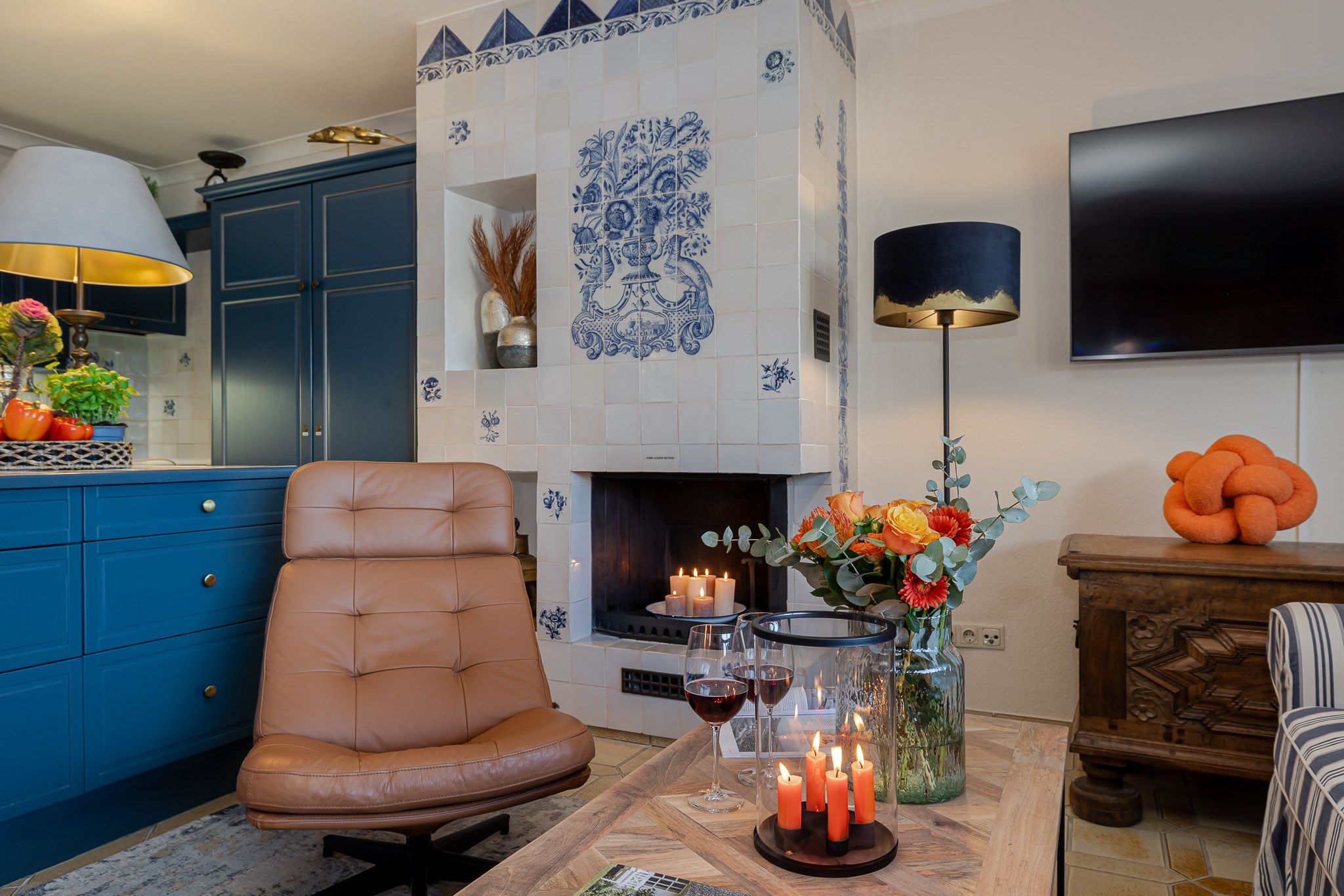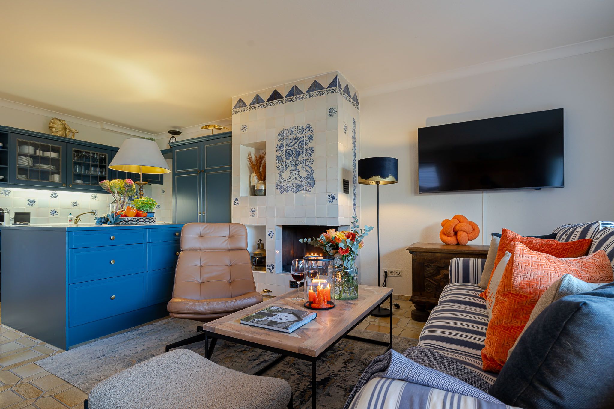 Die wunderschöne Landhausküche in Ozeanblau, die gemütliche Sofaecke und die warmen Farben schaffen innen ein Gefühl von Geborgenheit. Der Kamin ist dekorativ, zaubert aber mit seinen Kerzenlichtern eine stimmungsvolle Atmosphäre – besonders an kühleren Tagen. Auf dieser Ebene befinden sich zudem ein Vollbad sowie ein praktischer Waschraum, ideal für längere Aufenthalte, Strandtage und Reisen mit Kindern oder Hund.