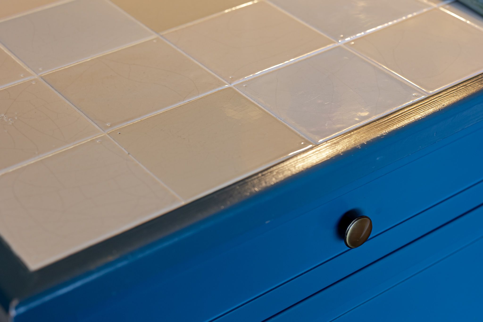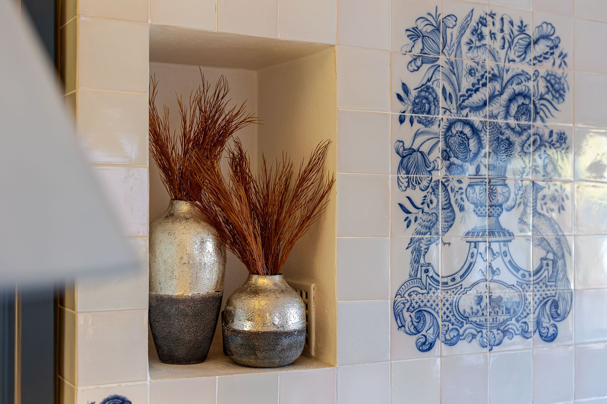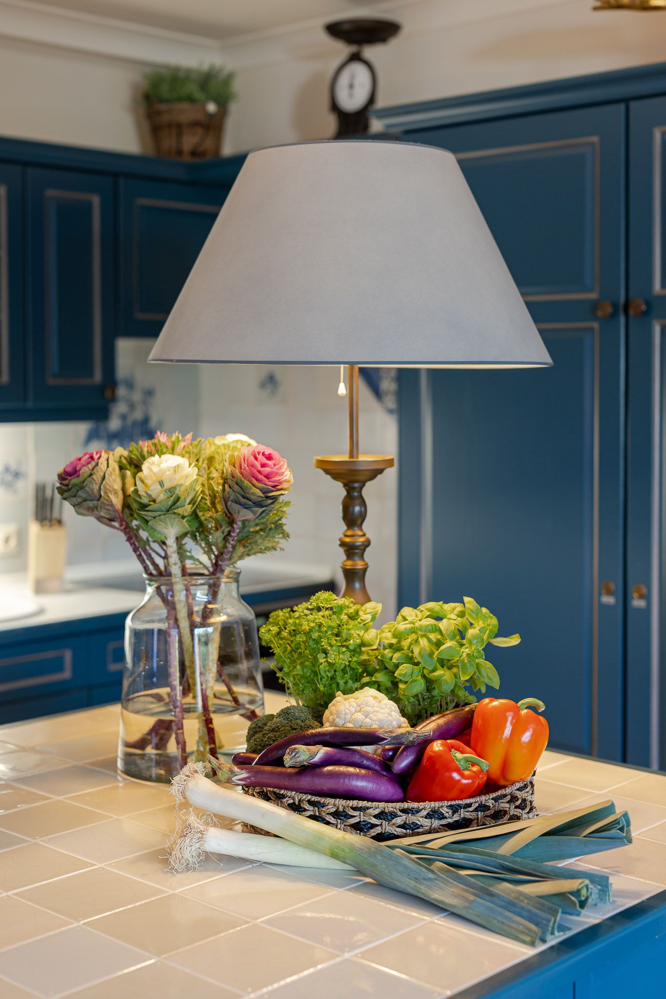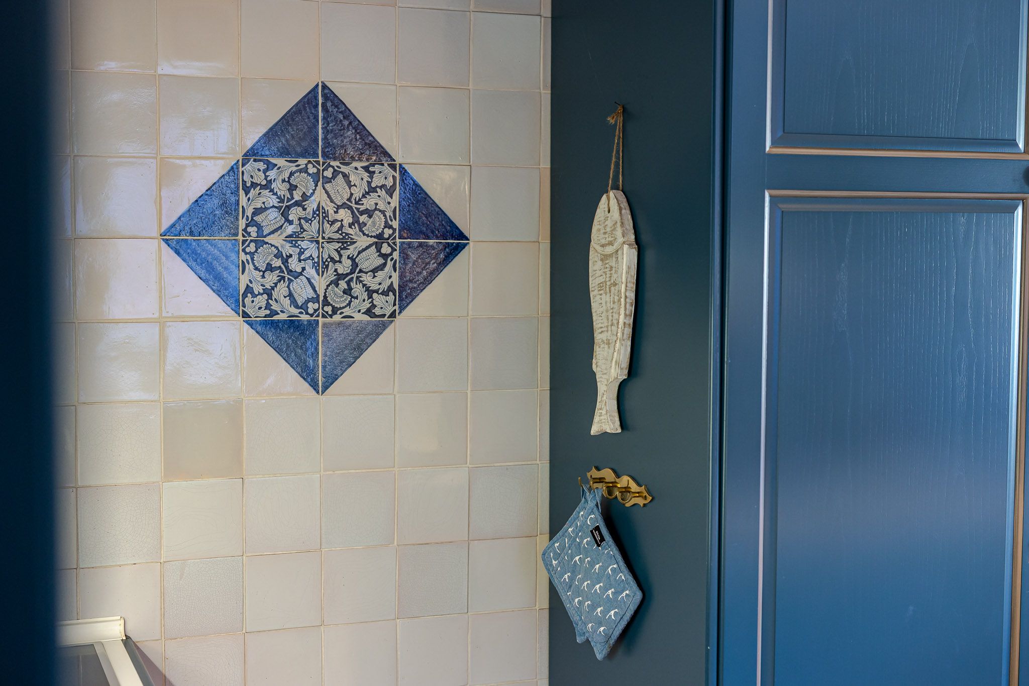 Die wunderschöne Landhausküche in Ozeanblau, die gemütliche Sofaecke und die warmen Farben schaffen innen ein Gefühl von Geborgenheit. Der Kamin ist dekorativ, zaubert aber mit seinen Kerzenlichtern eine stimmungsvolle Atmosphäre – besonders an kühleren Tagen. Auf dieser Ebene befinden sich zudem ein Vollbad sowie ein praktischer Waschraum, ideal für längere Aufenthalte, Strandtage und Reisen mit Kindern oder Hund.