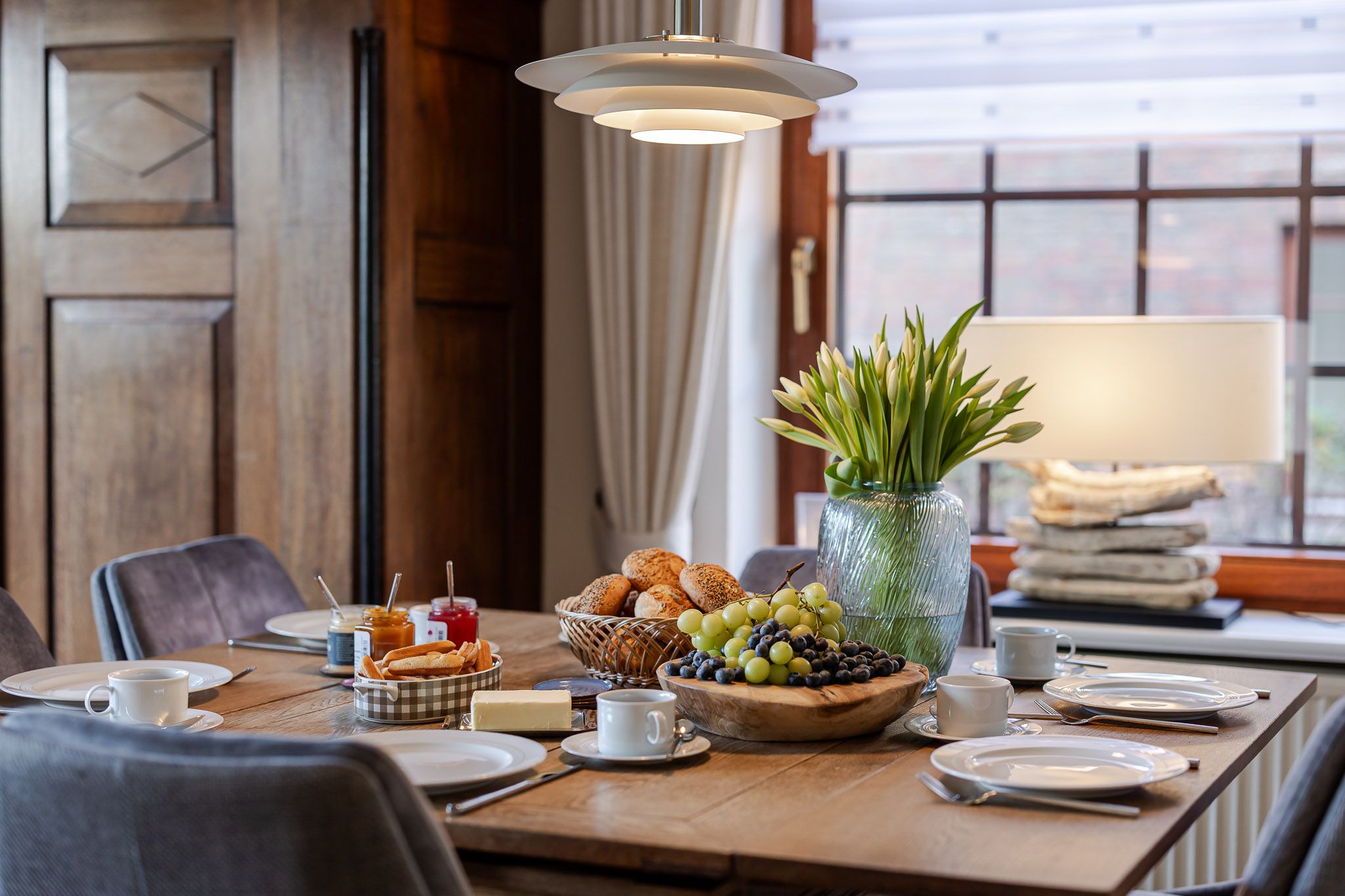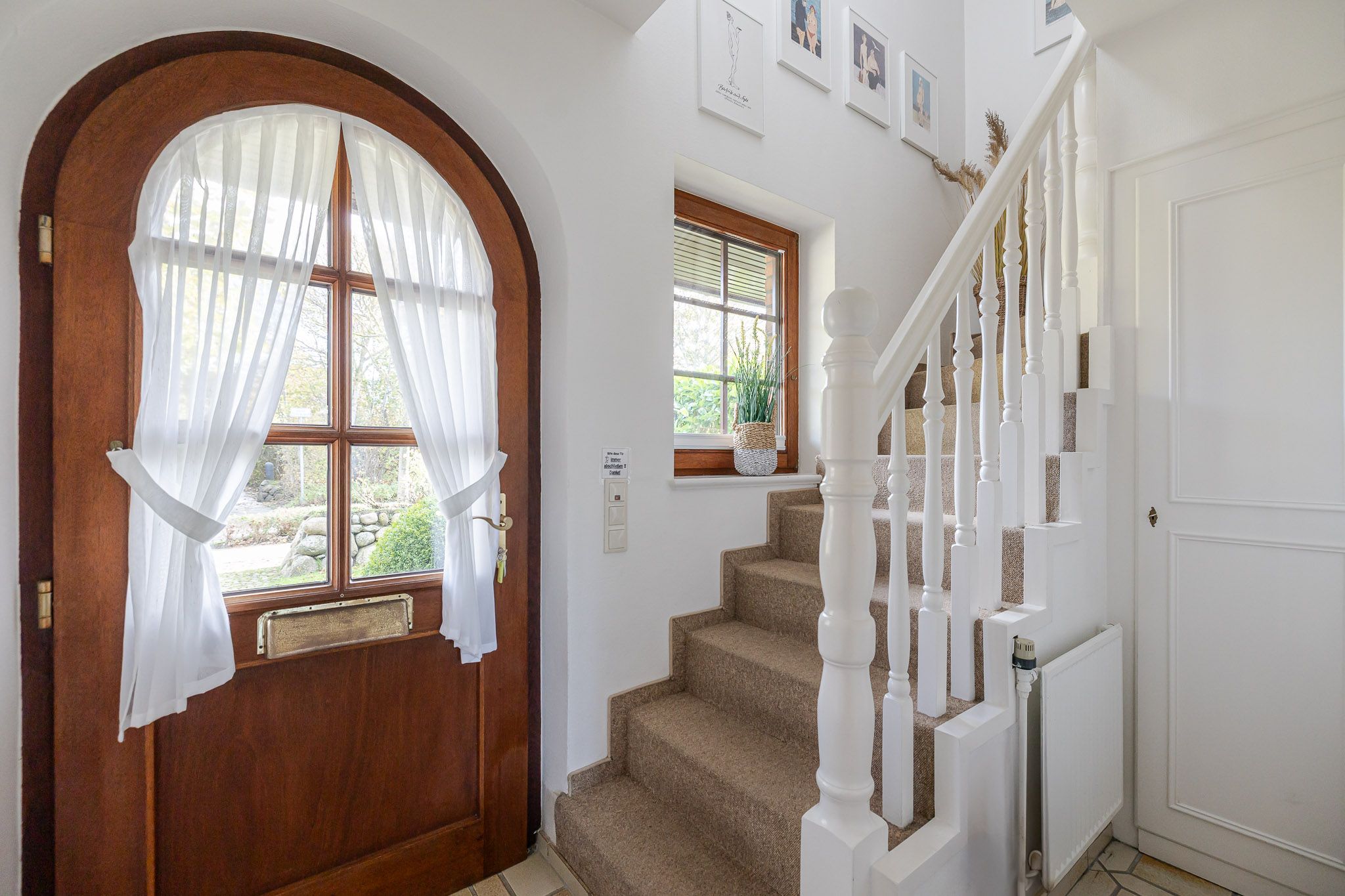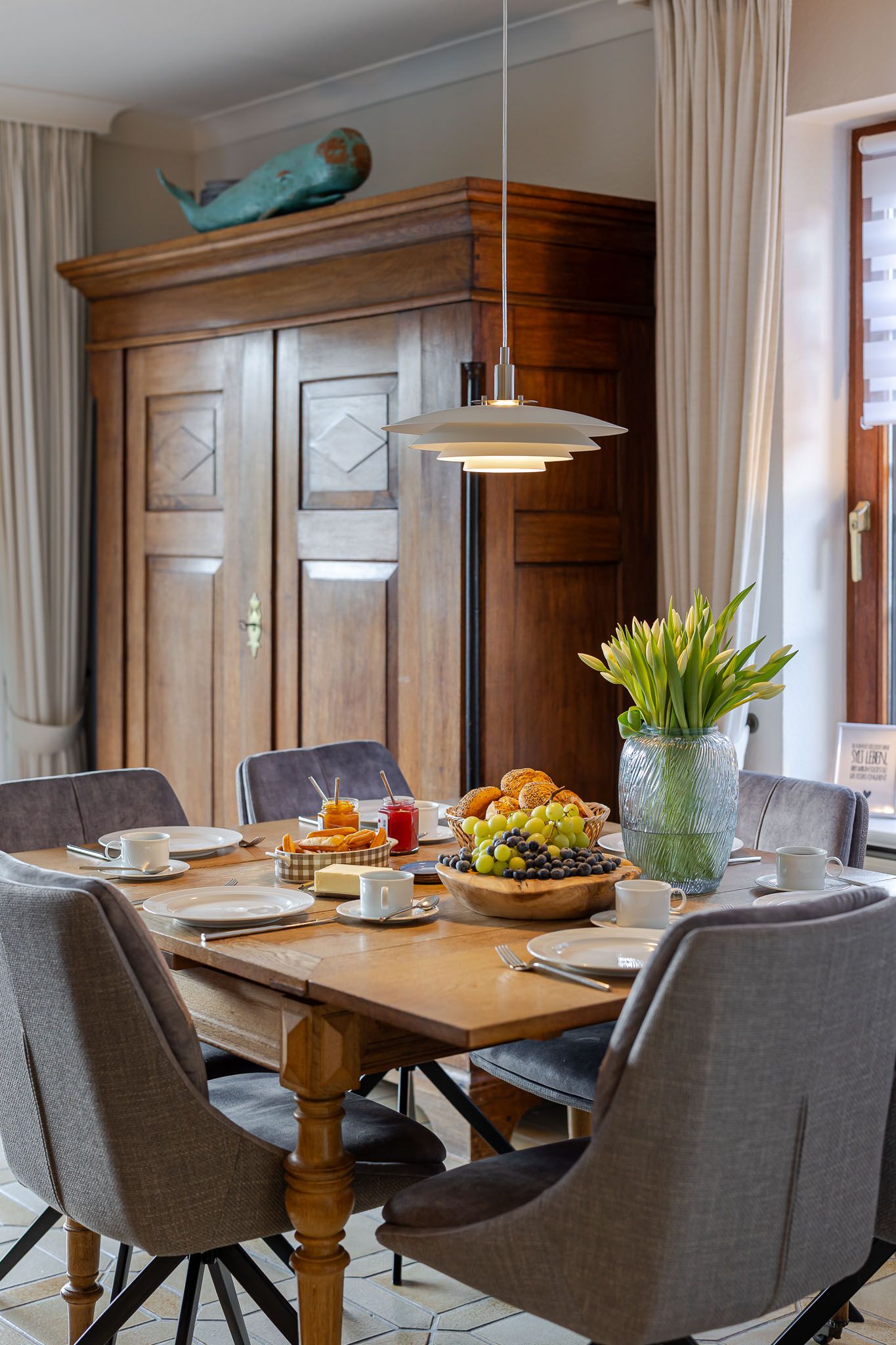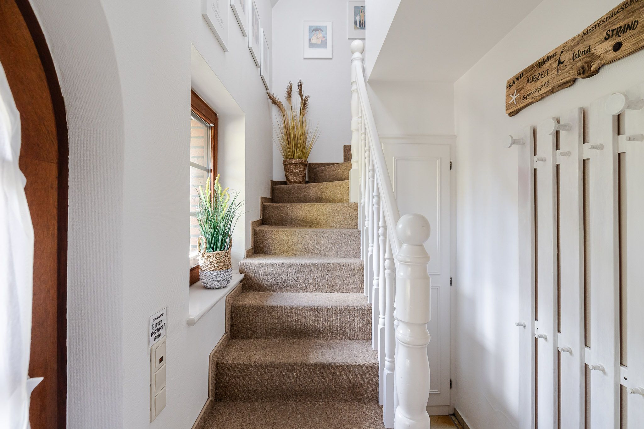 Schon im Erdgeschoss zeigt sich, warum dieses Haus den Namen „Friesenherz“ trägt. Der helle Wohn- und Küchenbereich öffnet sich direkt zur Terrasse und dem großzügigen Garten – ein grüner Rückzugsort, der im Sommer zum lebendigen Zentrum des Hauses wird. Frühstück zwischen Rosen, lange Nachmittage im eigenen Strandkorb, Grillabende mit Familie und Freunden oder ein Glas Wein in der Abendsonne: Dieser Außenbereich ist gemacht für Erinnerungen.