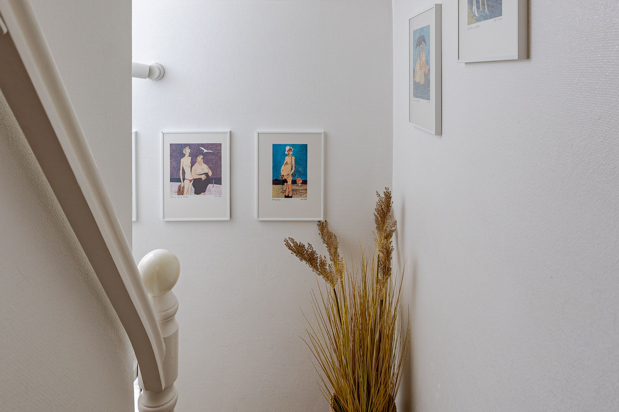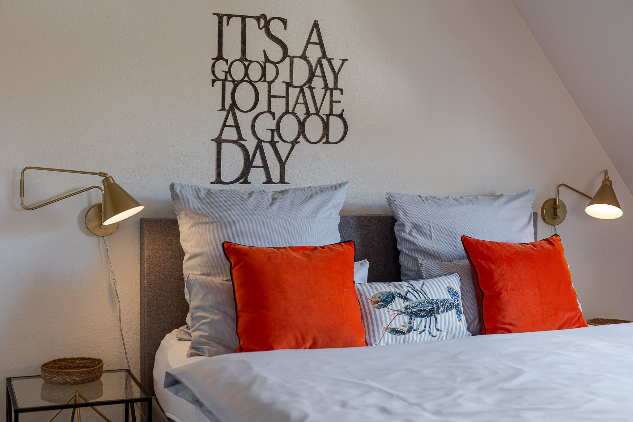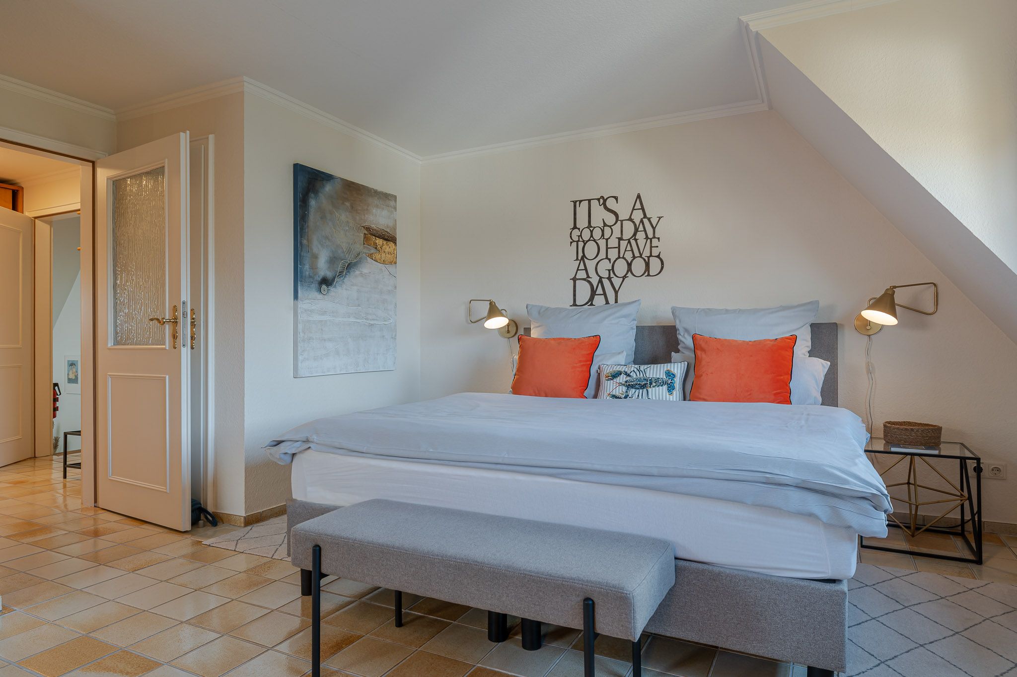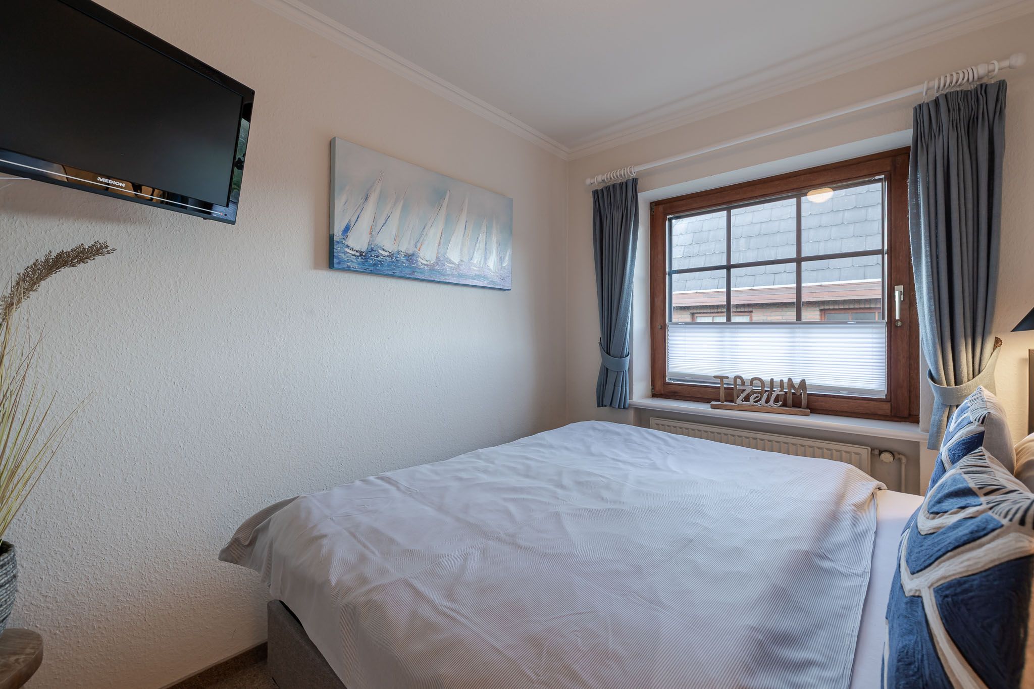 Auf der oberen Etage liegen die Schlafräume, die mit viel Liebe zum Detail gestaltet wurden. Das großzügige Hauptschlafzimmer überzeugt mit seiner freundlichen Ausstrahlung, viel Platz und einem komfortablen Boxspringbett in 180x200 cm, das für erholsame Nächte sorgt. Gleich daneben befindet sich ein kleineres, besonders gemütliches Schlafzimmer mit einem 160x200 cm Bett, maritimen Akzenten und warmen Stoffen – perfekt für Paare, Freunde oder ältere Kinder.