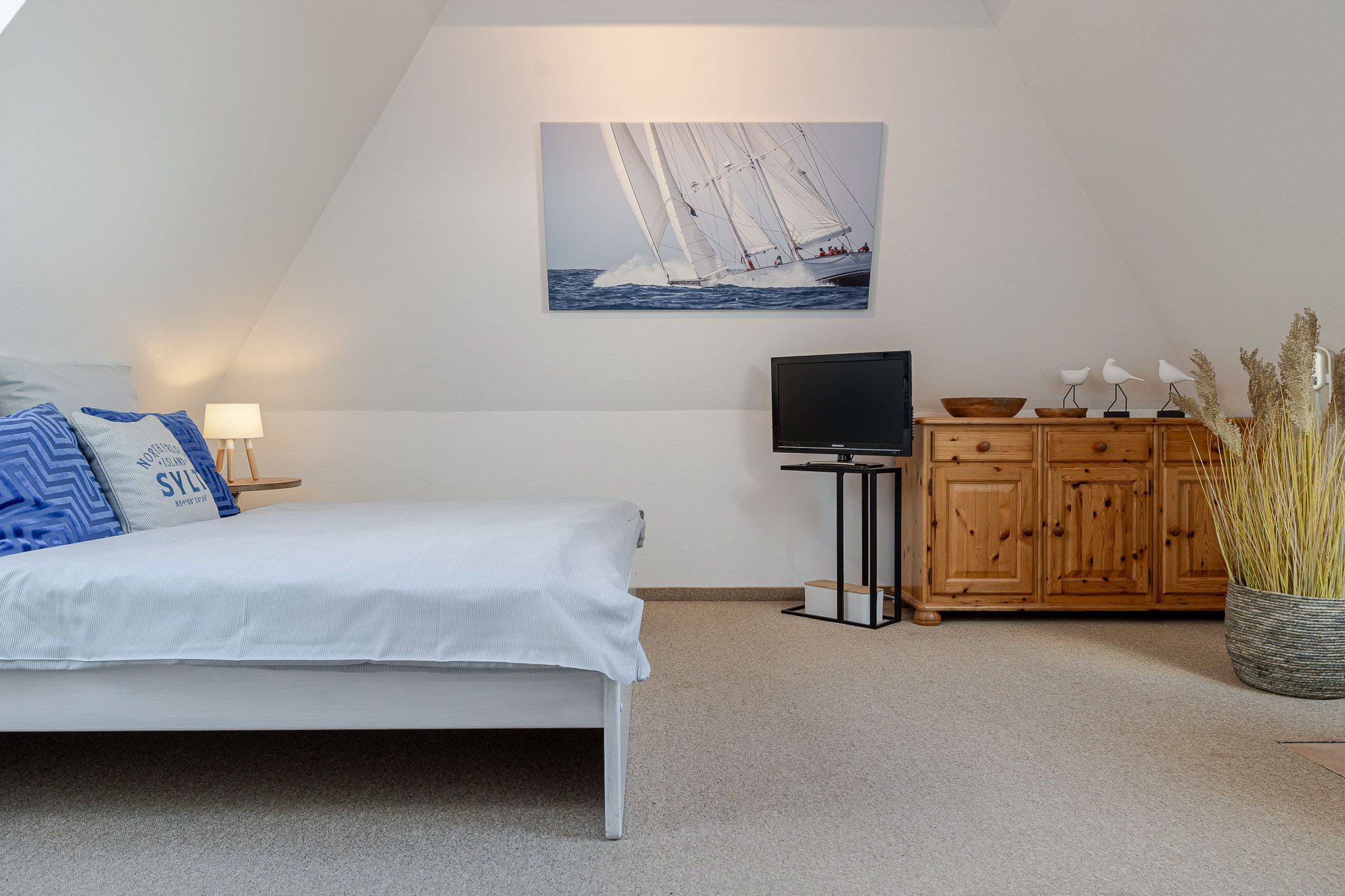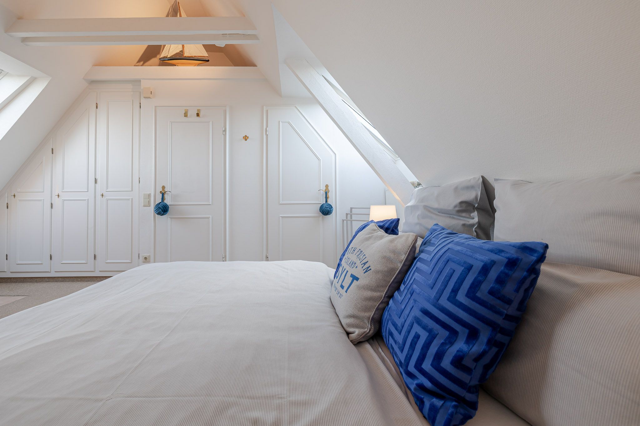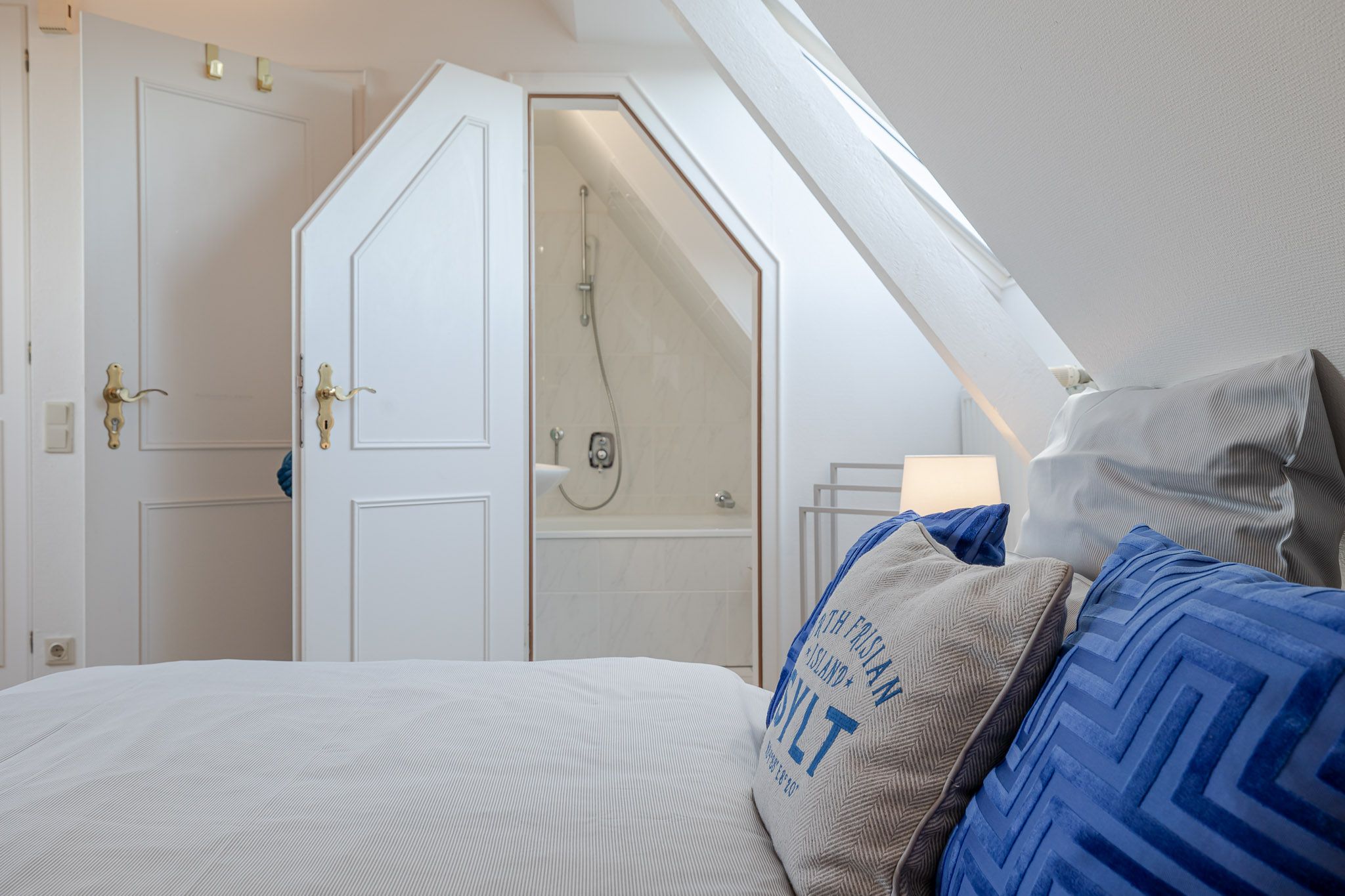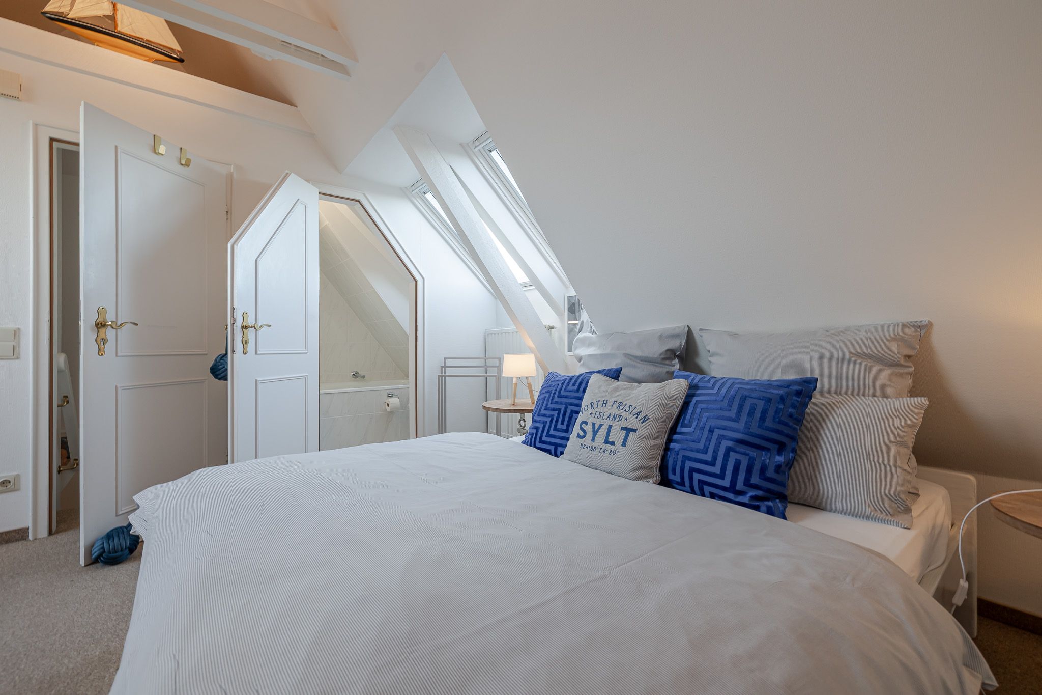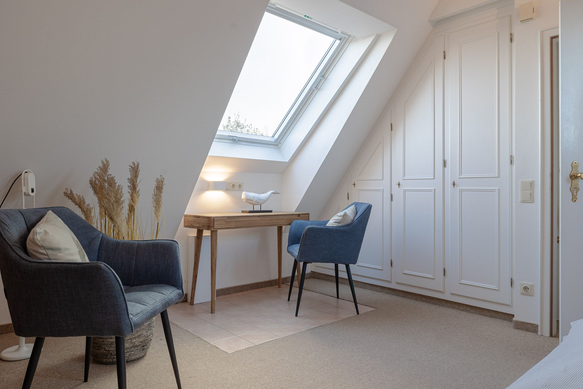 Unter dem Dach eröffnet sich ein weiterer, lichtdurchfluteter Rückzugsort: ein Schlafzimmer mit charmanten Schrägen, ebenfalls mit einem 160x200 cm Bett, viel Stauraum und einem kleinen Arbeitsplatz direkt am Dachfenster, der den Blick in den Himmel freigibt. Ein eigenes Badezimmer mit Badewanne verleiht diesem Bereich eine wohltuend private Note.