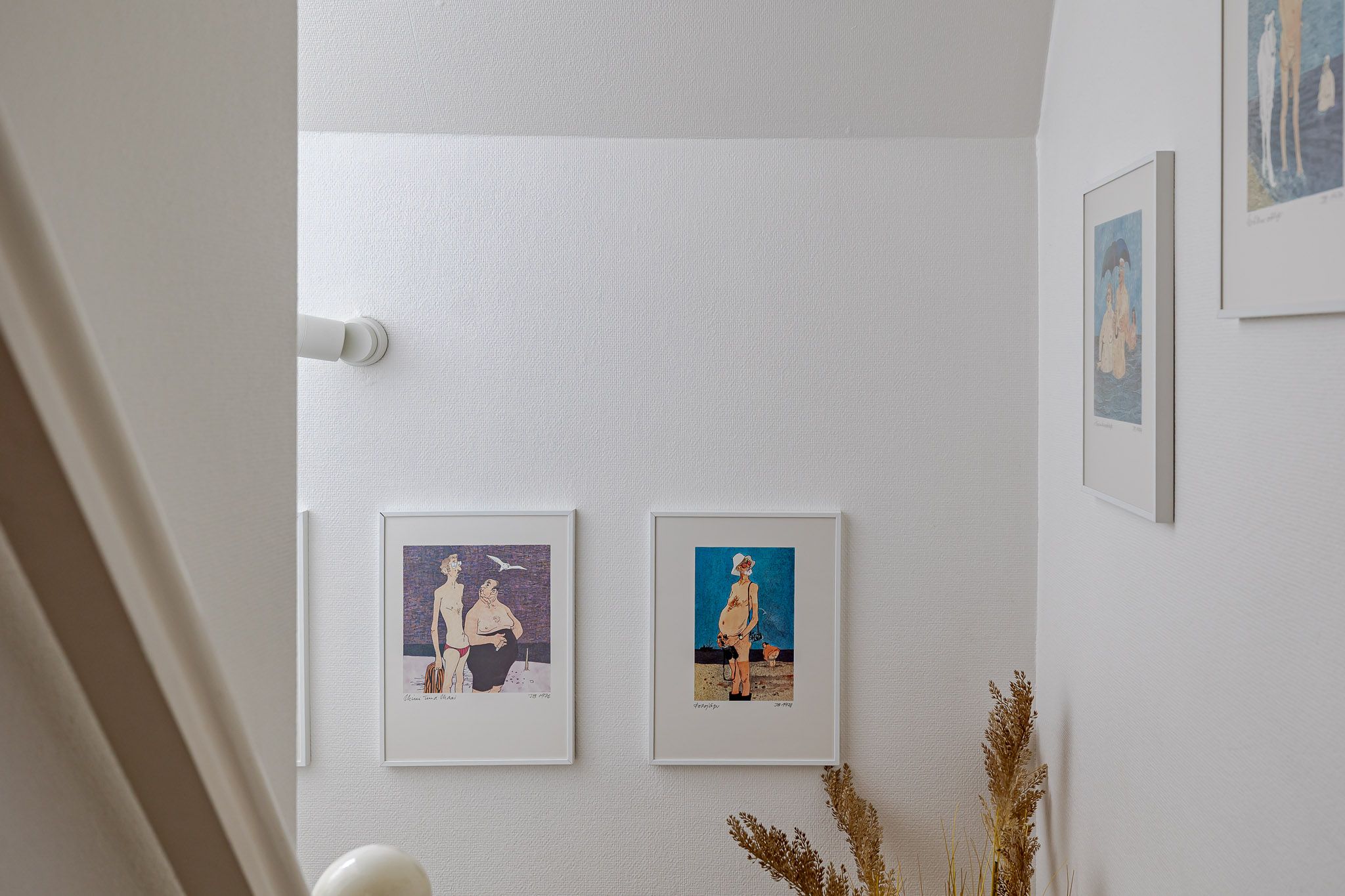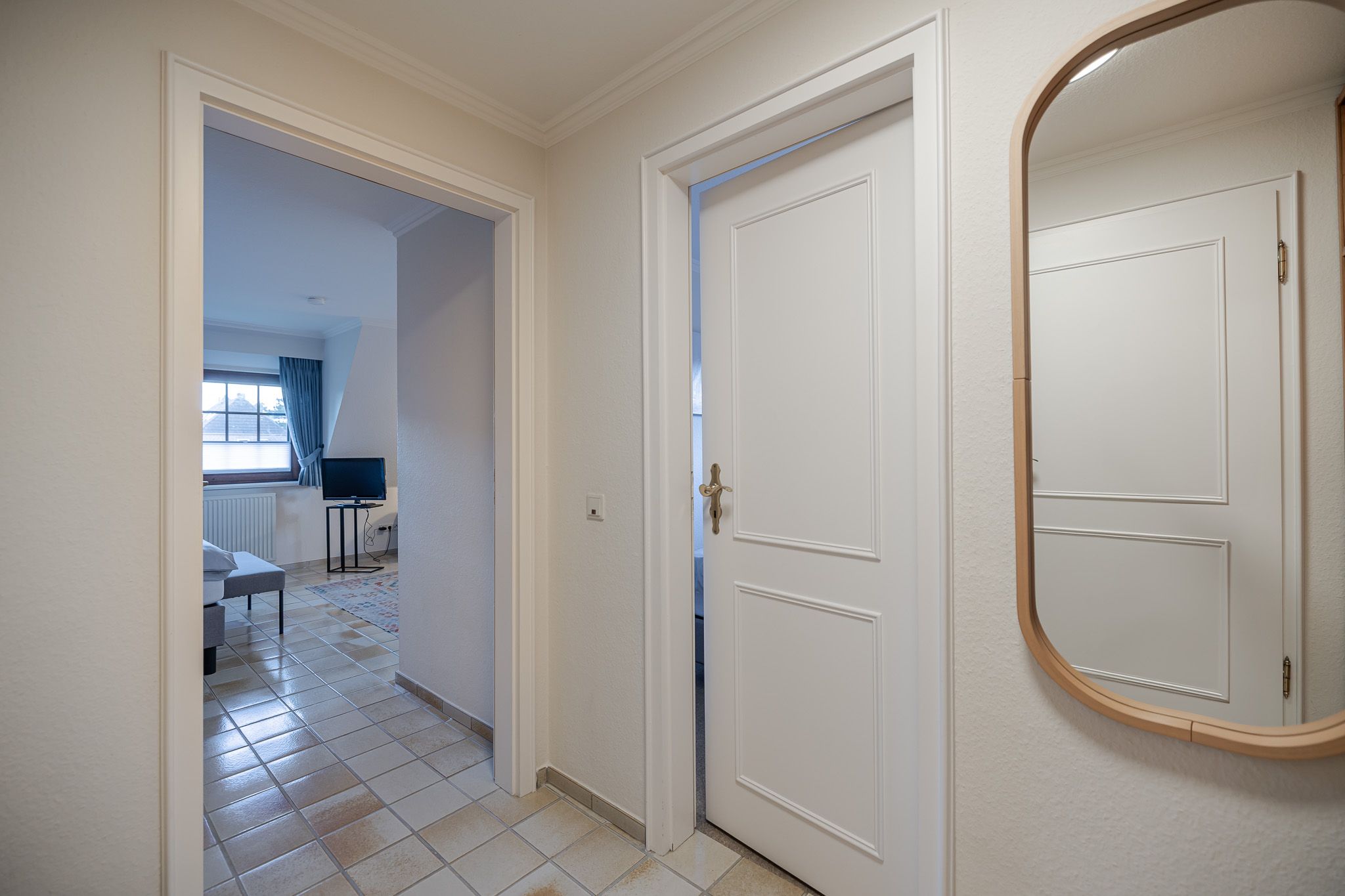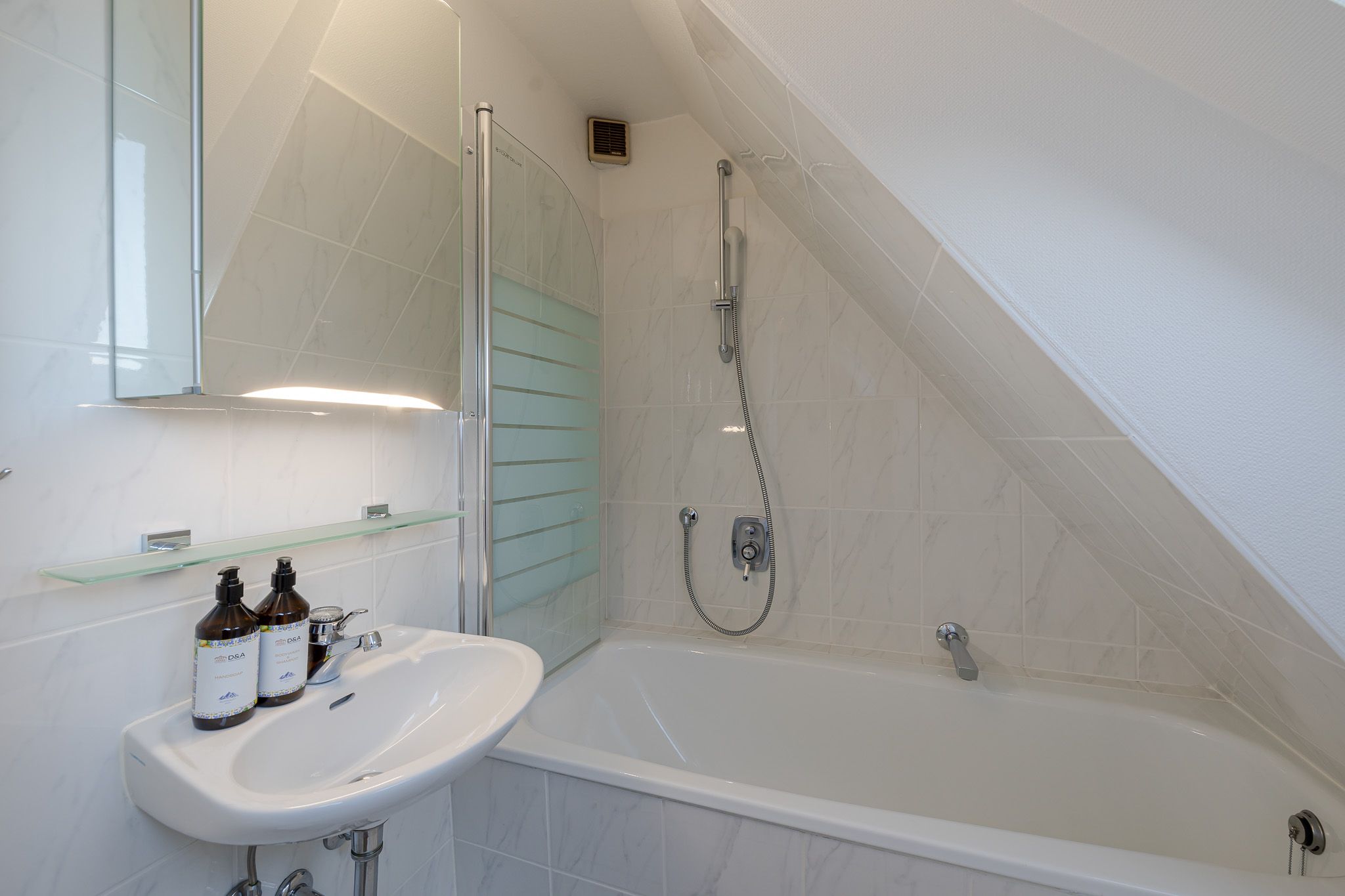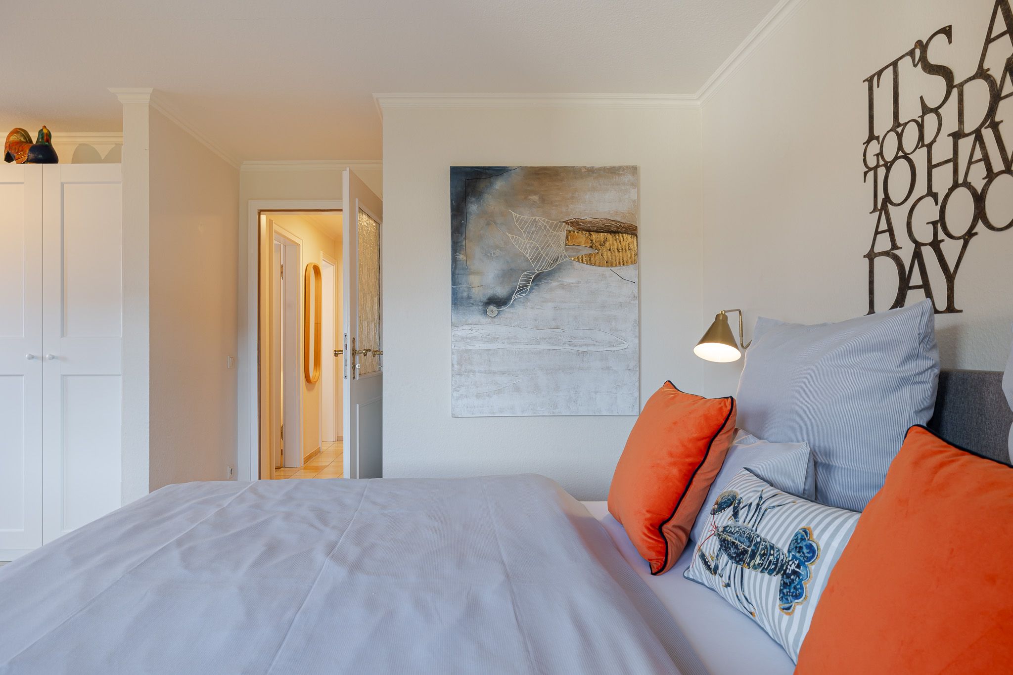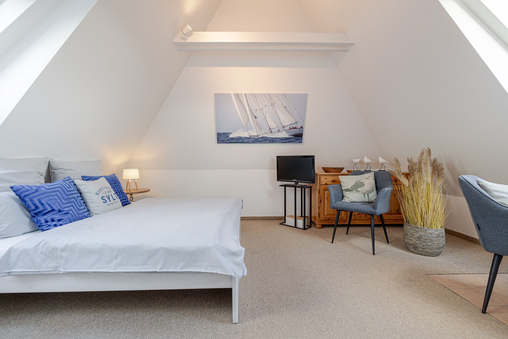 Unter dem Dach eröffnet sich ein weiterer, lichtdurchfluteter Rückzugsort: ein Schlafzimmer mit charmanten Schrägen, ebenfalls mit einem 160x200 cm Bett, viel Stauraum und einem kleinen Arbeitsplatz direkt am Dachfenster, der den Blick in den Himmel freigibt. Ein eigenes Badezimmer mit Badewanne verleiht diesem Bereich eine wohltuend private Note.