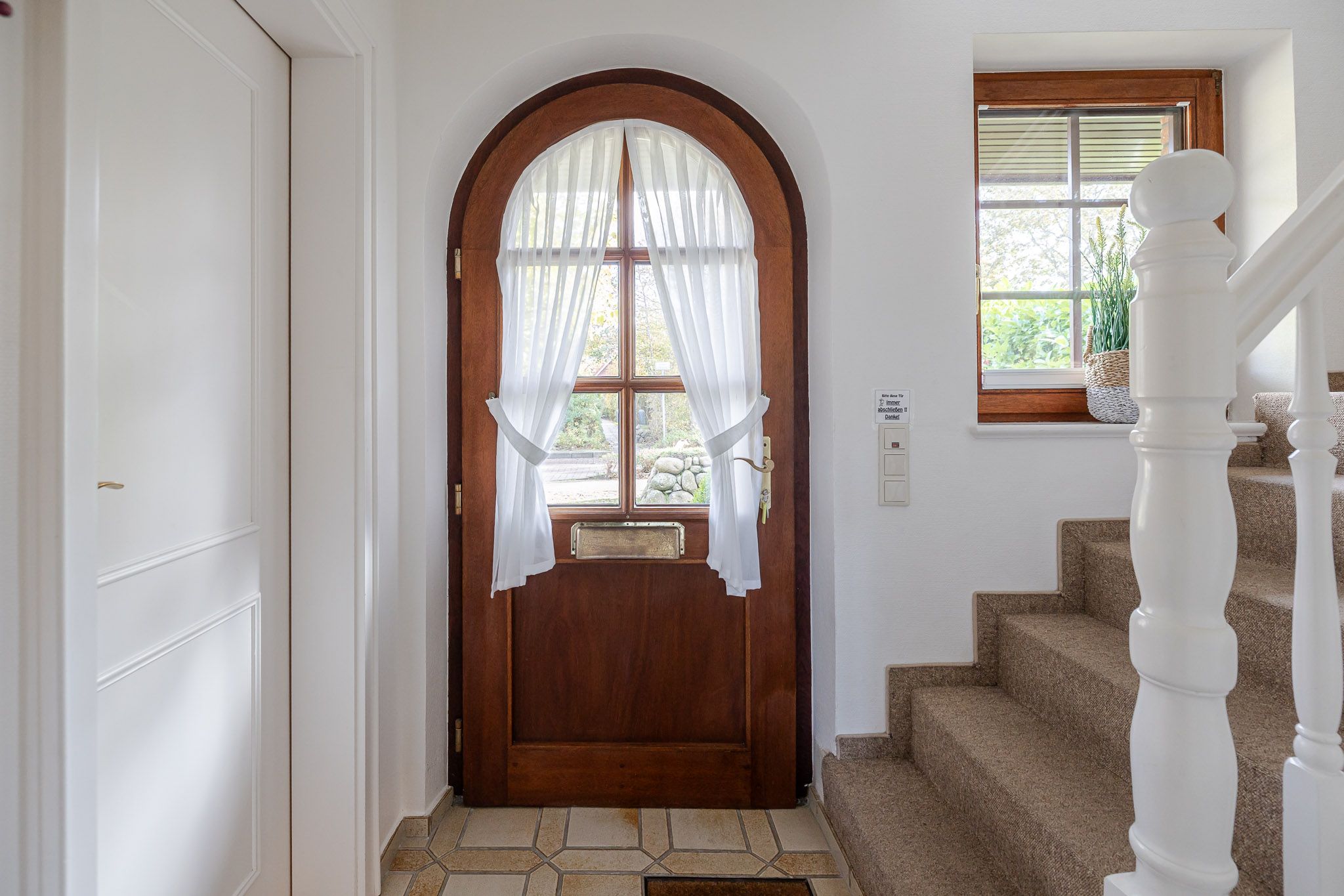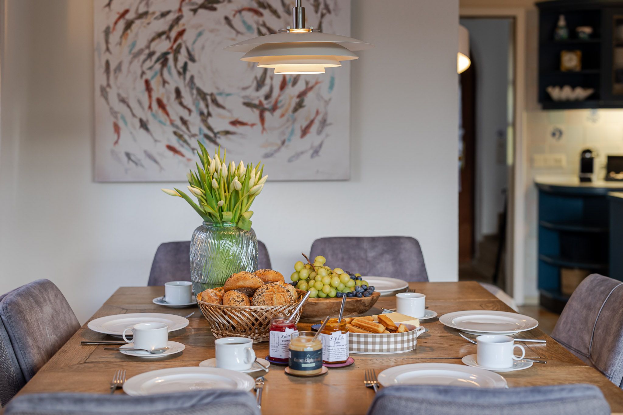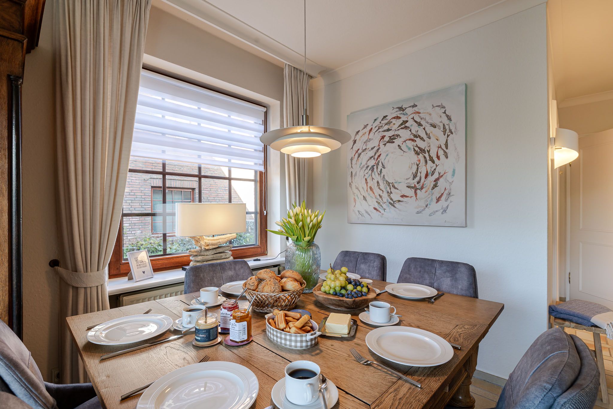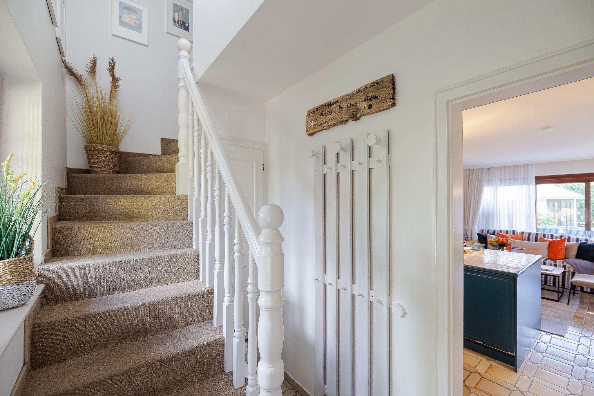 Schon im Erdgeschoss zeigt sich, warum dieses Haus den Namen „Friesenherz“ trägt. Der helle Wohn- und Küchenbereich öffnet sich direkt zur Terrasse und dem großzügigen Garten – ein grüner Rückzugsort, der im Sommer zum lebendigen Zentrum des Hauses wird. Frühstück zwischen Rosen, lange Nachmittage im eigenen Strandkorb, Grillabende mit Familie und Freunden oder ein Glas Wein in der Abendsonne: Dieser Außenbereich ist gemacht für Erinnerungen.