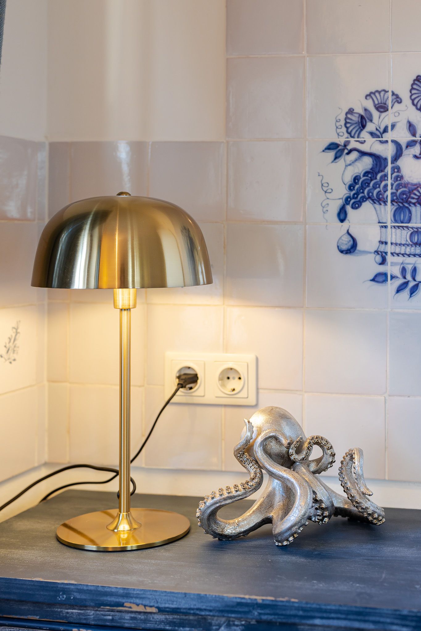 Die wunderschöne Landhausküche in Ozeanblau, die gemütliche Sofaecke und die warmen Farben schaffen innen ein Gefühl von Geborgenheit. Der Kamin ist dekorativ, zaubert aber mit seinen Kerzenlichtern eine stimmungsvolle Atmosphäre – besonders an kühleren Tagen. Auf dieser Ebene befinden sich zudem ein Vollbad sowie ein praktischer Waschraum, ideal für längere Aufenthalte, Strandtage und Reisen mit Kindern oder Hund.