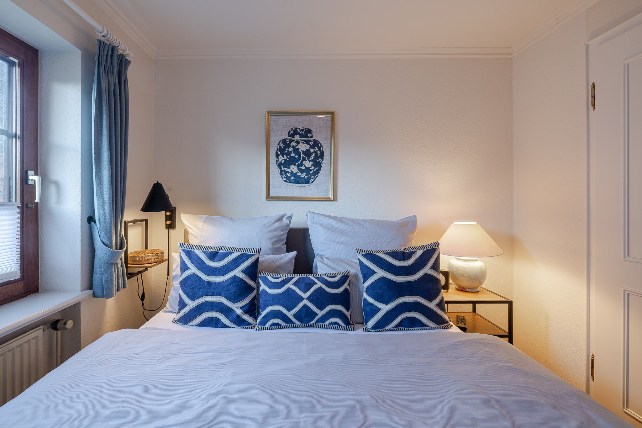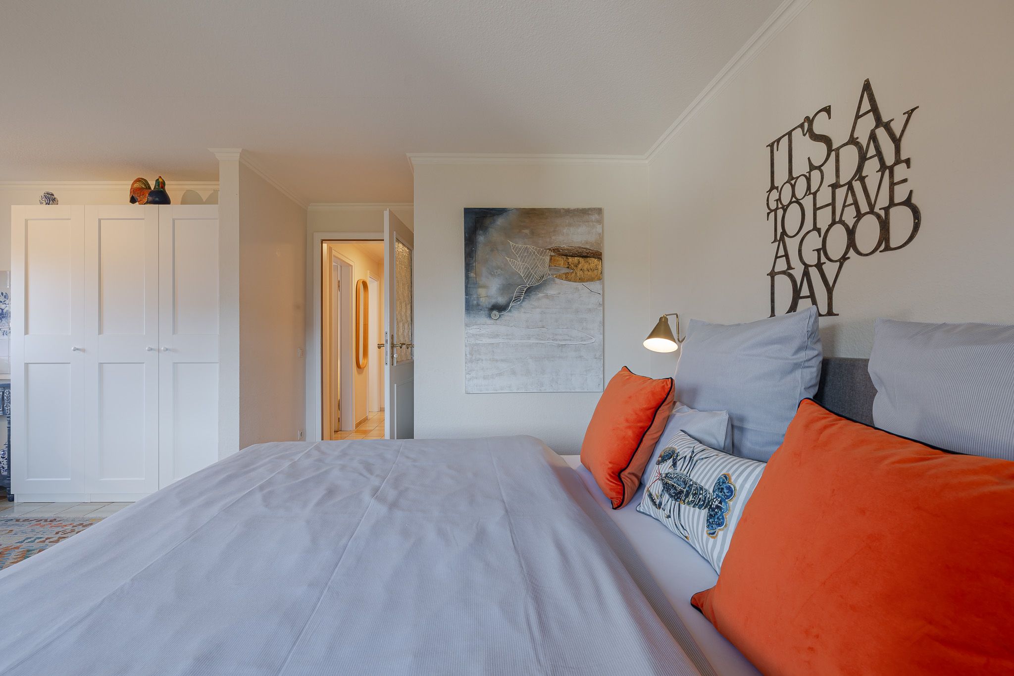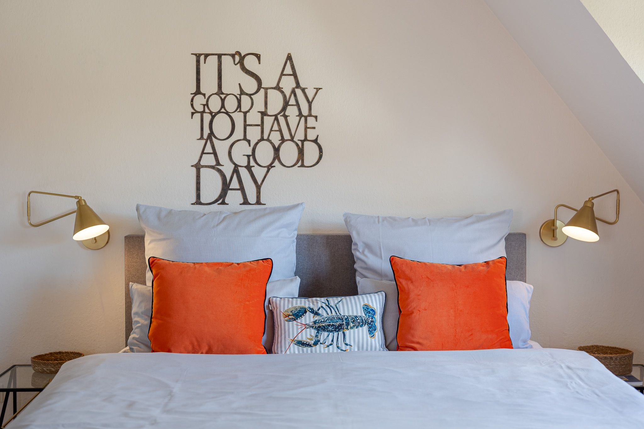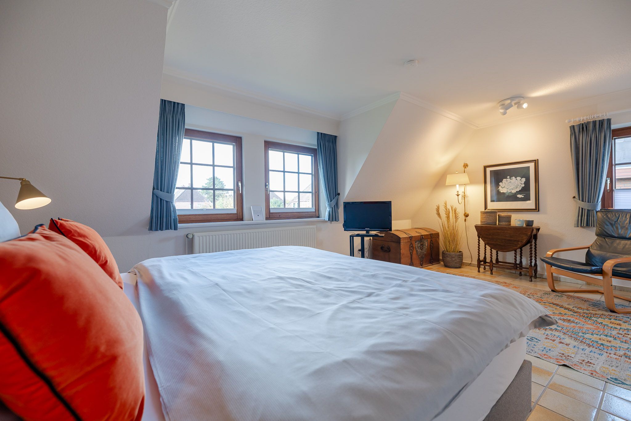 Auf der oberen Etage liegen die Schlafräume, die mit viel Liebe zum Detail gestaltet wurden. Das großzügige Hauptschlafzimmer überzeugt mit seiner freundlichen Ausstrahlung, viel Platz und einem komfortablen Boxspringbett in 180x200 cm, das für erholsame Nächte sorgt. Gleich daneben befindet sich ein kleineres, besonders gemütliches Schlafzimmer mit einem 160x200 cm Bett, maritimen Akzenten und warmen Stoffen – perfekt für Paare, Freunde oder ältere Kinder.