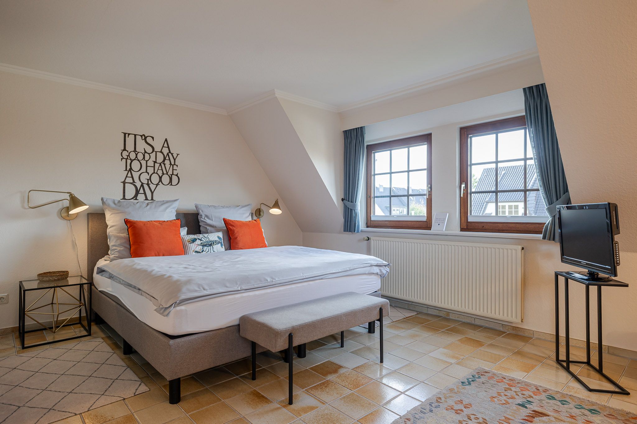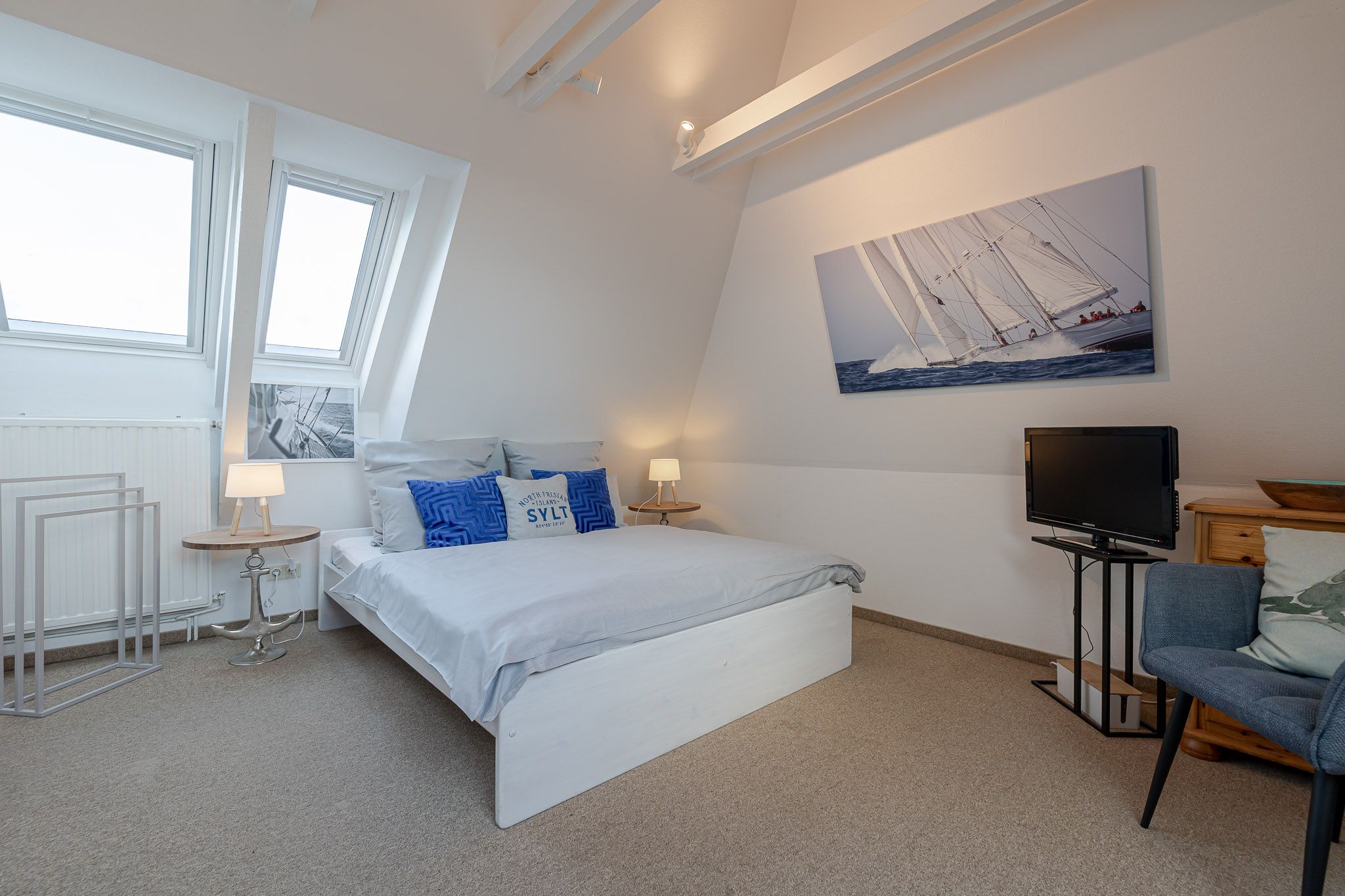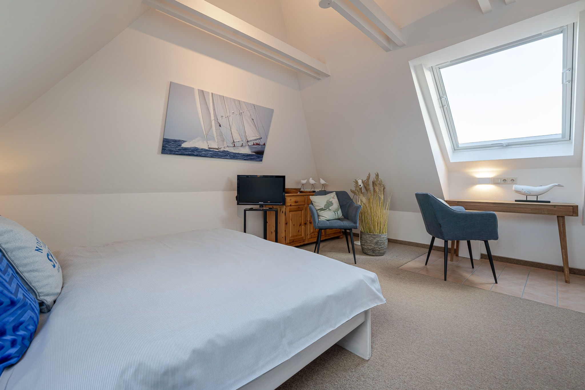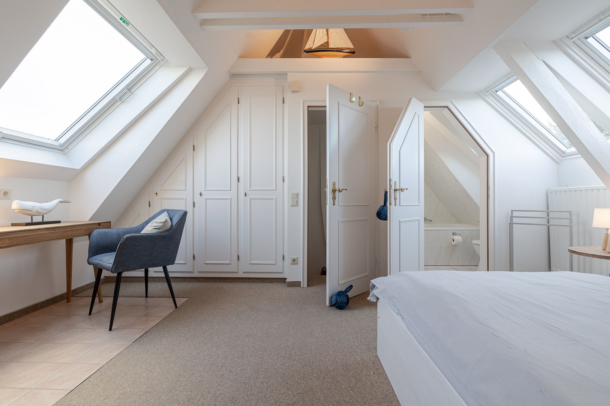 Unter dem Dach eröffnet sich ein weiterer, lichtdurchfluteter Rückzugsort: ein Schlafzimmer mit charmanten Schrägen, ebenfalls mit einem 160x200 cm Bett, viel Stauraum und einem kleinen Arbeitsplatz direkt am Dachfenster, der den Blick in den Himmel freigibt. Ein eigenes Badezimmer mit Badewanne verleiht diesem Bereich eine wohltuend private Note.