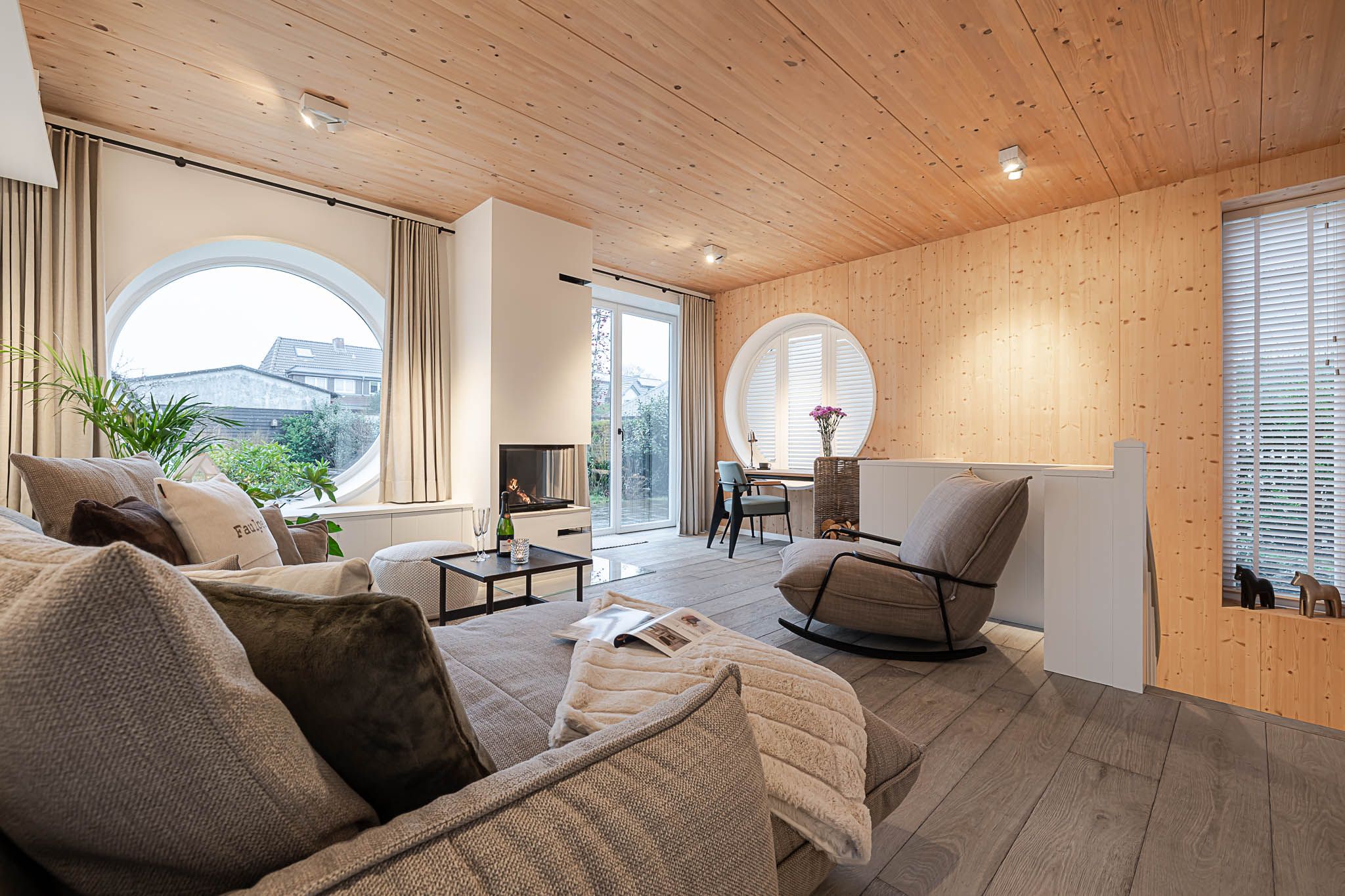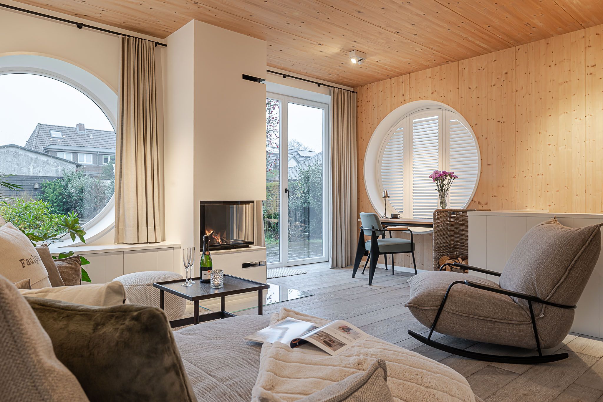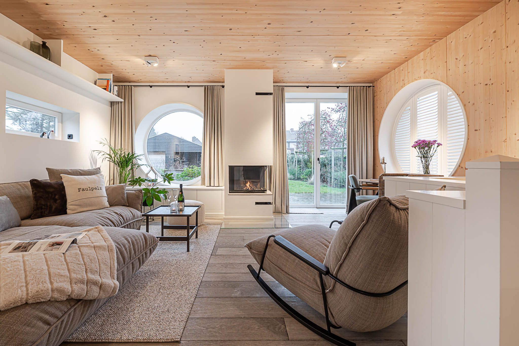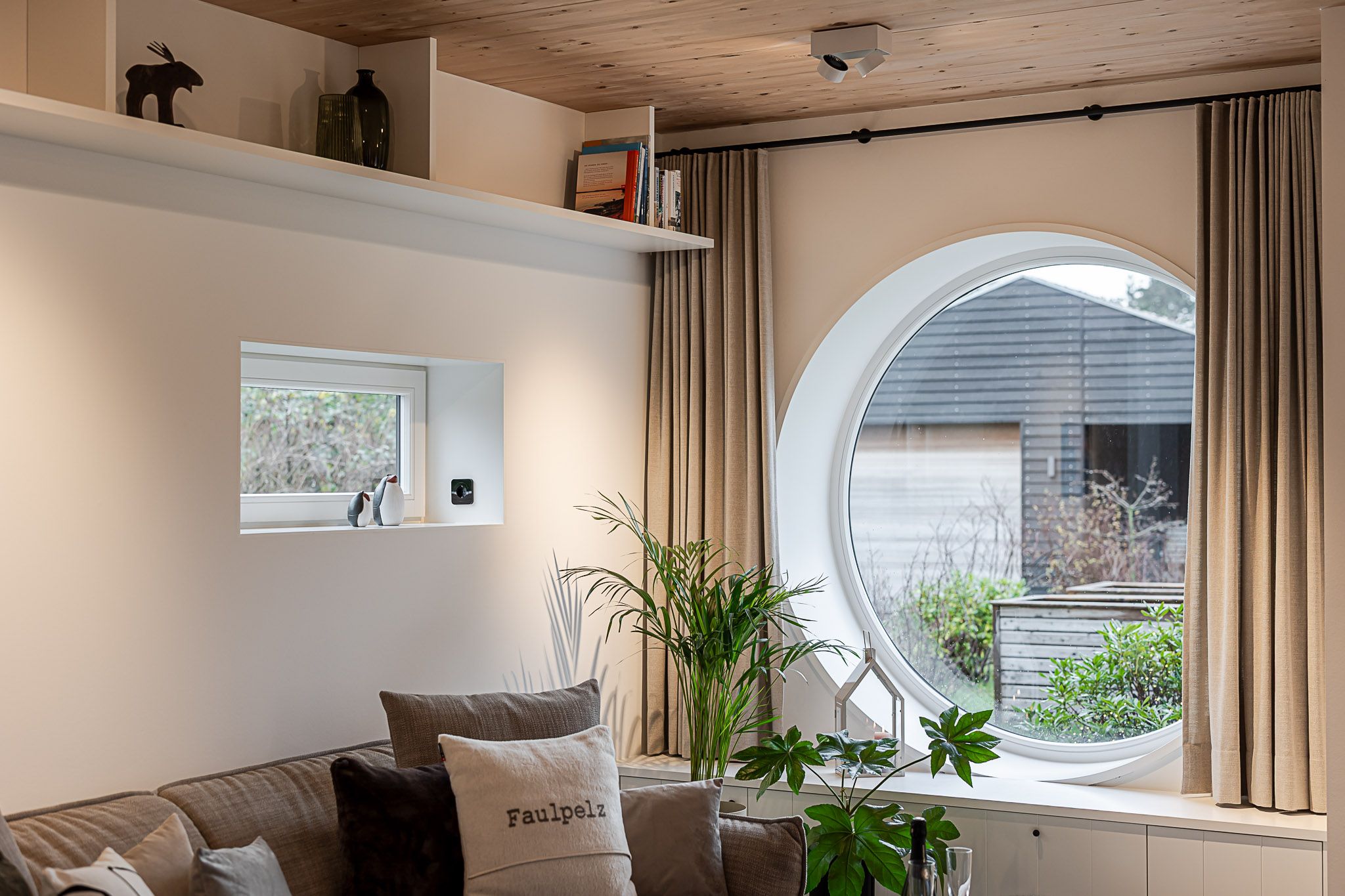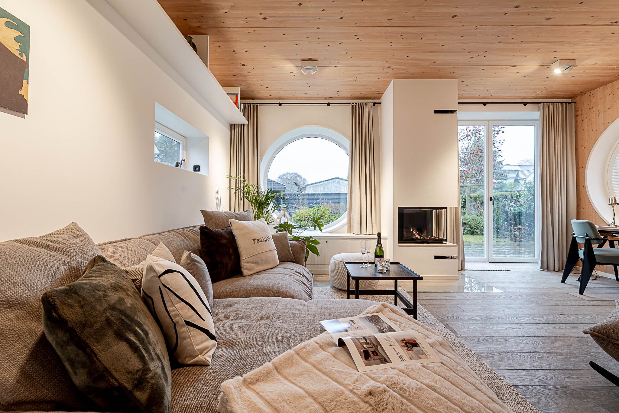 Das „Sylter Strandholz“ besticht durch klare, zeitlose Architektur und hochwertigste Materialien, die eine Atmosphäre der Leichtigkeit und Exklusivität schaffen. Die großzügigen, runden Fenster laden förmlich dazu ein, den Blick auf den liebevoll gepflegten Garten zu genießen und den Tag in harmonischem Licht zu erleben. Der offene Raumfluss im Inneren vermittelt eine unaufdringliche Weite und lässt jeden Moment in diesem Haus zu etwas Besonderem werden.