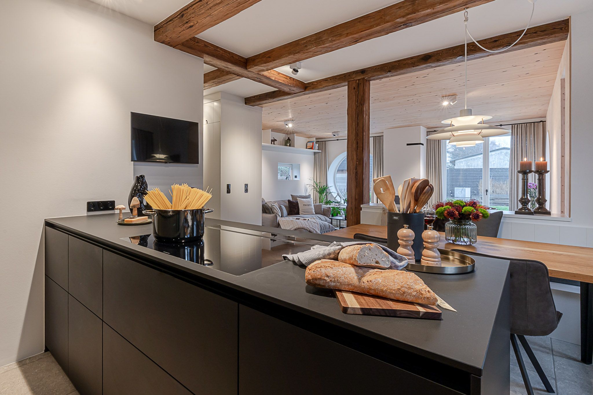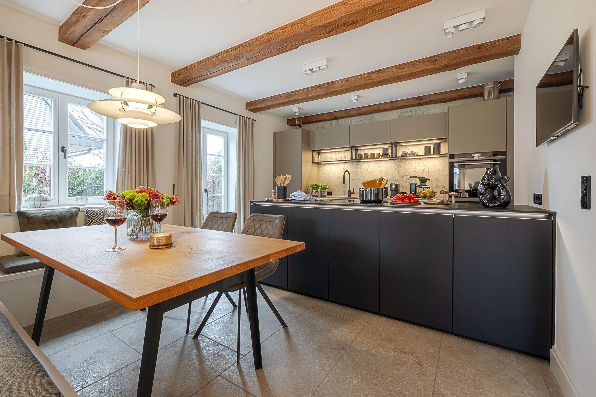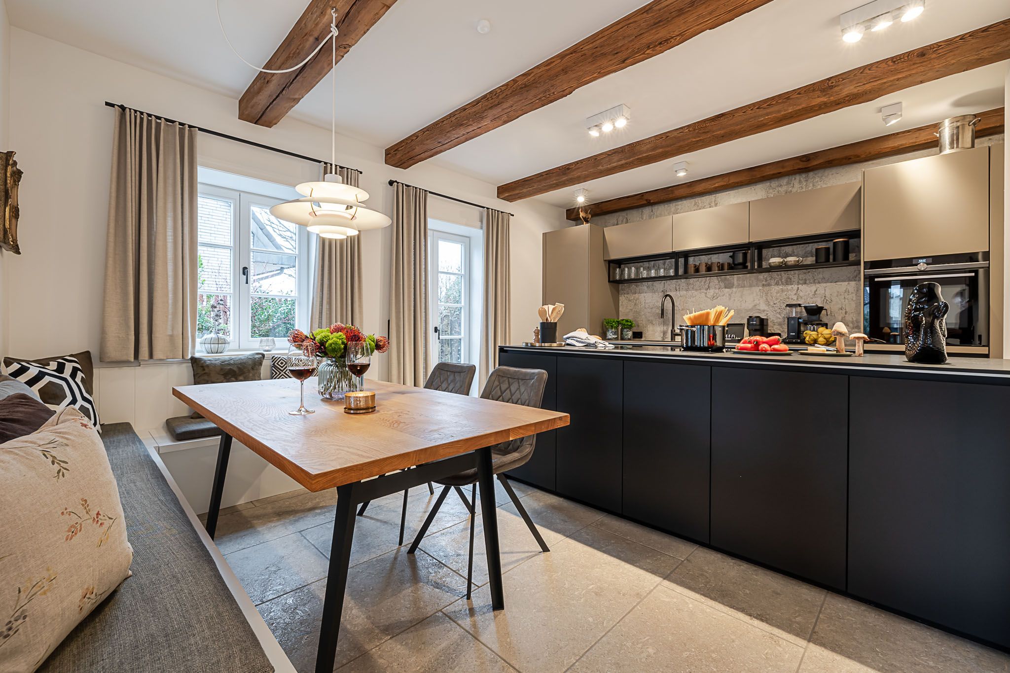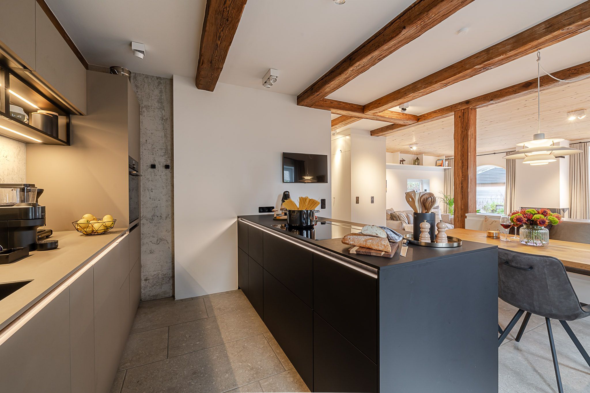 Im Erdgeschoss erwartet Sie ein lichtdurchfluteter Wohn-Essbereich, der mit einem stilvollen Holzkamin ausgestattet ist – perfekt für gemütliche Stunden, in denen die Zeit stillzustehen scheint. Hier können Sie entspannen und die wohlige Wärme genießen, während Sie den Tag ausklingen lassen. Die offene, hochmoderne Küche ist ein wahres Paradies für jeden Hobbykoch, ausgestattet mit besten Siemens-Geräten, darunter ein Backofen mit integrierter Mikrowelle, Induktionskochfeld, Geschirrspüler und ein Kühlschrank mit Gefrierfach – alles, was das Herz begehrt.