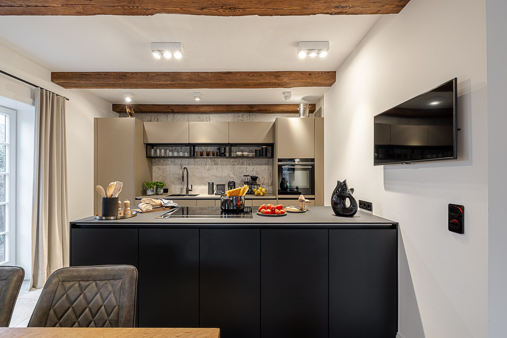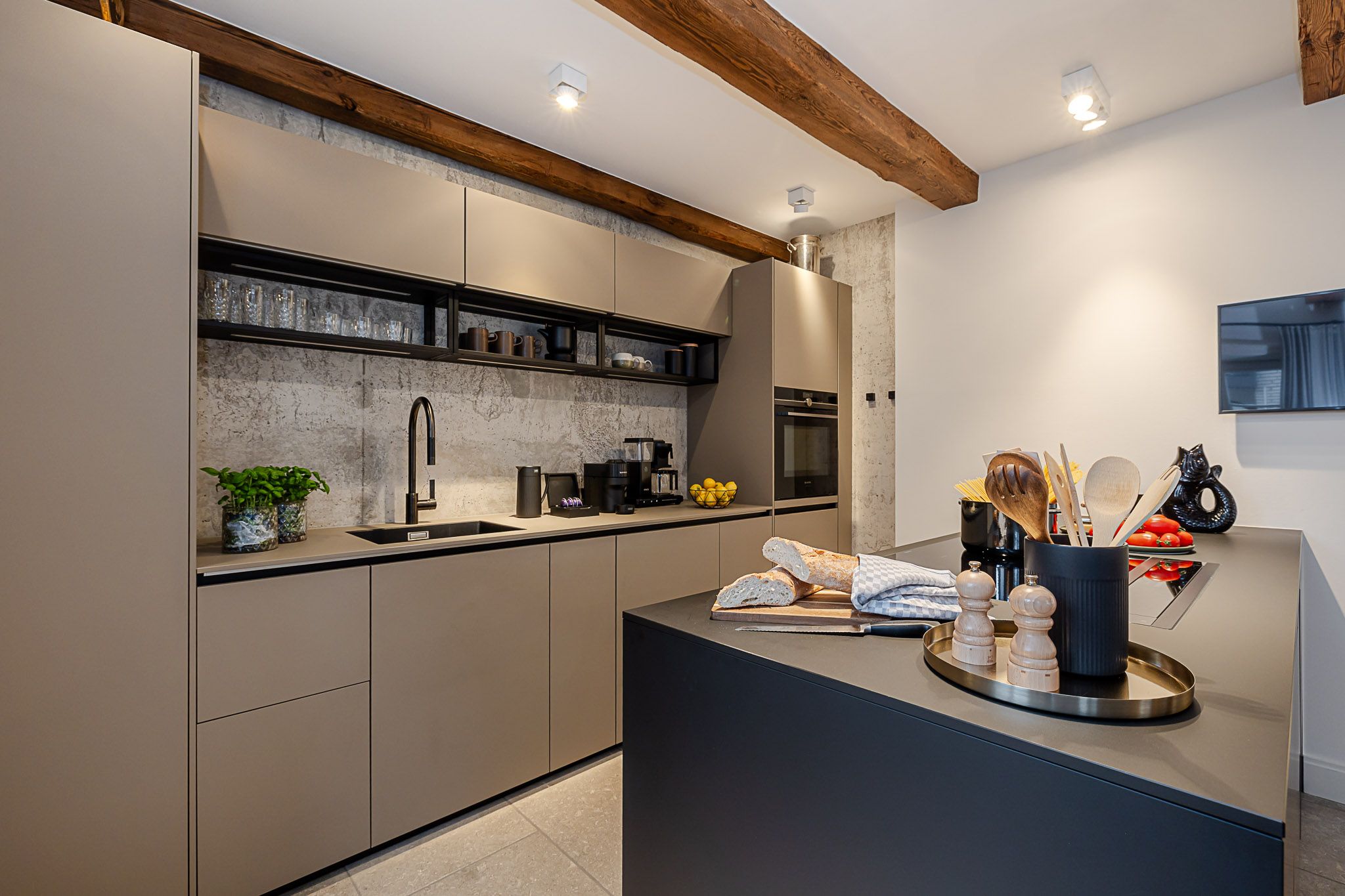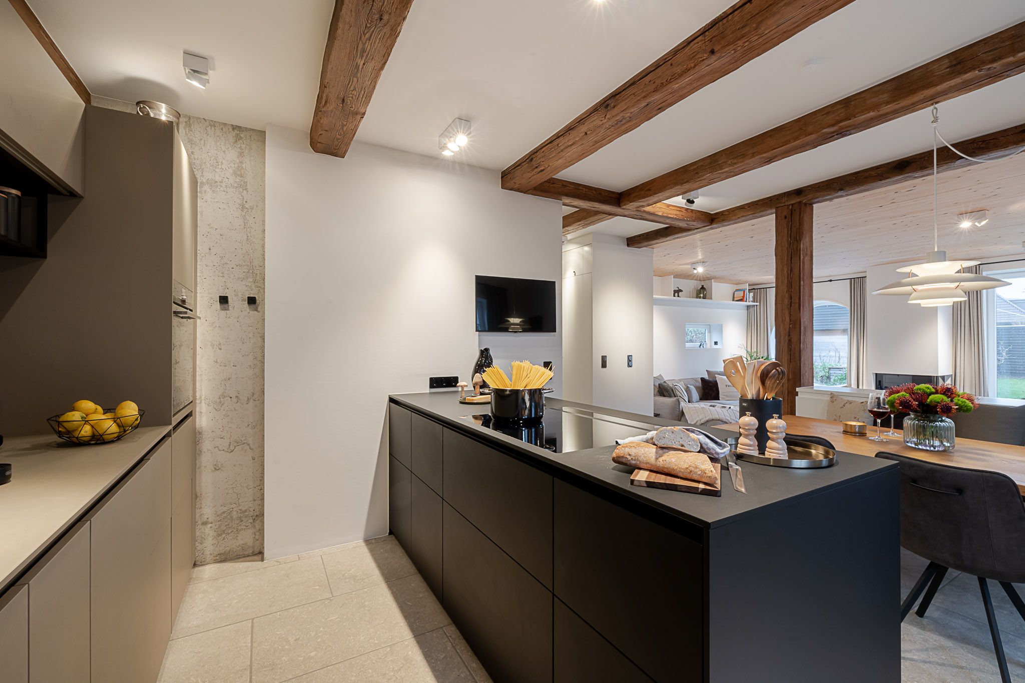 Im Erdgeschoss erwartet Sie ein lichtdurchfluteter Wohn-Essbereich, der mit einem stilvollen Holzkamin ausgestattet ist – perfekt für gemütliche Stunden, in denen die Zeit stillzustehen scheint. Hier können Sie entspannen und die wohlige Wärme genießen, während Sie den Tag ausklingen lassen. Die offene, hochmoderne Küche ist ein wahres Paradies für jeden Hobbykoch, ausgestattet mit besten Siemens-Geräten, darunter ein Backofen mit integrierter Mikrowelle, Induktionskochfeld, Geschirrspüler und ein Kühlschrank mit Gefrierfach – alles, was das Herz begehrt.